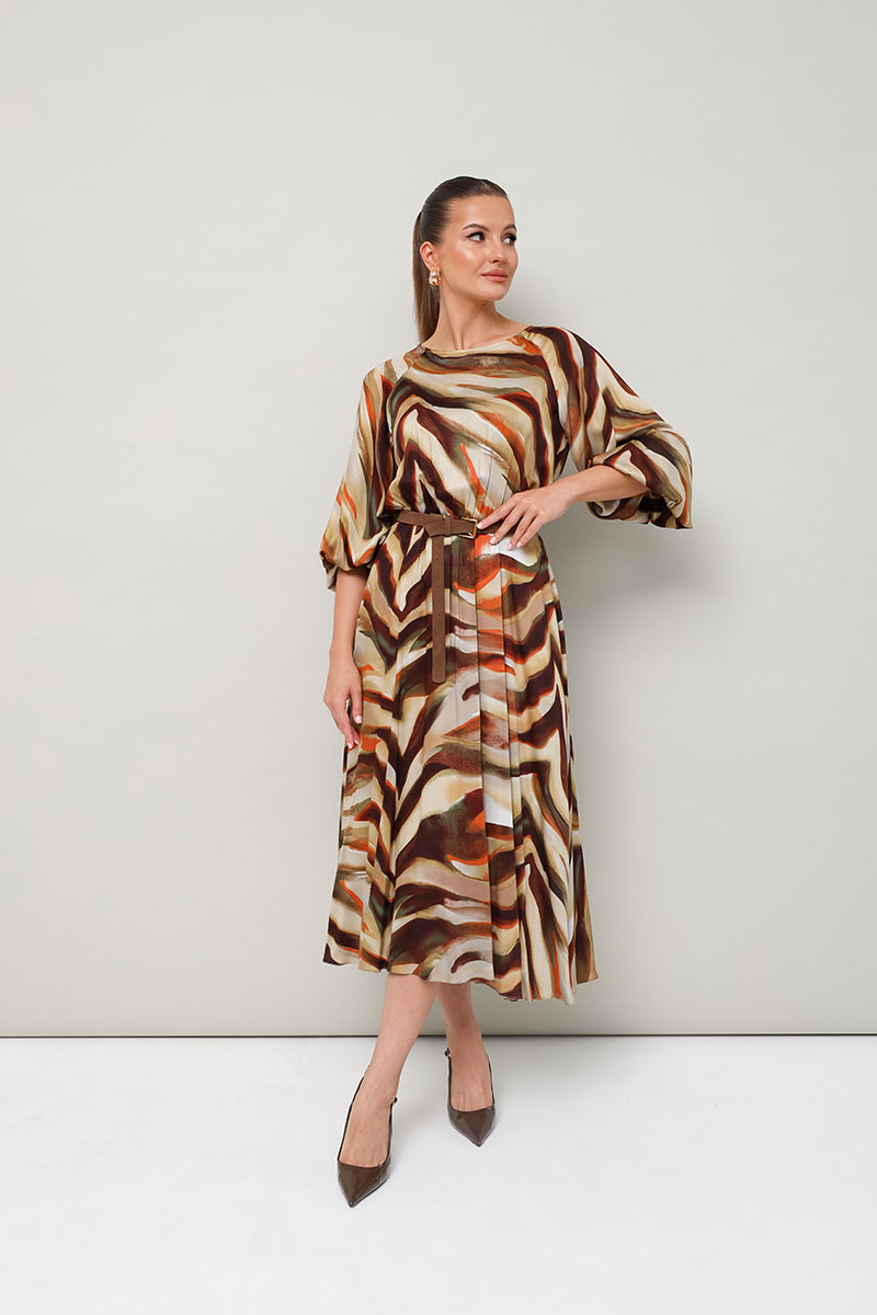 Платье отрезное по линии талии на резинке, выполнено из вискозы с абстрактным принтом. Горловина с окантованным вырезом круглой формы. Рукава-реглан, в длине 3/4 собраны на резинку по низу. По спинке обработан разрез с застежкой в среднем шве на навесную петлю и пуговицу. В комплекте прилагается съемный ремень.