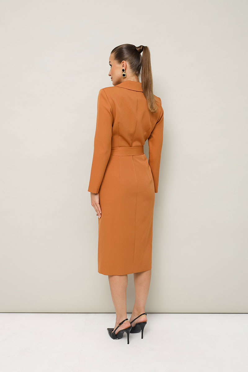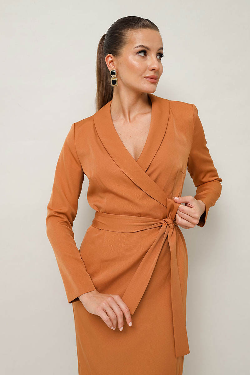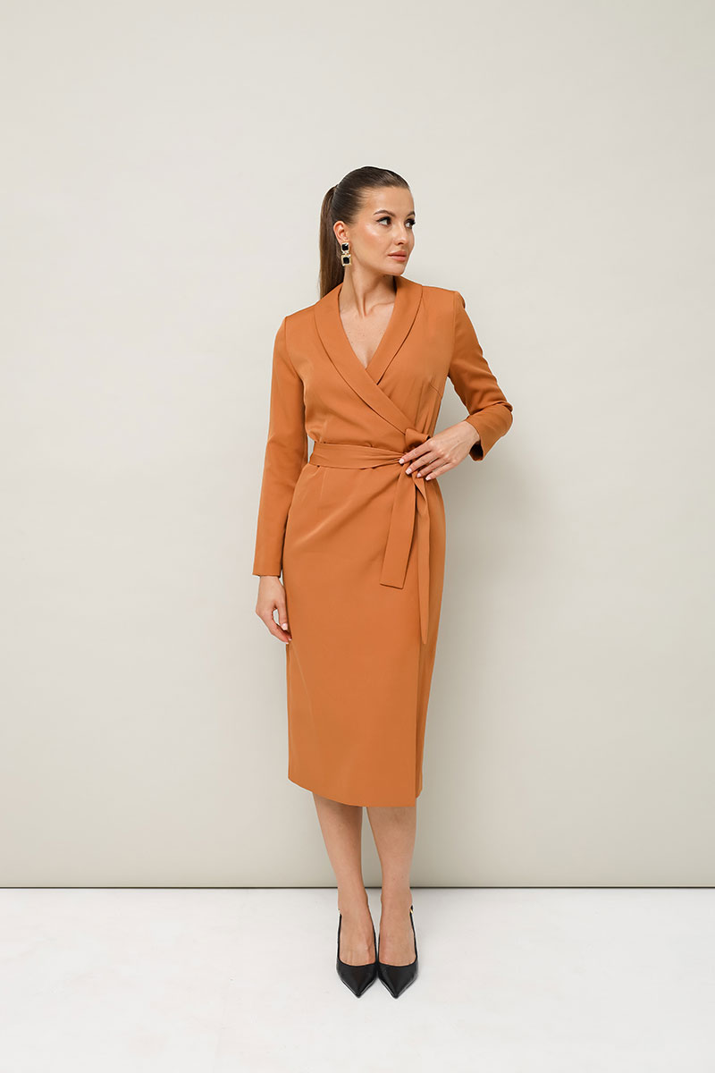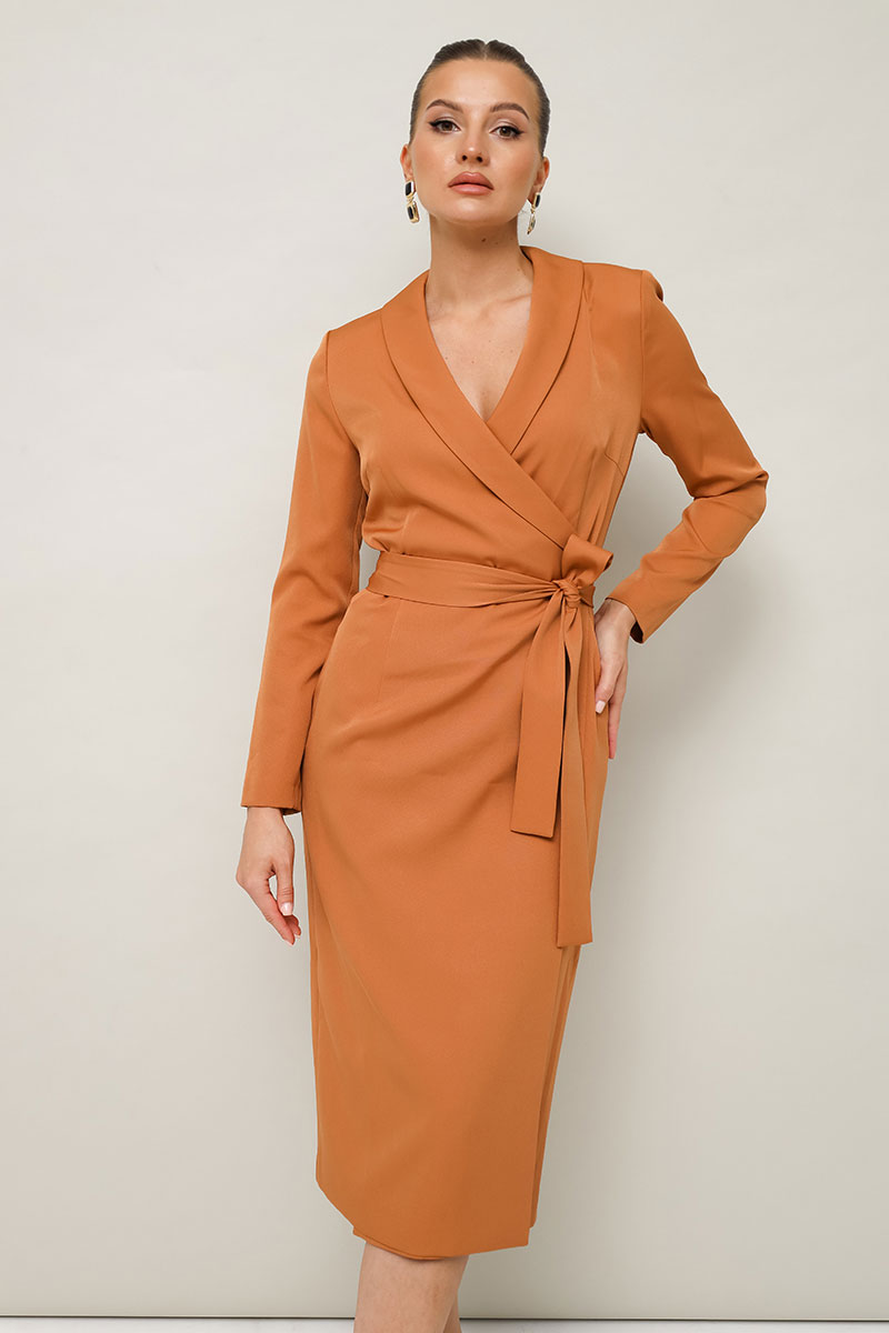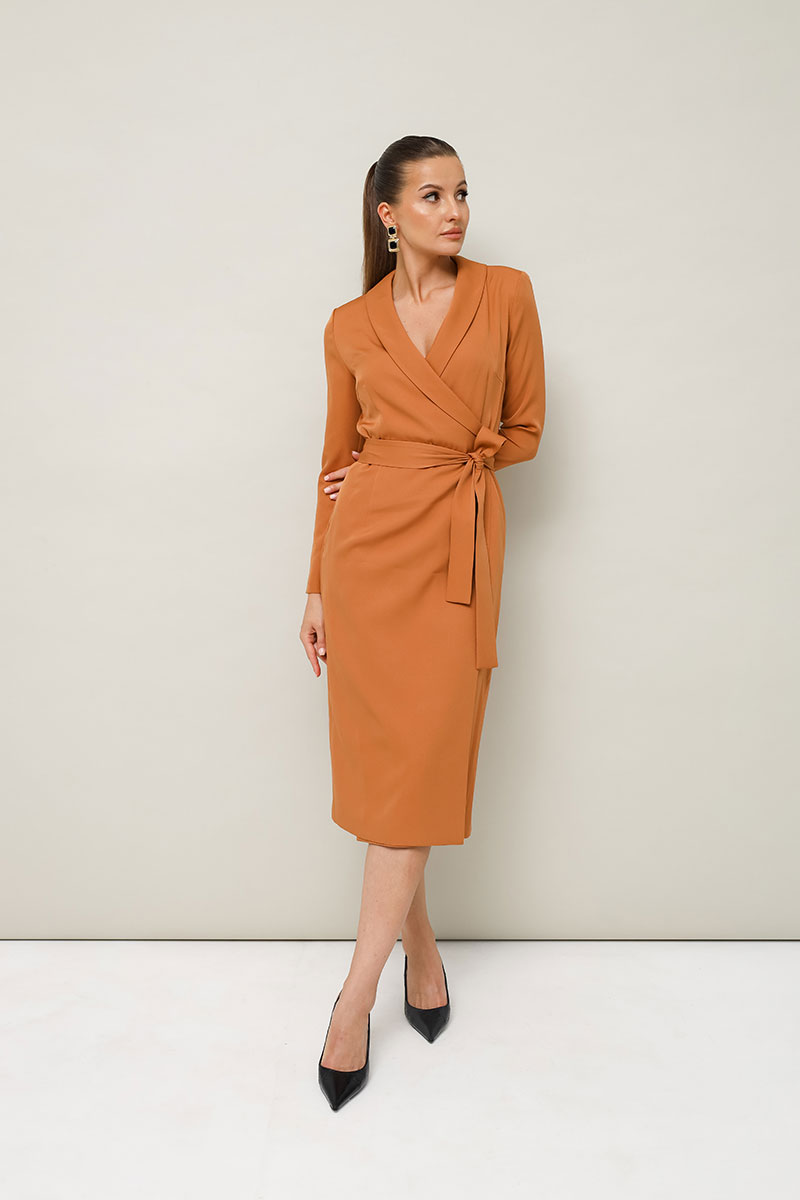 Платье-футляр полуприлегающего силуэта в длине миди, выполнено из костюмно-плательной ткани. Воротник шалевого типа. Застёжка на запах с потайной кнопкой. Рукава длинные втачные. По спинке средний шов. В комплекте прилагается пояс из основной ткани.