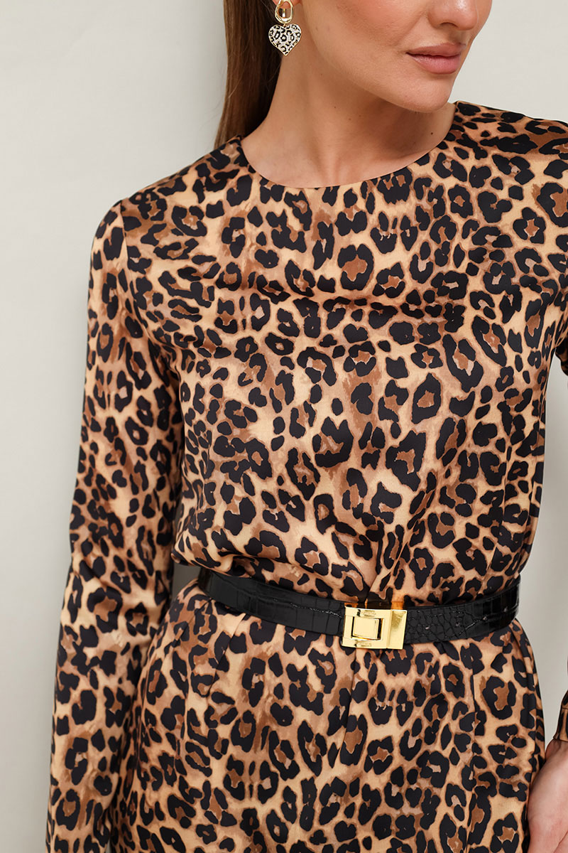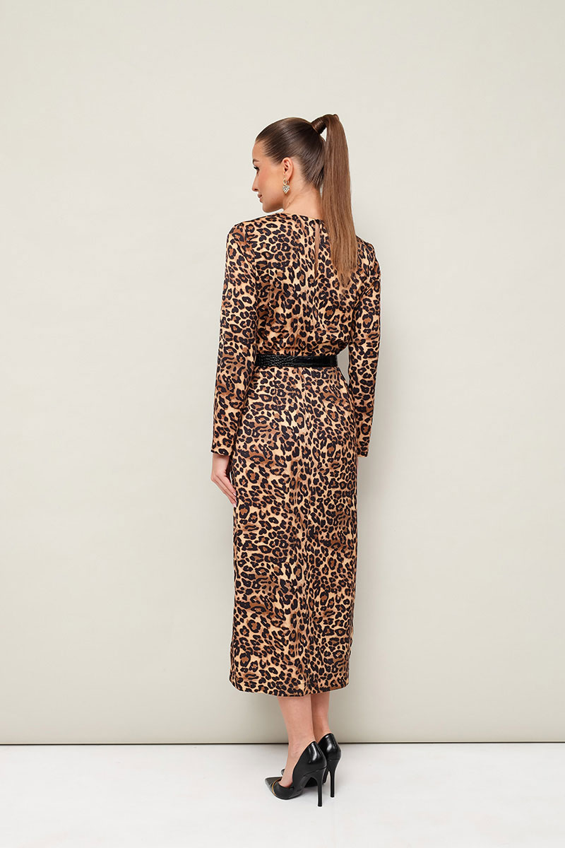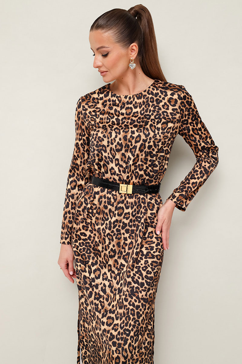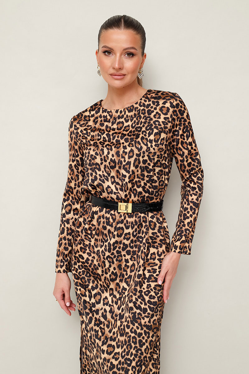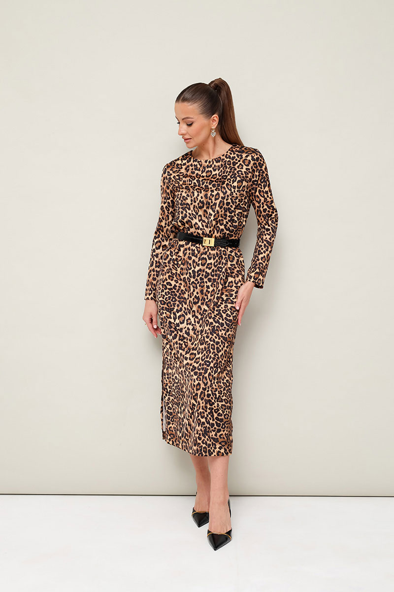 Платье прямого силуэта в длине миди, выполнено из струящейся ткани с благородным матовым блеском и актуальным анималистичным принтом. Округлый вырез горловины. Рукава длинные втачные. Застежка по спинке в среднем шве «капля» на пуговицу и навесную петлю. По низу в боковых швах обработаны высокие разрезы.