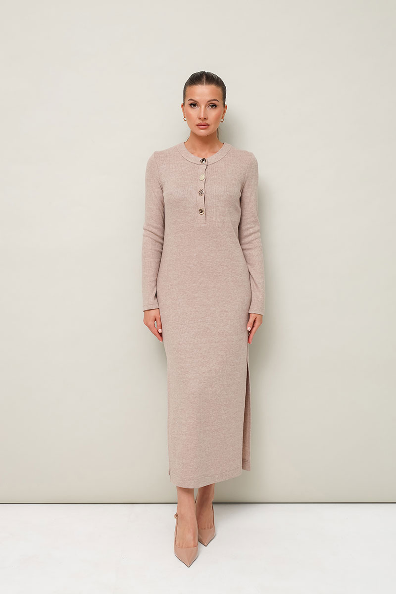 Стильное платье полуприлегающего силуэта, выполнено из трикотажного полотна. Горловина округлой формы, с центральной застежкой на петли и 4 разных пуговицы. Рукава длинные втачные. В боковых швах обработаны высокие разрезы.