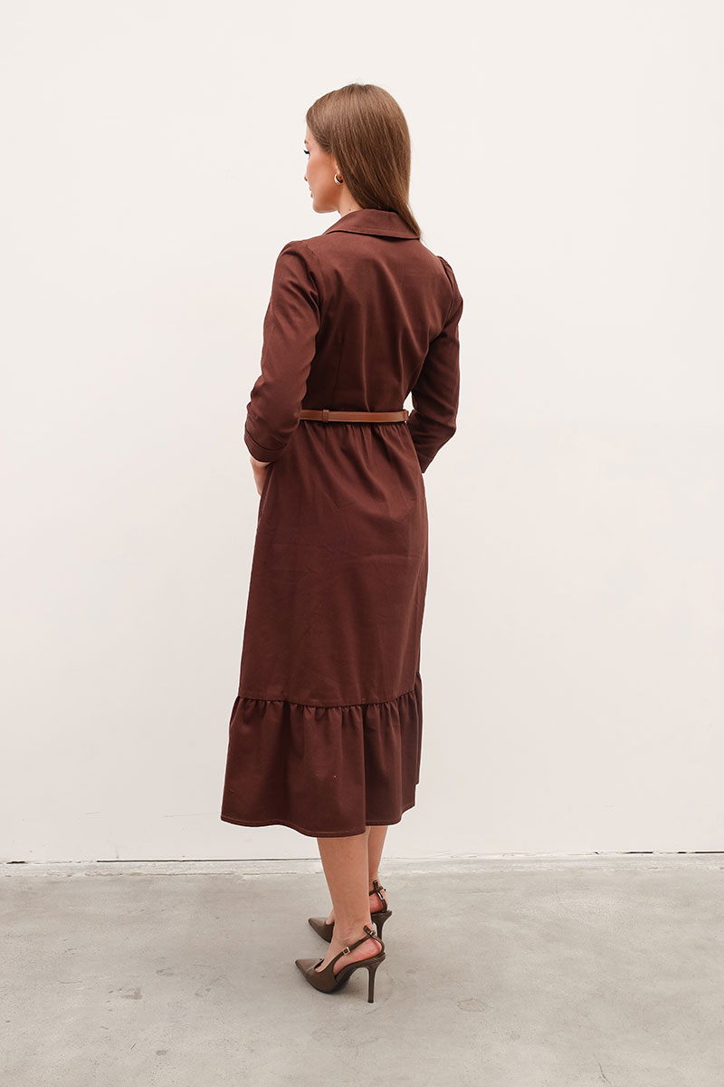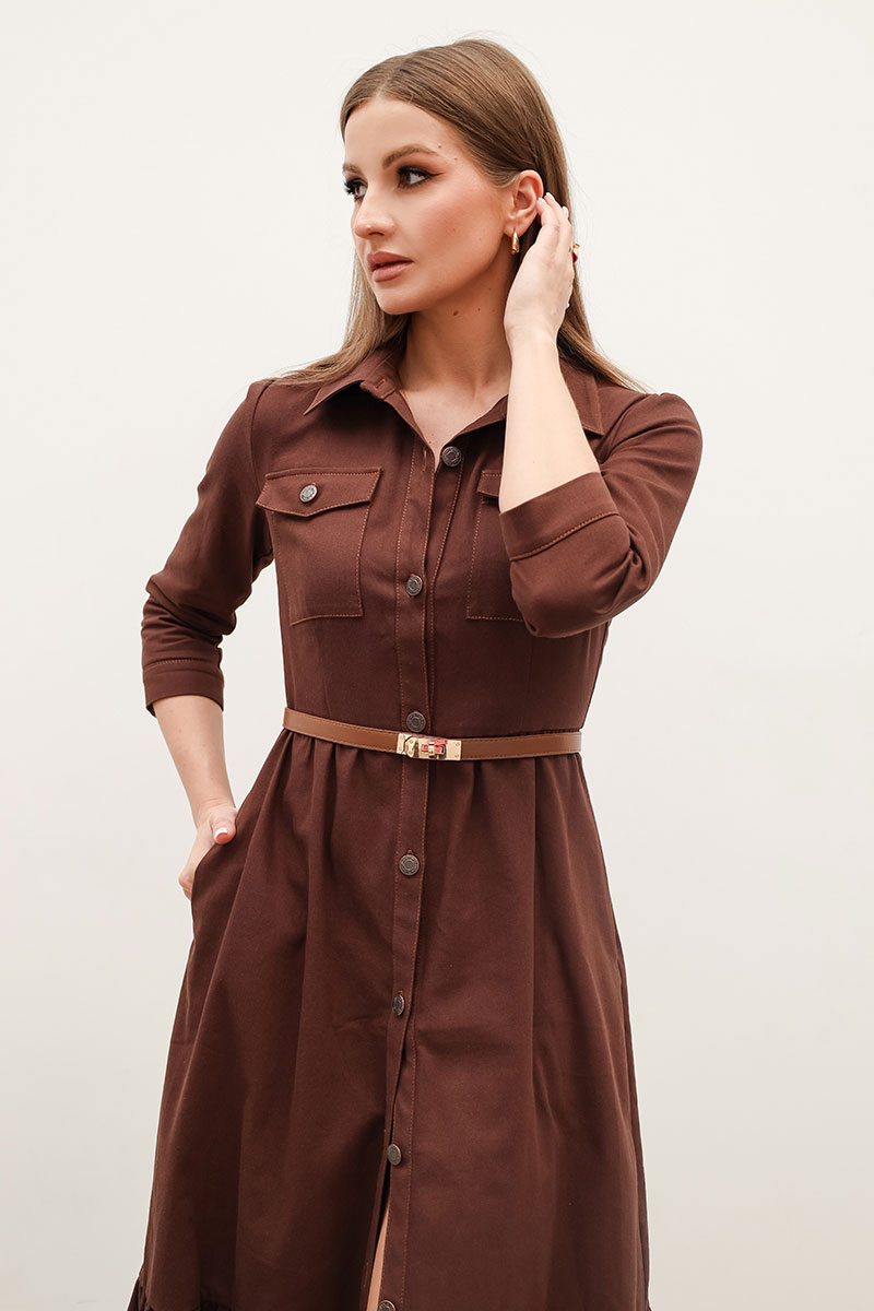 Платье отрезное выше линии талии, выполнено из джинсовой ткани. Горловина с рубашечным воротником на притачной стойке. Центральная застежка на петли и пуговицы. Лиф с накладными карманами с клапанами. Юбка А-образного силуэта, с воланом по низу. Рукава втачные ¾ с притачной манжетой и застежкой на пуговицы. Спинка с талиевыми вытачками. В комплекте прилагается ремень.