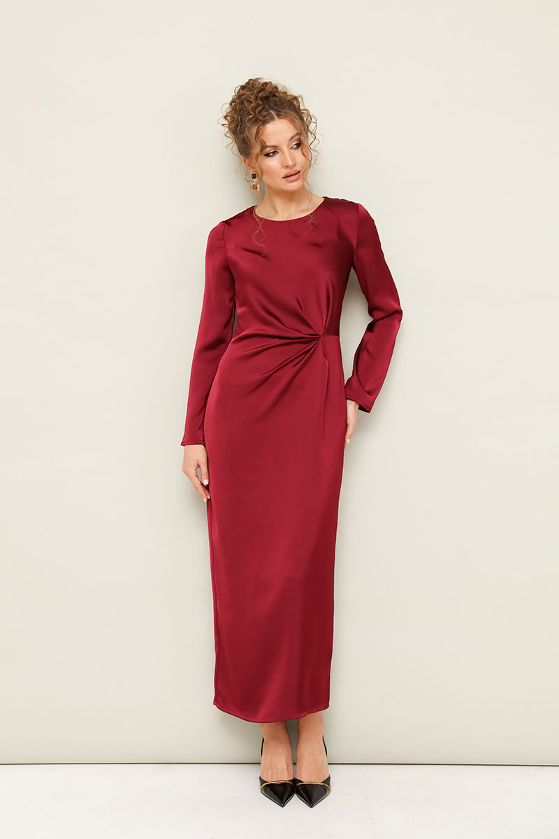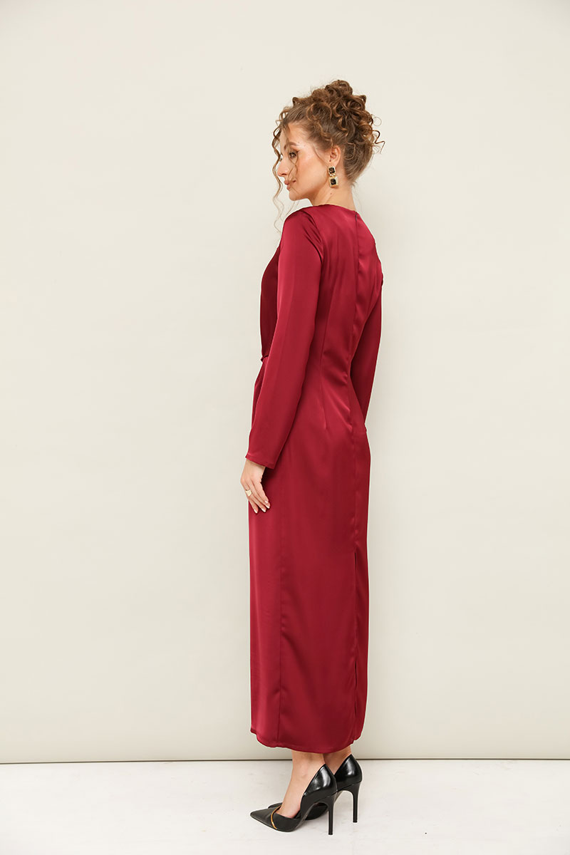 Вечернее платье полуприлегающего силуэта, выполнено из струящейся ткани с благородным матовым блеском. Горловина округлой формы. В области талии заложены складки, плавно переходящие в драпировку. Рукава втачные длинные. Застежка в среднем шве спинки на тесьму молнию. Для удобства движения сзади обработан разрез.