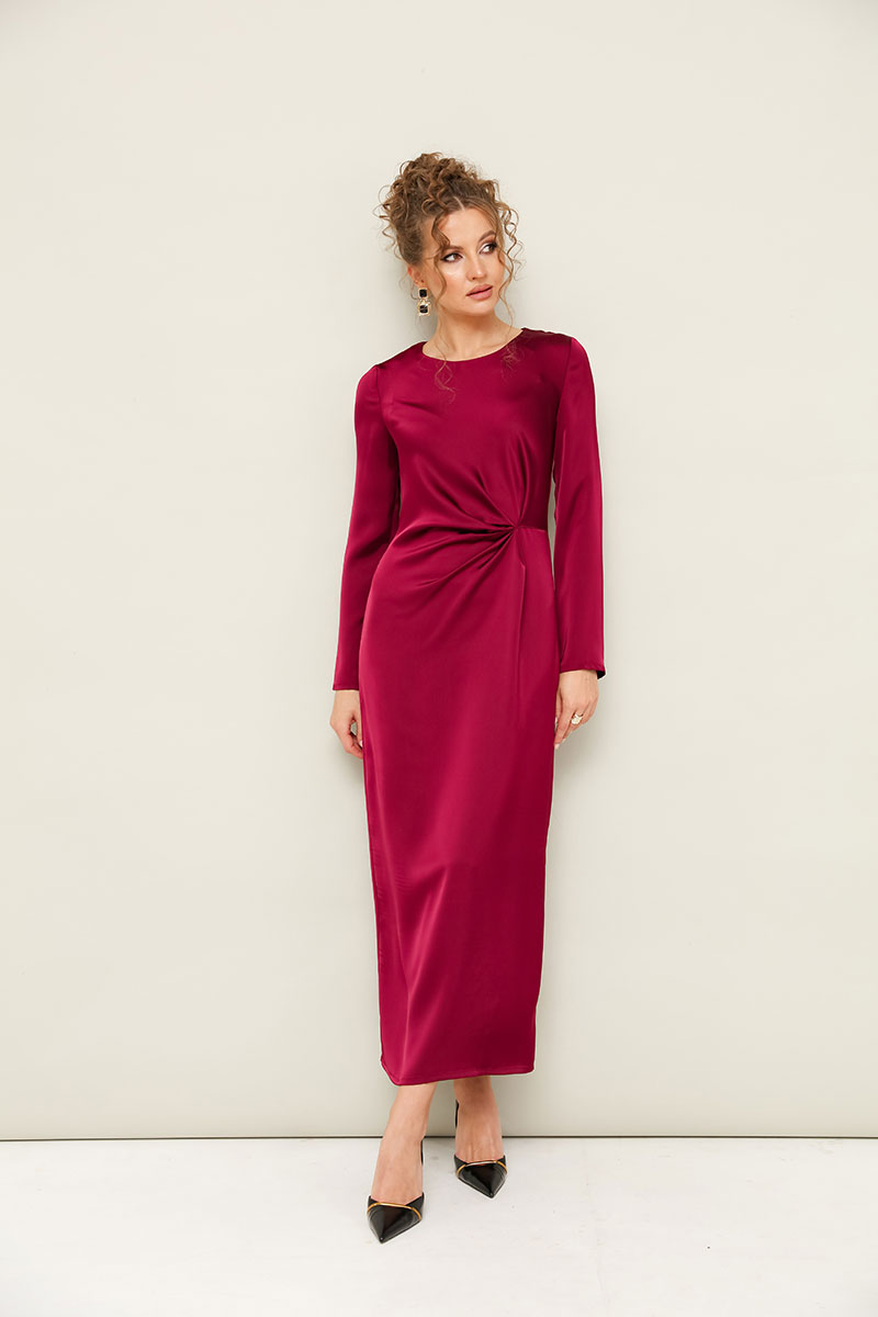 Вечернее платье полуприлегающего силуэта, выполнено из струящейся ткани с благородным матовым блеском. Горловина округлой формы. В области талии заложены складки, плавно переходящие в драпировку. Рукава втачные длинные. Застежка в среднем шве спинки на тесьму молнию. Для удобства движения сзади обработан разрез.