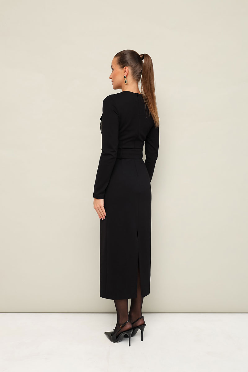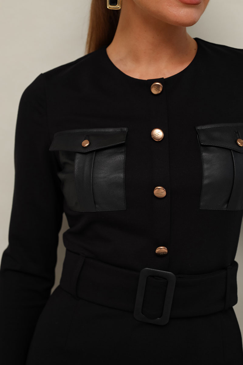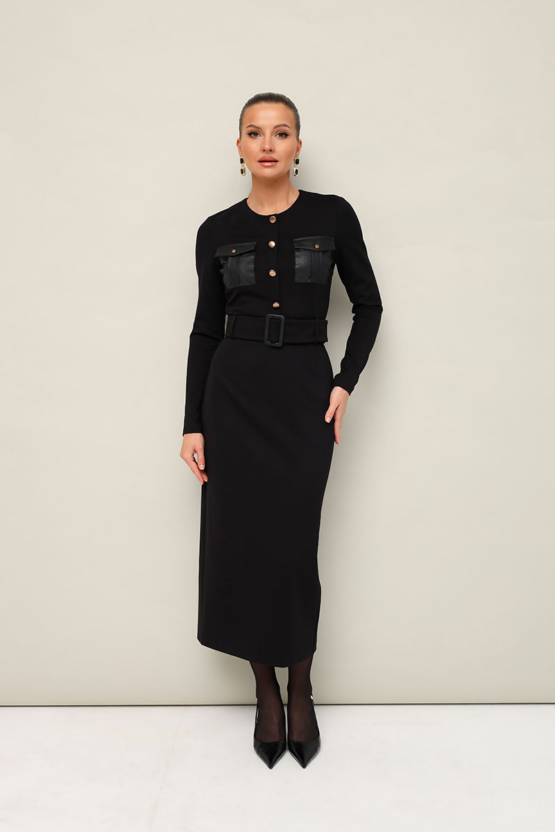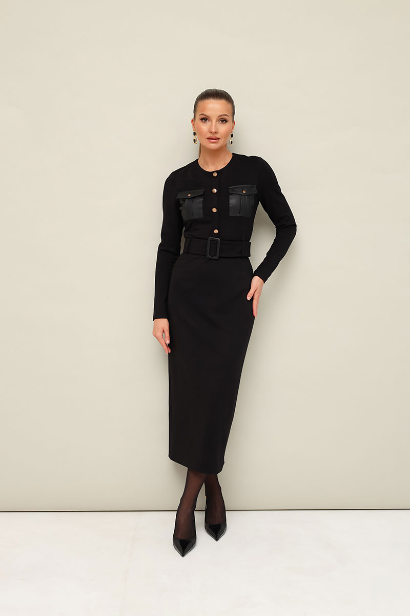 Платье прилегающего силуэта, отрезное по линии талии, выполнено из эластичного трикотажного полотна. Горловина округлой формы. По лифу обработана планка с пуговицами и нагрудные накладные карманы с клапанами. Длинные втачные рукава. Спинка с застежкой на потайную молнию в среднем шве. Для удобства движения сзади обработан разрез.