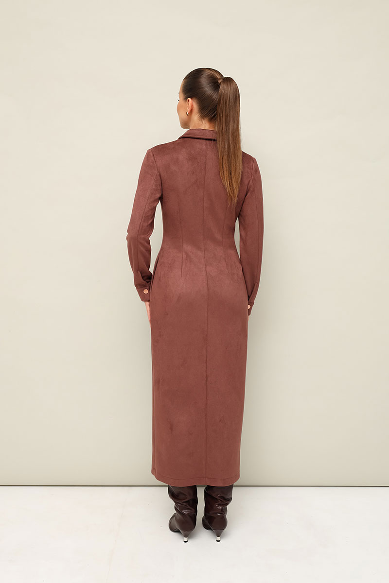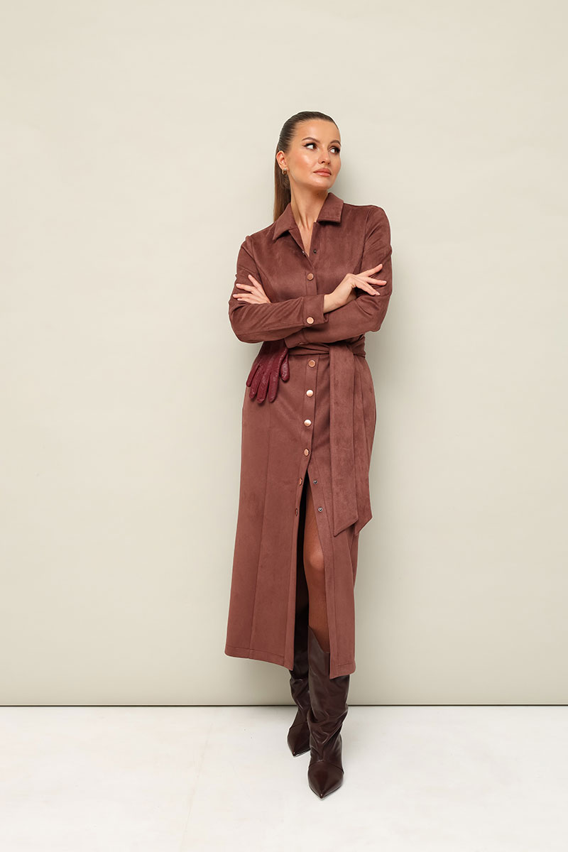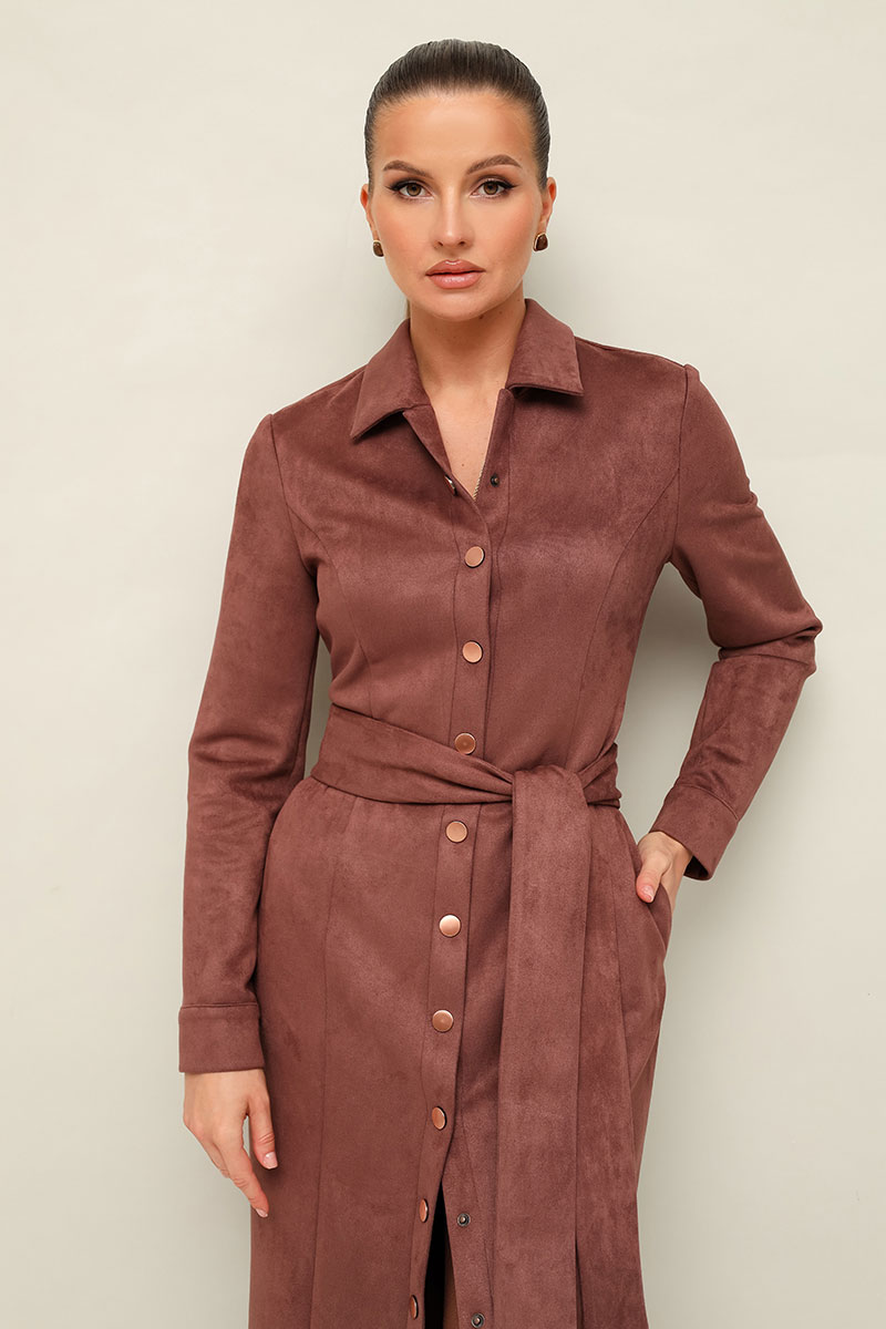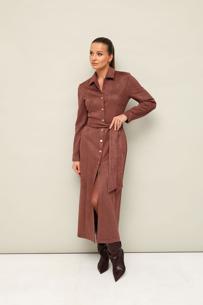 Силуэтное платье в длине миди, выполнено из экозамши. Отложной воротник с цельнокроеной стойкой. Центральная застёжка на кнопки. Перед с рельефными швами. Втачные двухшовные рукава с манжетами с застежкой на кнопки. Спинка со средним швом. В комплекте прилагается пояс из основной ткани.