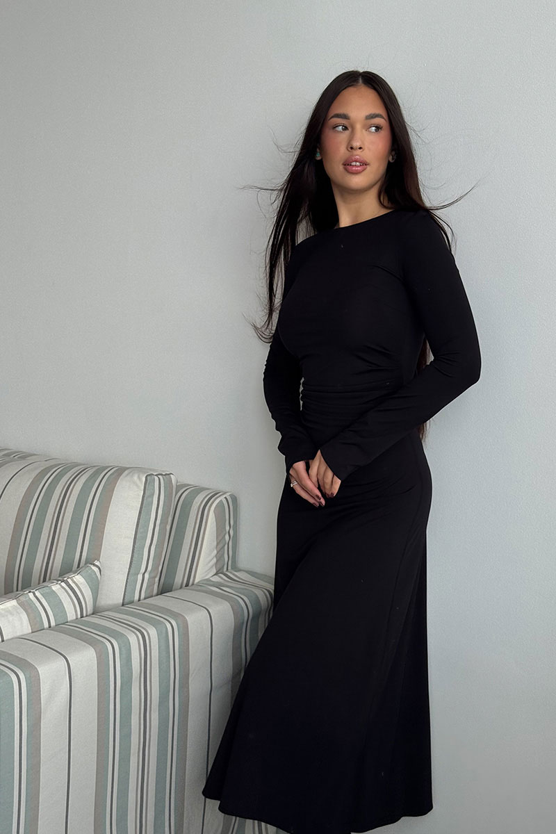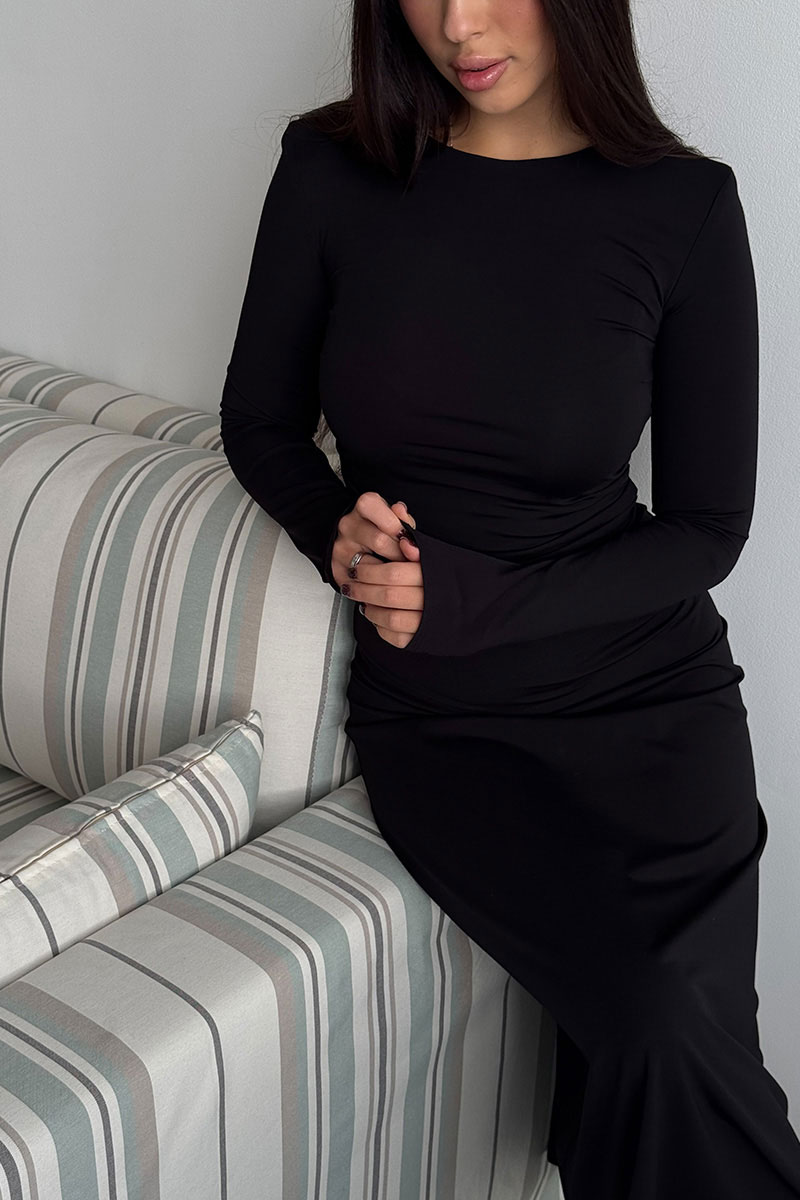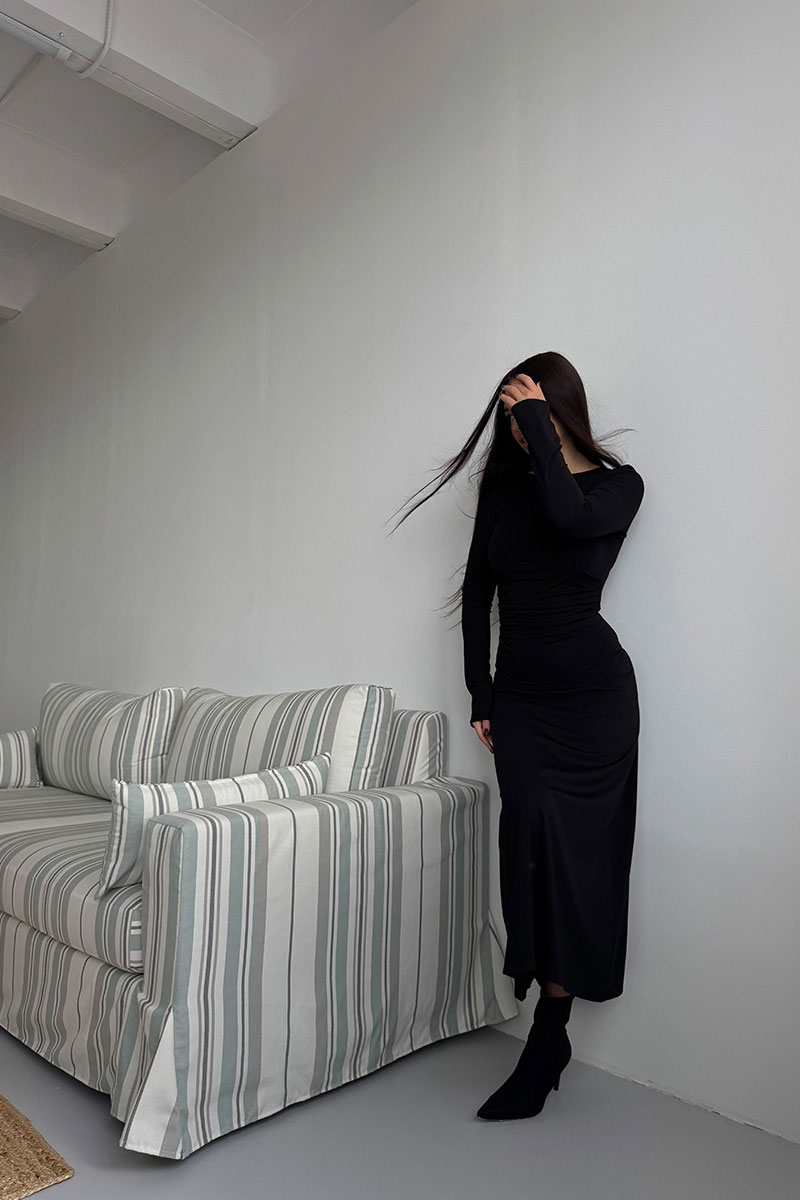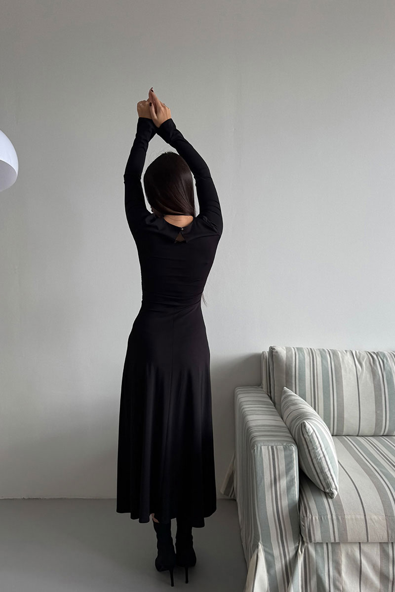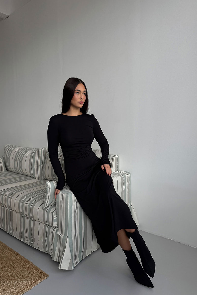 Платье приталенного кроя, с красивой сборкой на талии. Рост модели 168 см.