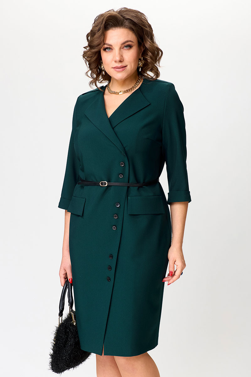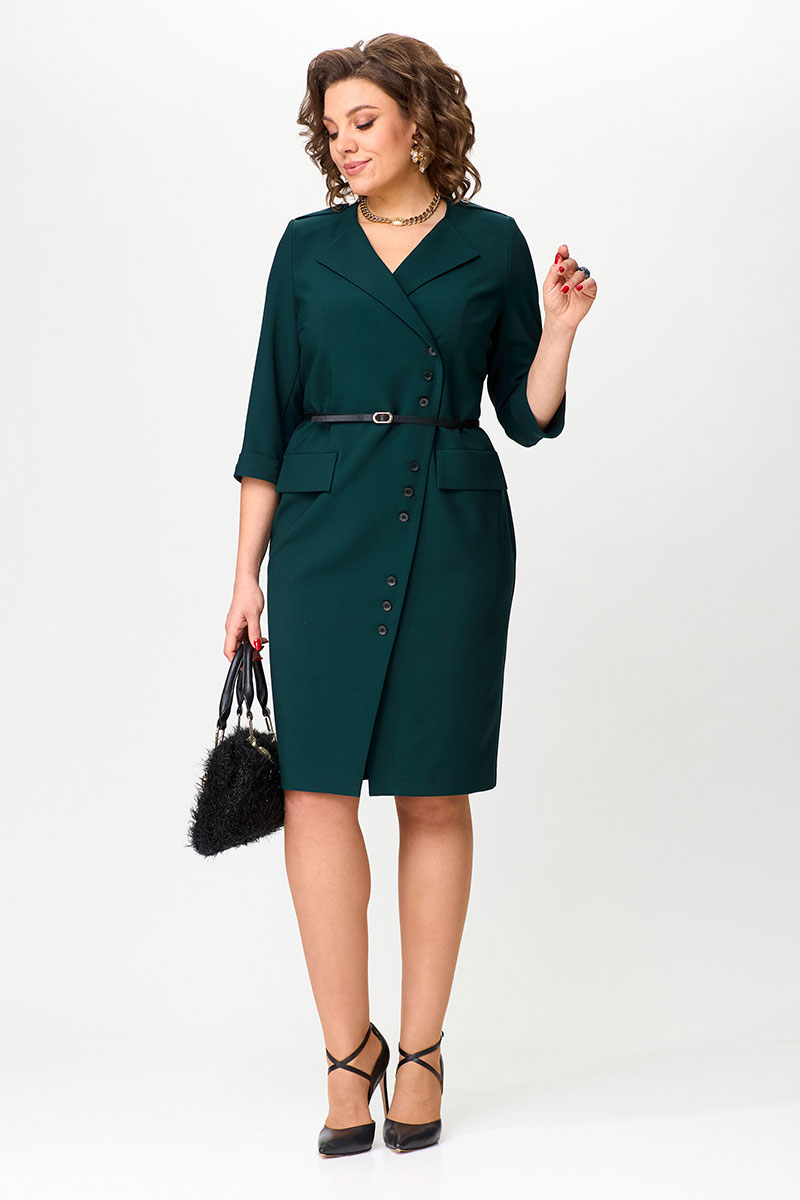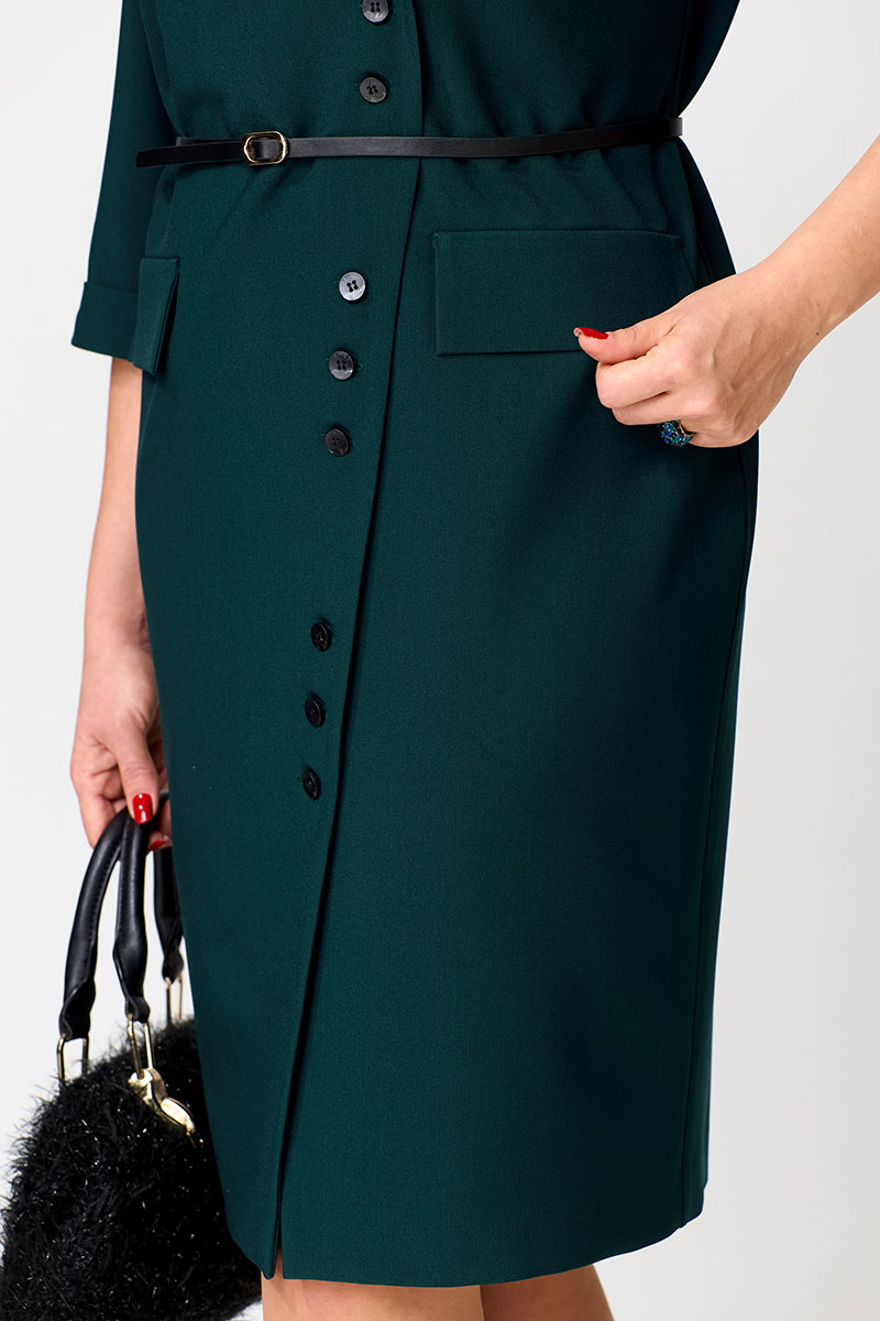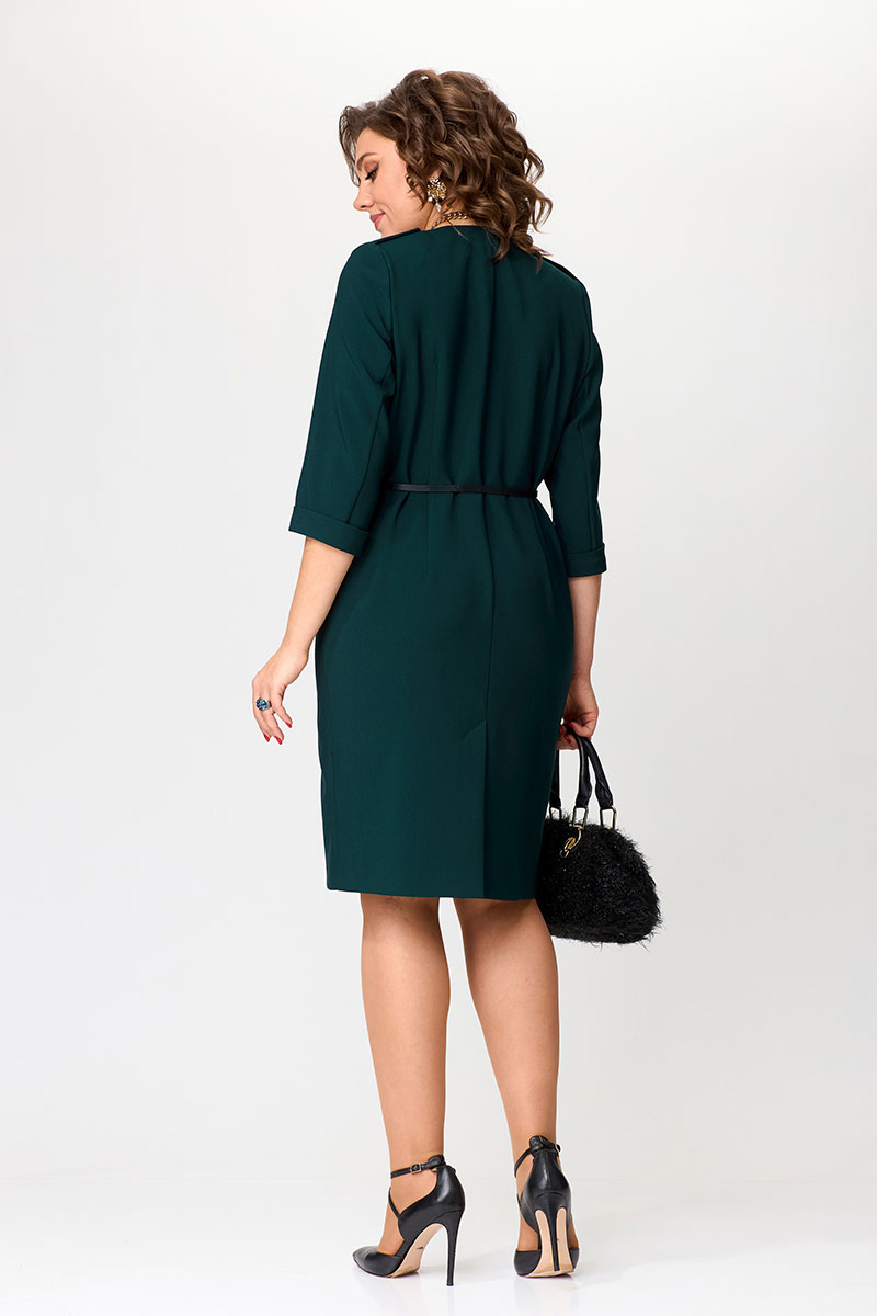 Перед платья с нагрудными вытачками и клапанами в области бёдер. Спинка с талиевыми вытачками и средним швом, в низу которого обработана шлица. Застежка асимметричная, двубортная, по низу платья расходится на разрез. В области плеч — погоны закрепляющиеся на пуговицу. Рукава двухшовные втачные, длиной 3/4, с притачной манжетой. Платье с плечевыми накладками и со съёмным ремнем в цвет фурнитуры. Фурнитура и комплектующие (ремень) могут незначительно отличаться от представленных на фото, в зависимости от наличия данной фурнитуры у поставщика.