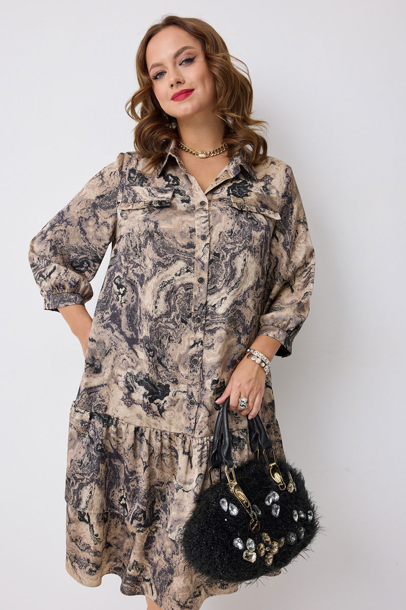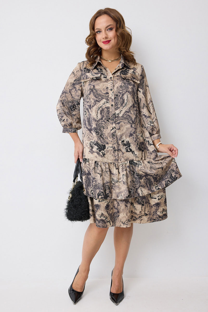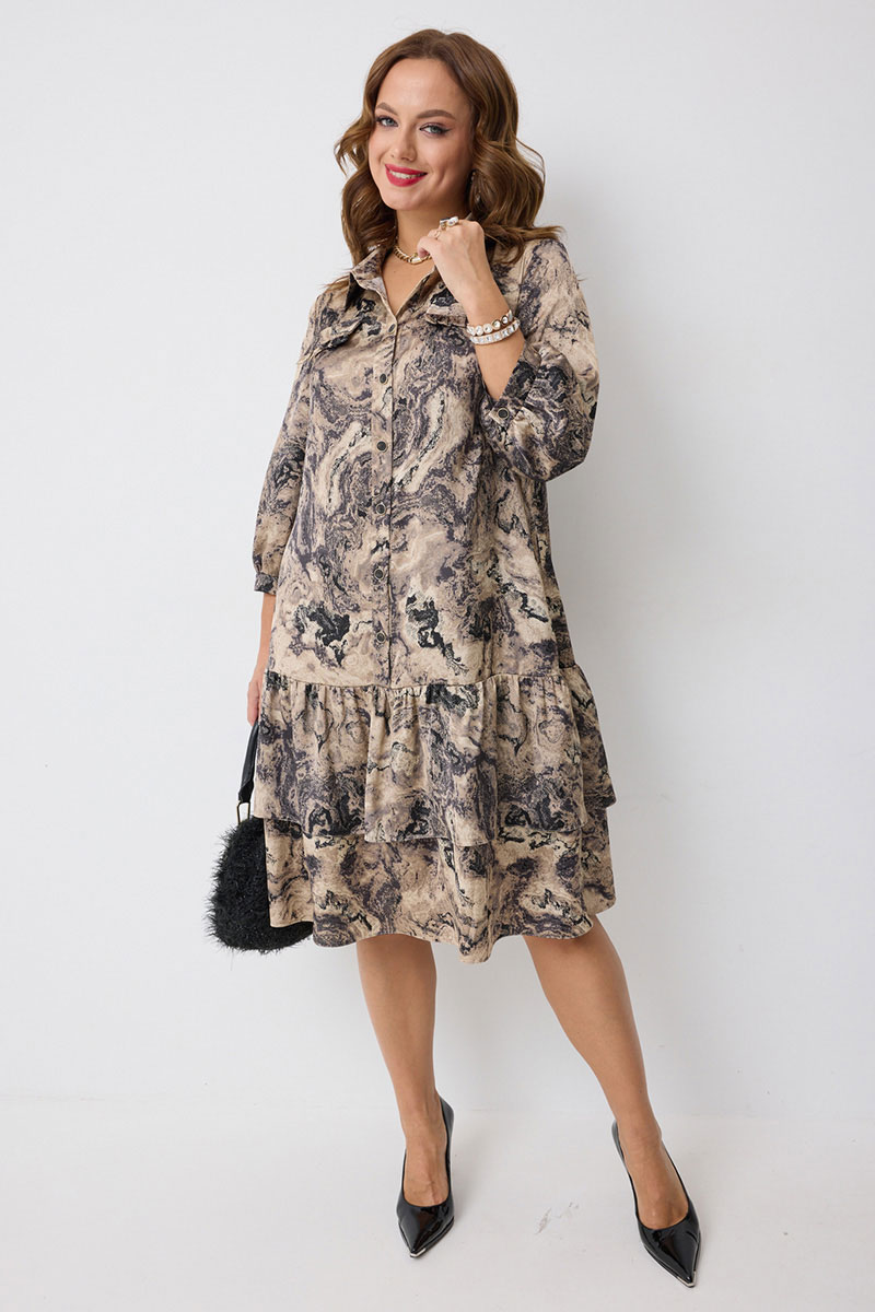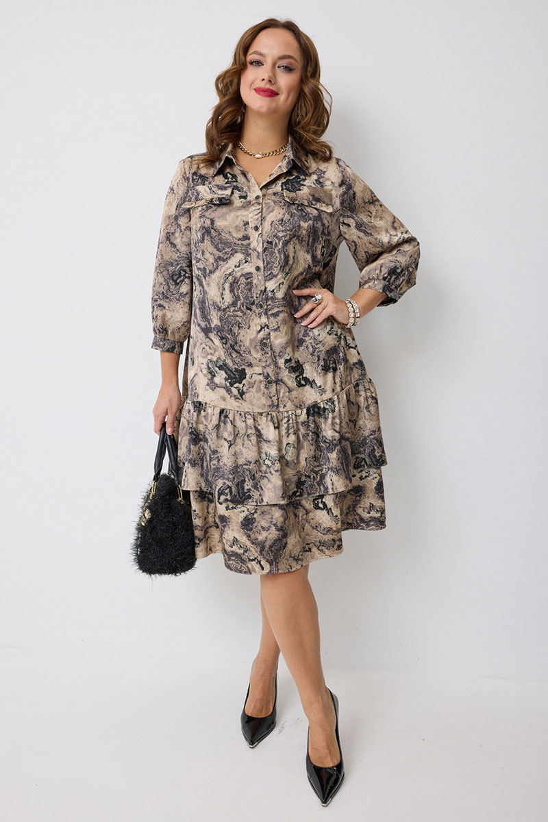 Платье, выполненное из вискозной плательной ткани, длиной миди, свободного кроя. Горловина платья оформлена воротником рубашечного типа. Перед платья с центральной застёжкой на петли и пуговицы, расположенной до линии бедер. По переду обработаны нагрудные вытачки. В области груди - настрочные декоративные клапаны, с рюшами. Нижняя часть платья состоит из двух воланов. В боковых швах обработаны карманы. Рукав втачной одношовный, длиной 3/4, низ рукава на притачной манжете, которая застёгивается на петлю пуговицу. Верхняя часть спинки цельнокроеная, нижняя, как и перед платья, состоит из 2-х воланов.