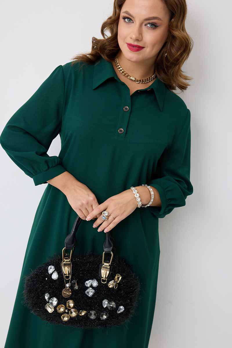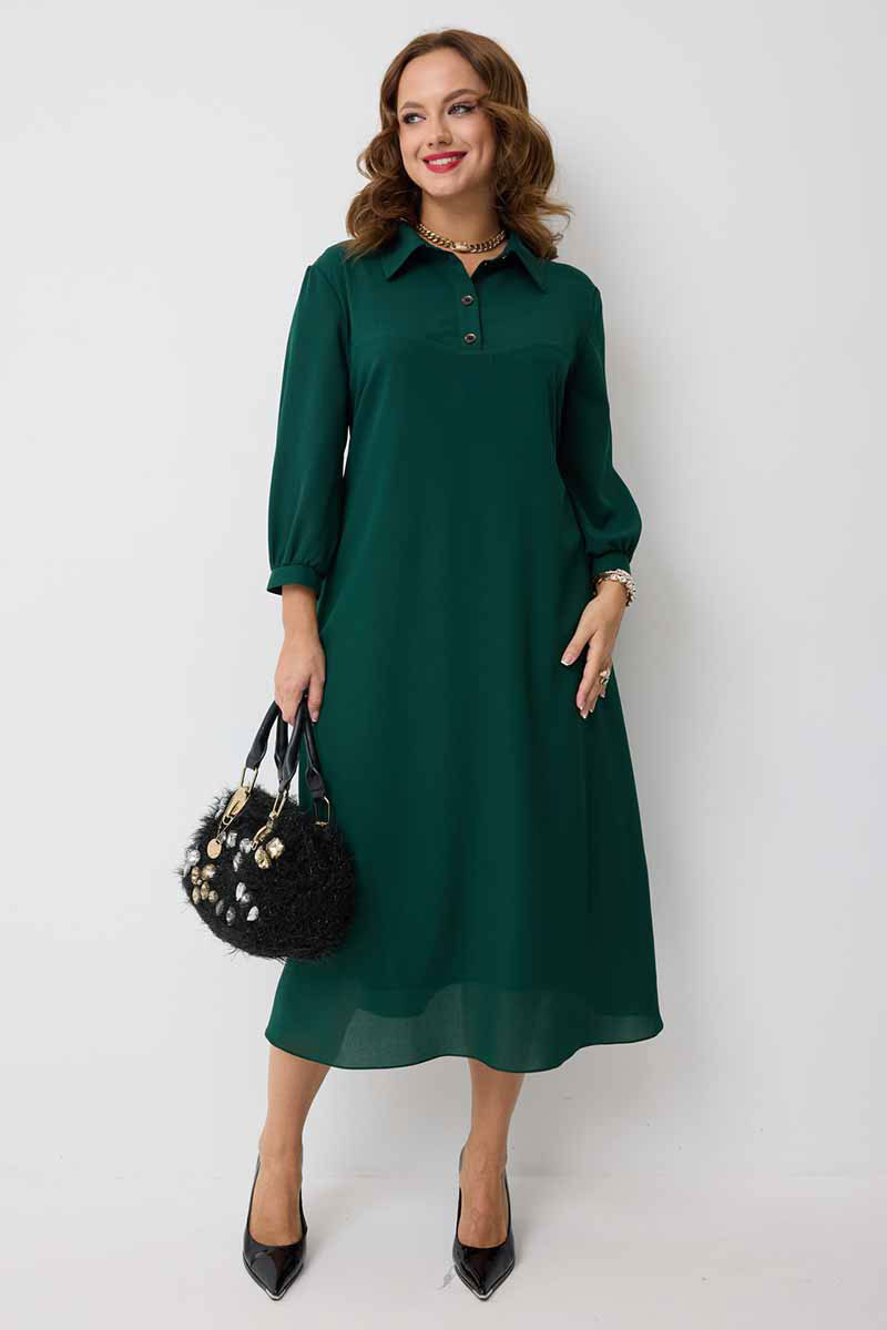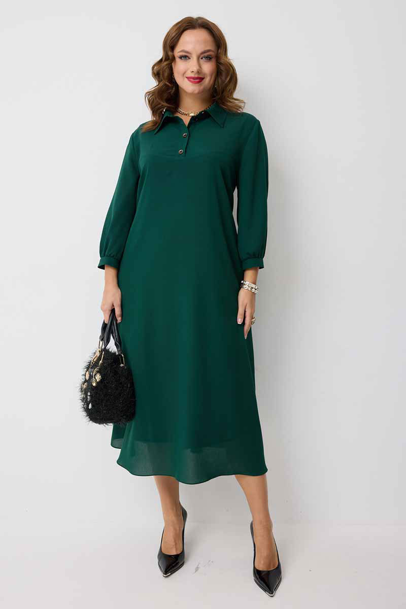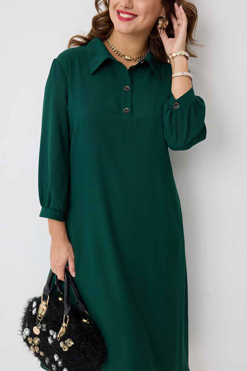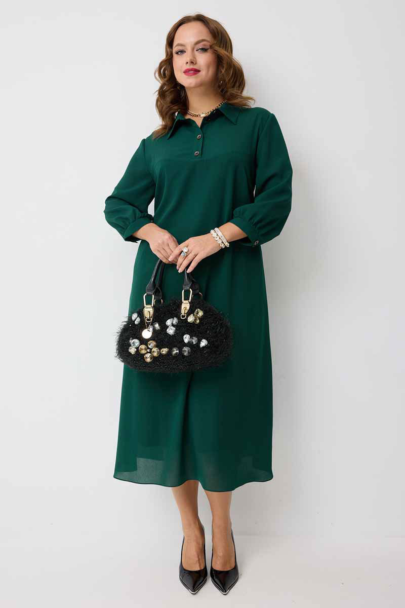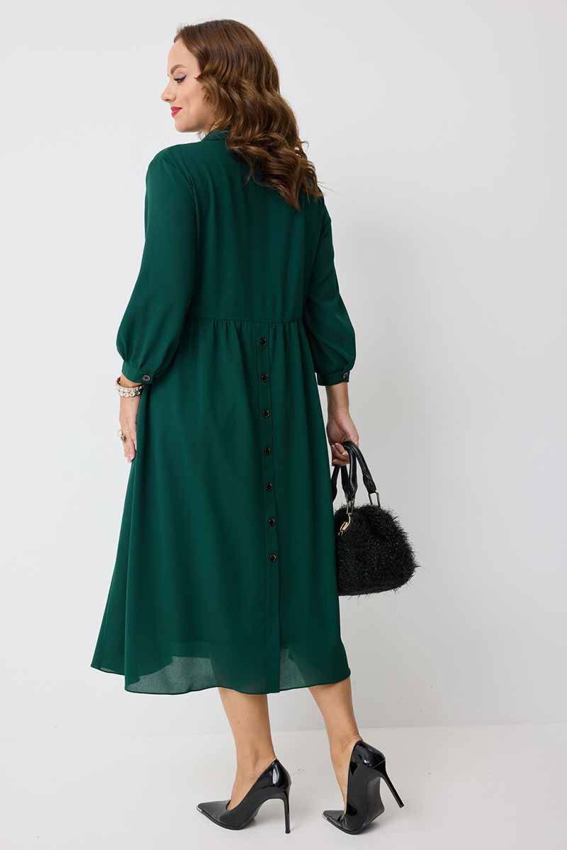 Платье А-силуэта, длиной мидакси, выполненное из креп-шифона на трикотажной подкладке. Перед состоит из фигурной кокетки и нижней части. В центральной части кокетки обработана планка с застёжкой на петли и пуговицы. Перед с нагрудными вытачками. Спинка платья состоит из верхней и нижней части. Нижняя часть - на сборке, по центру обработана планка-"обманка", с декоративными пуговицами. Горловина платья оформлена воротником рубашечного типа. Рукав втачной одношовный, по низу на сборке и притачной манжете, которая застёгивается на петлю и пуговицу. В области бедер, в боковых швах обработаны карманы.