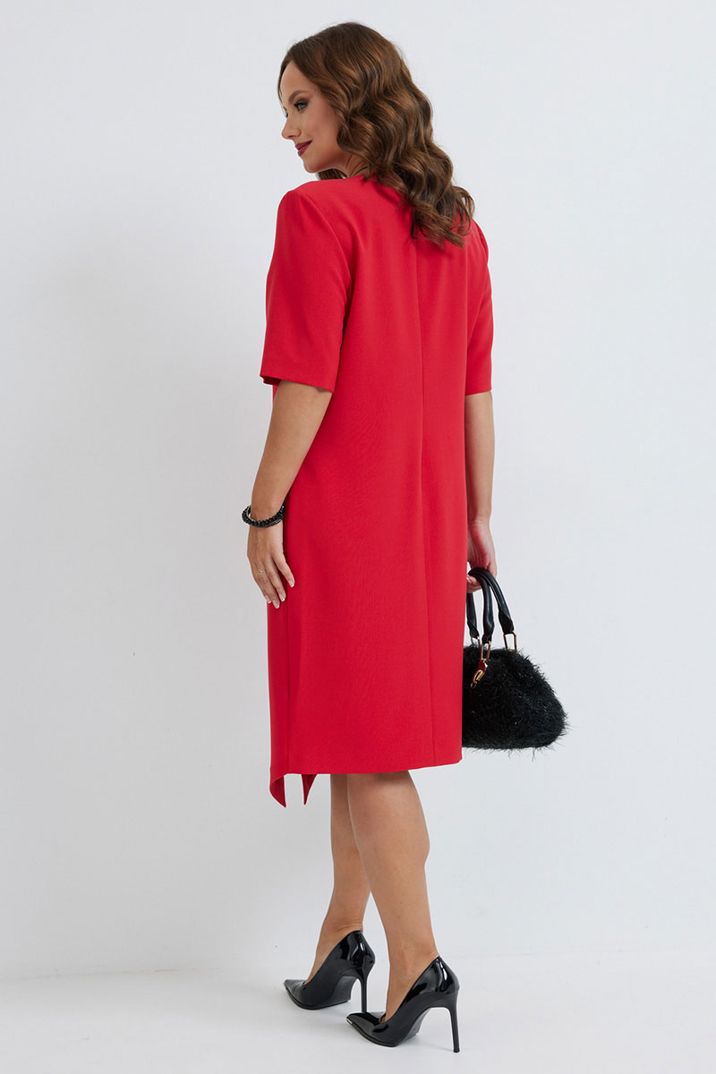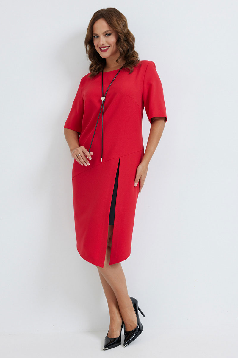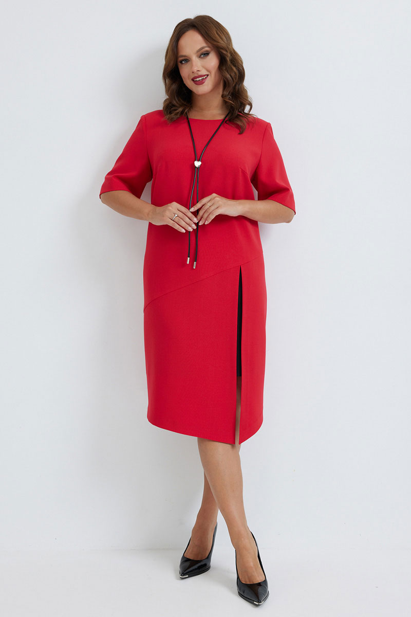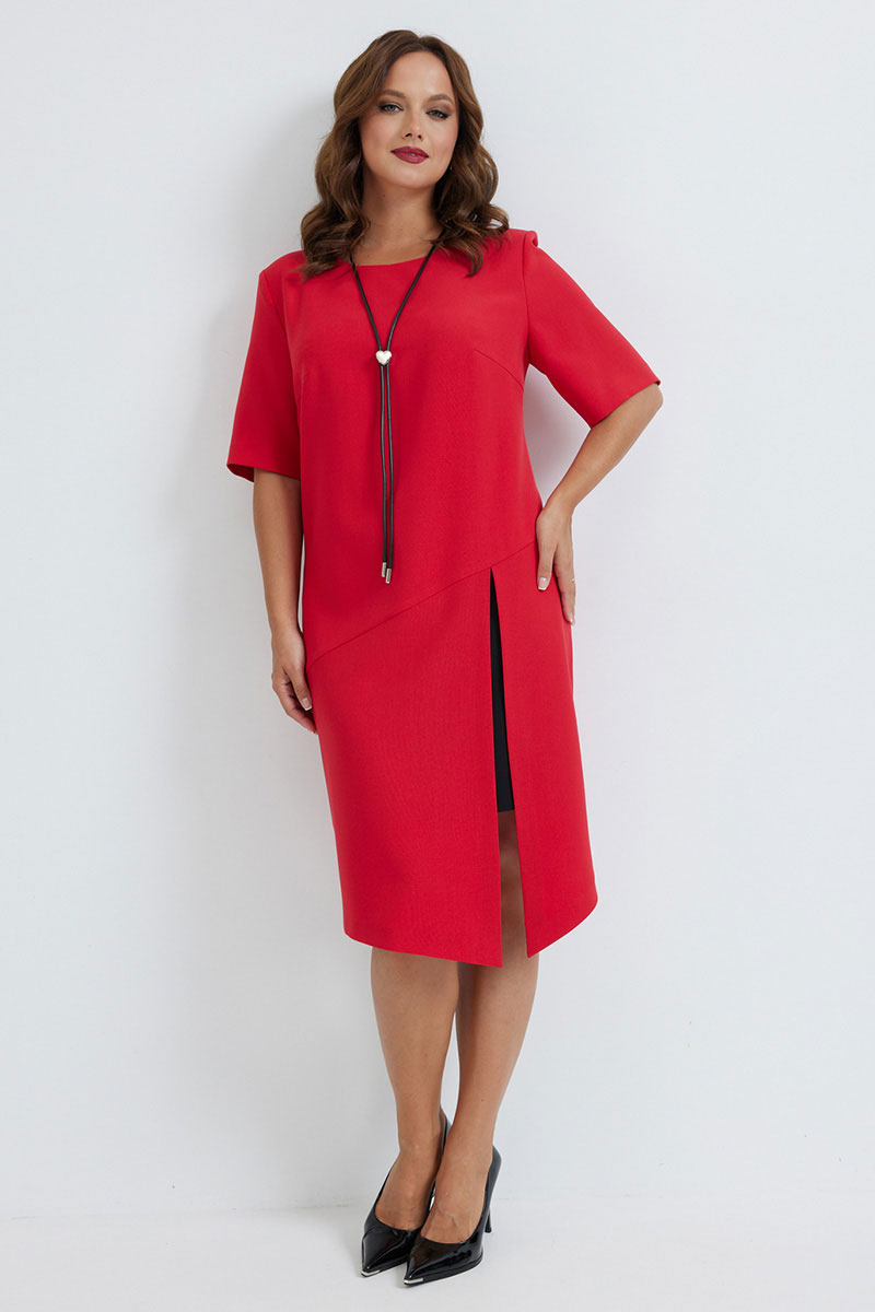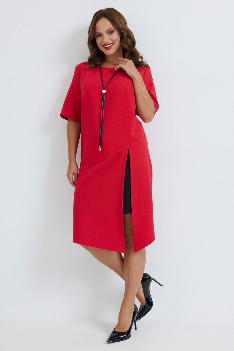 Эффектное платье прямого силуэта, выполненнное из поливискозы двух цветов. Перед платья с круглой горловиной и нагрудными вытачками. Перед платья в области бедра с косым подрезом. Нижняя часть переда состоит из верхней и нижней юбки. Верхняя юбка с косым низом и разрезом. Нижняя юбка из ткани контрастного цвета, имитирующая вторую юбку. Спинка с потайной молнией в среднем шве. Рукав втачной, длиной до линии локтя. В комплект к платью входит декоративная подвеска.