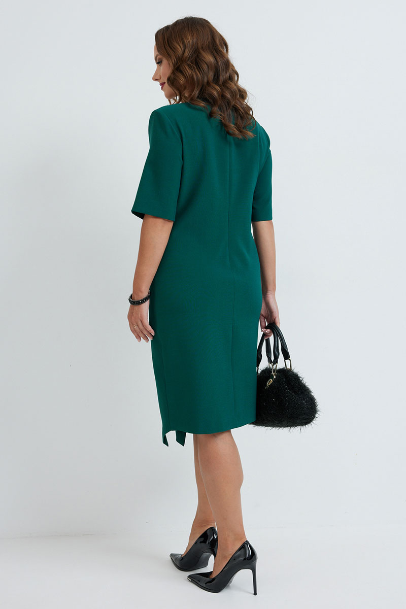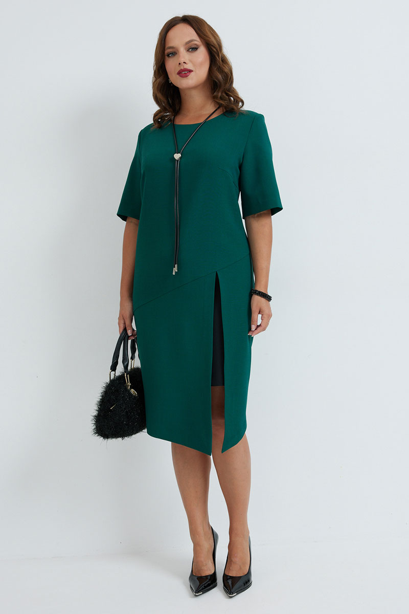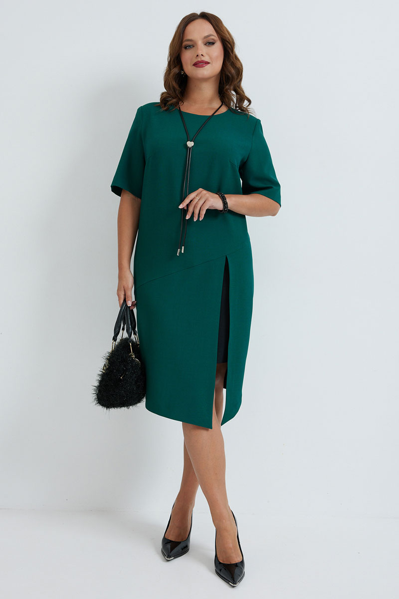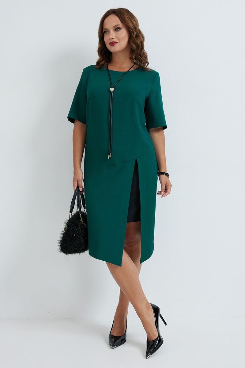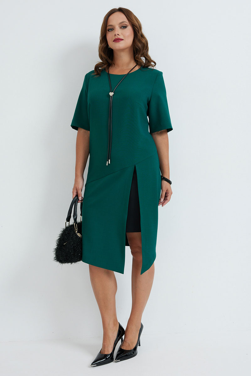 Эффектное платье прямого силуэта, выполненнное из поливискозы двух цветов. Перед платья с круглой горловиной и нагрудными вытачками. Перед платья в области бедра с косым подрезом. Нижняя часть переда состоит из верхней и нижней юбки. Верхняя юбка с косым низом и разрезом. Нижняя юбка из ткани контрастного цвета, имитирующая вторую юбку. Спинка с потайной молнией в среднем шве. Рукав втачной, длиной до линии локтя. В комплект к платью входит декоративная подвеска.