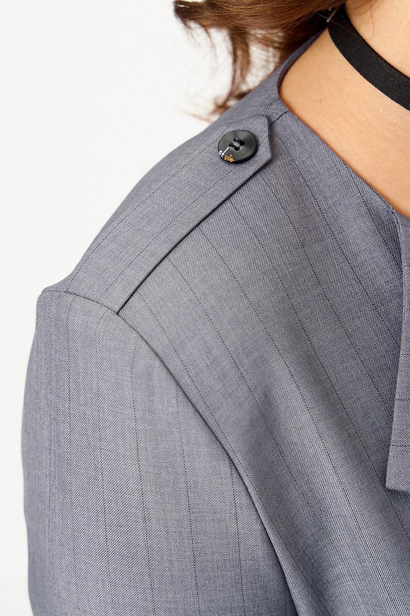 Элегантное платье полуприлегающего силуэта с асимметричной застежкой на петли и пуговицы. Перед платья с нагрудными вытачками и клапанами в области бёдер. Спинка с талиевыми вытачками и средним швом, внизу которого обработана шлица. Застежка асимметричная, двубортная, по низу платья расходится на разрез. В области плеч — погоны, закрепляющиеся на пуговицу. Рукава двухшовные втачные, длиной 3/4, с притачной манжетой. Платье с плечевыми накладками и со съёмным ремнем в цвет фурнитуры. Фурнитура и комплектующие (ремень) могут незначительно отличаться от представленных на фото.