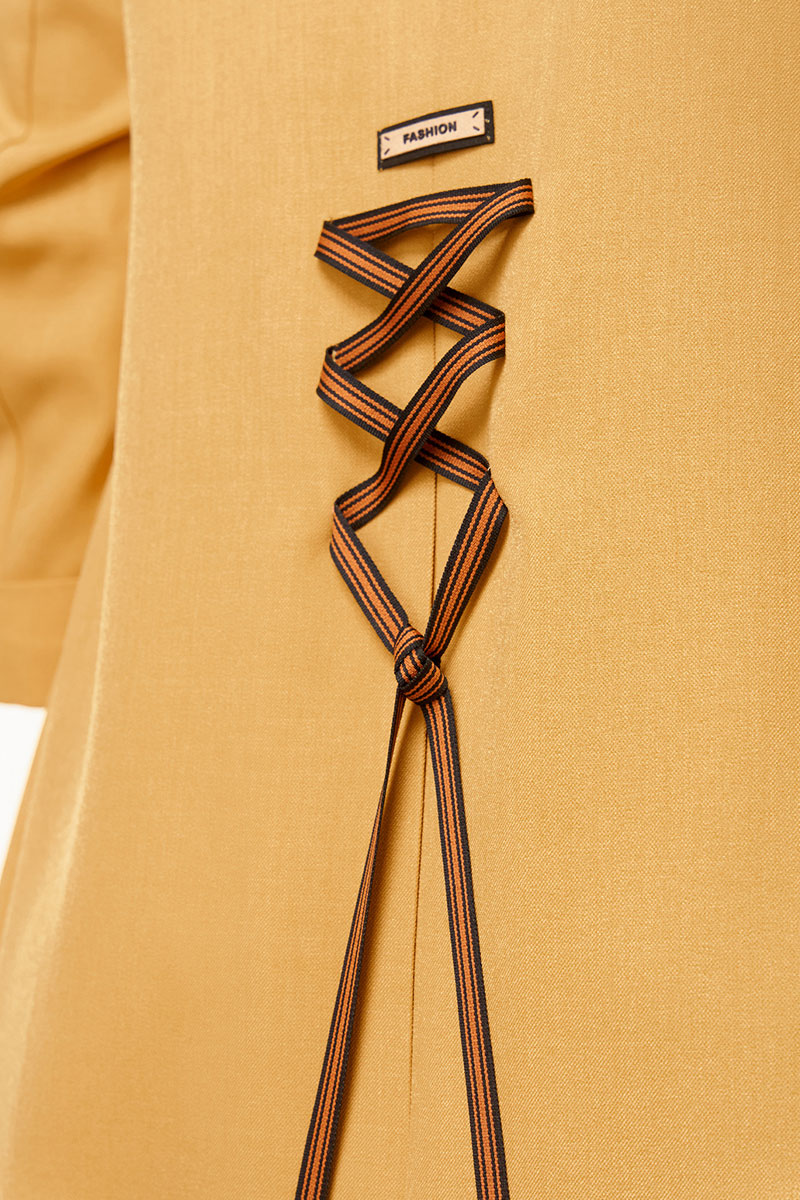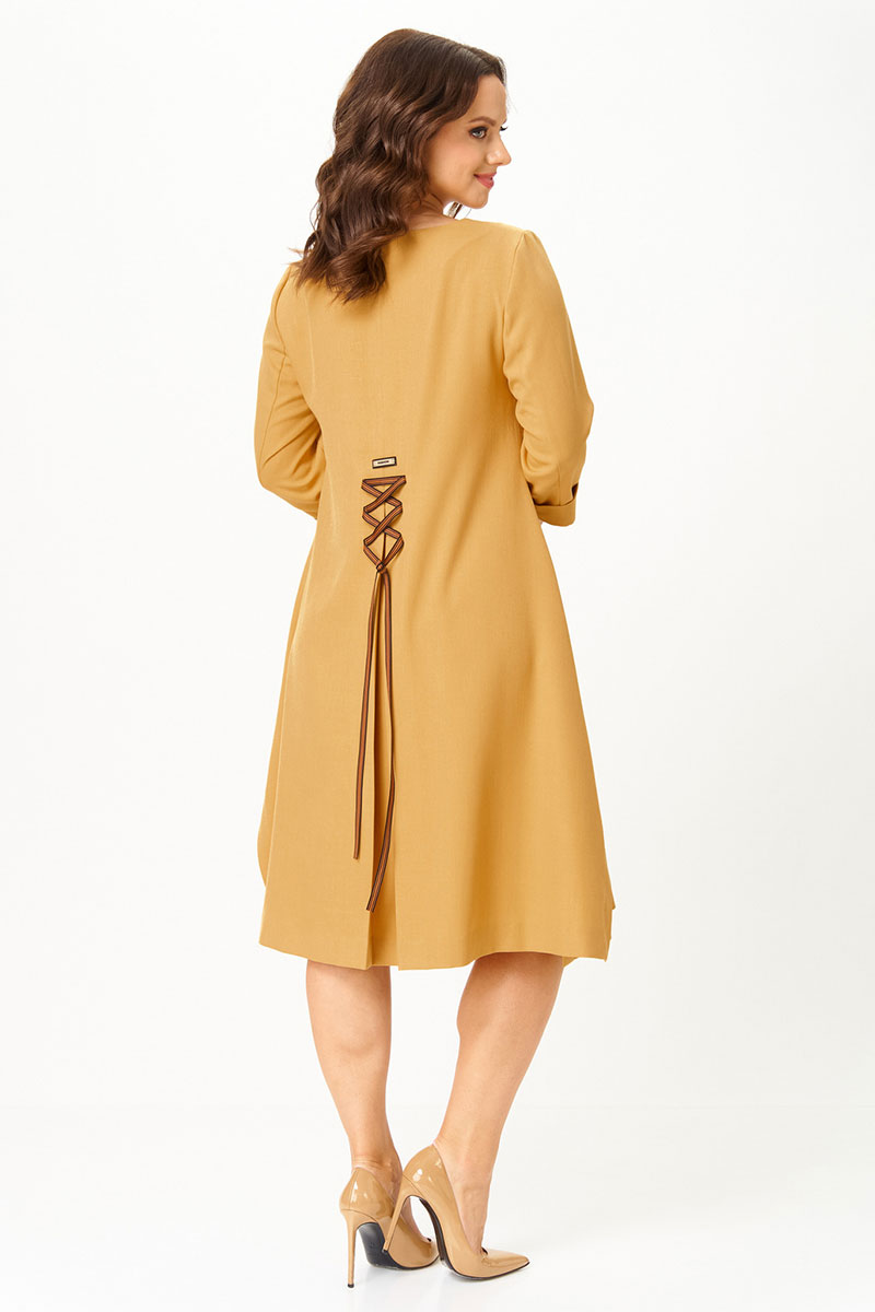 Платье трапециевидного силуэта, выполненное из поливискозы, длиной миди. Перед с нагрудными вытачками, в области груди - декоративная нашивка. Спинка со средним швом, в области талии расположена декоративная шнуровка и декоративный элемент. Рукав втачной, с манжетой, длиной 3/4. В боковых швах платья обработаны карманы.