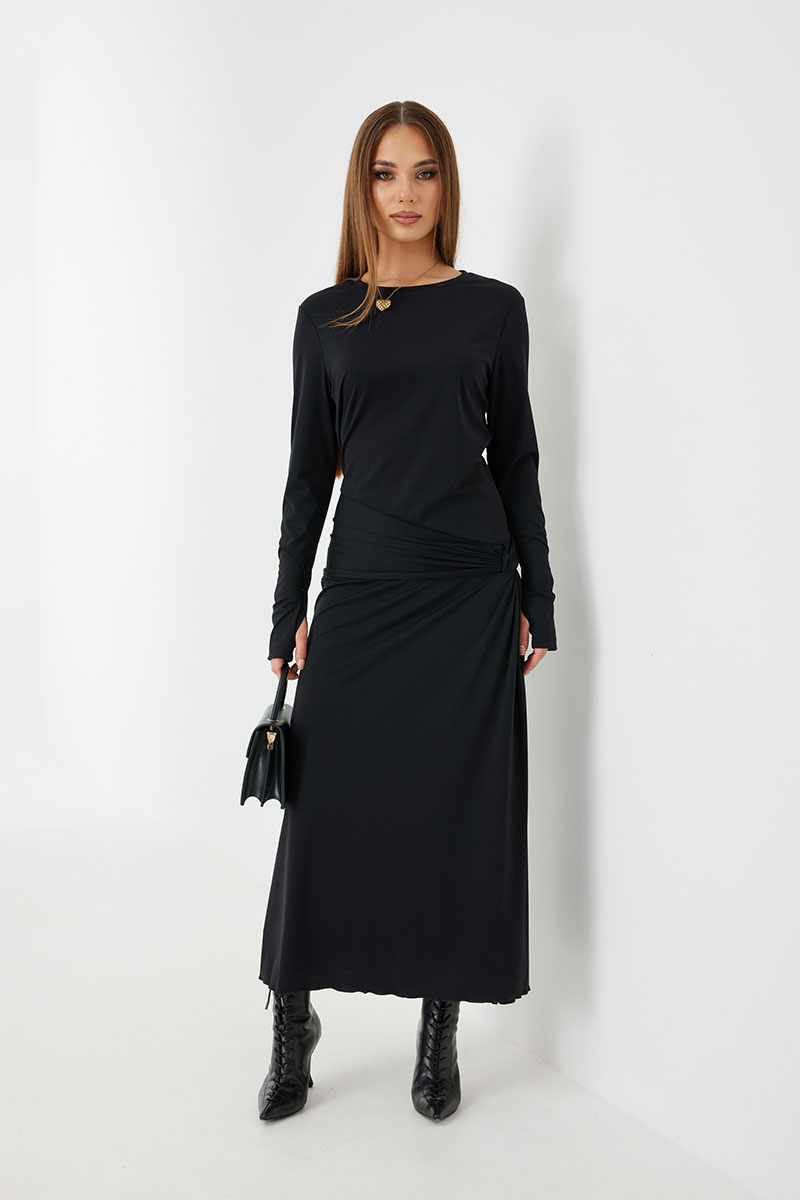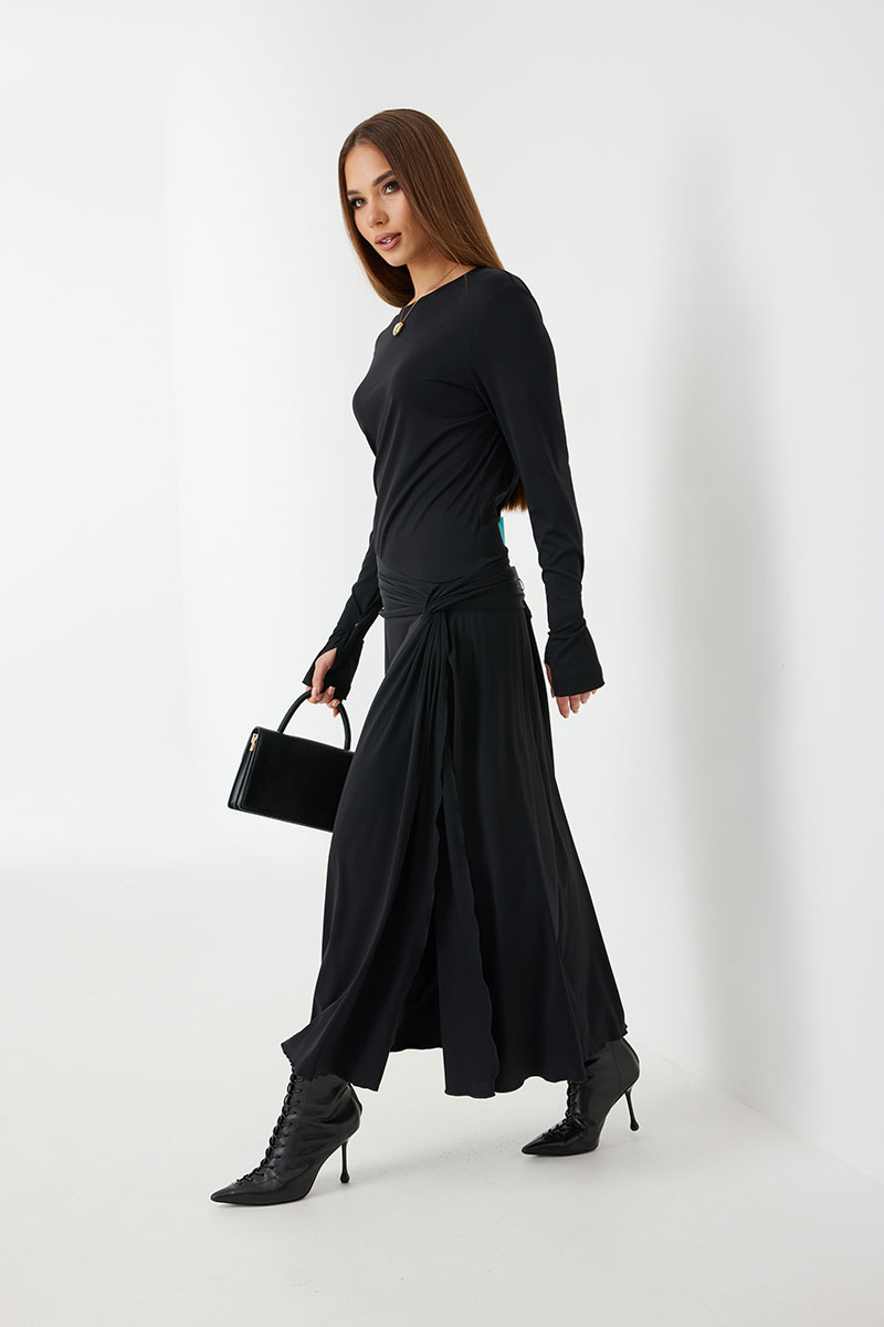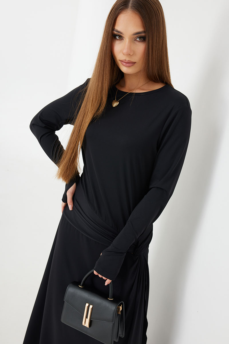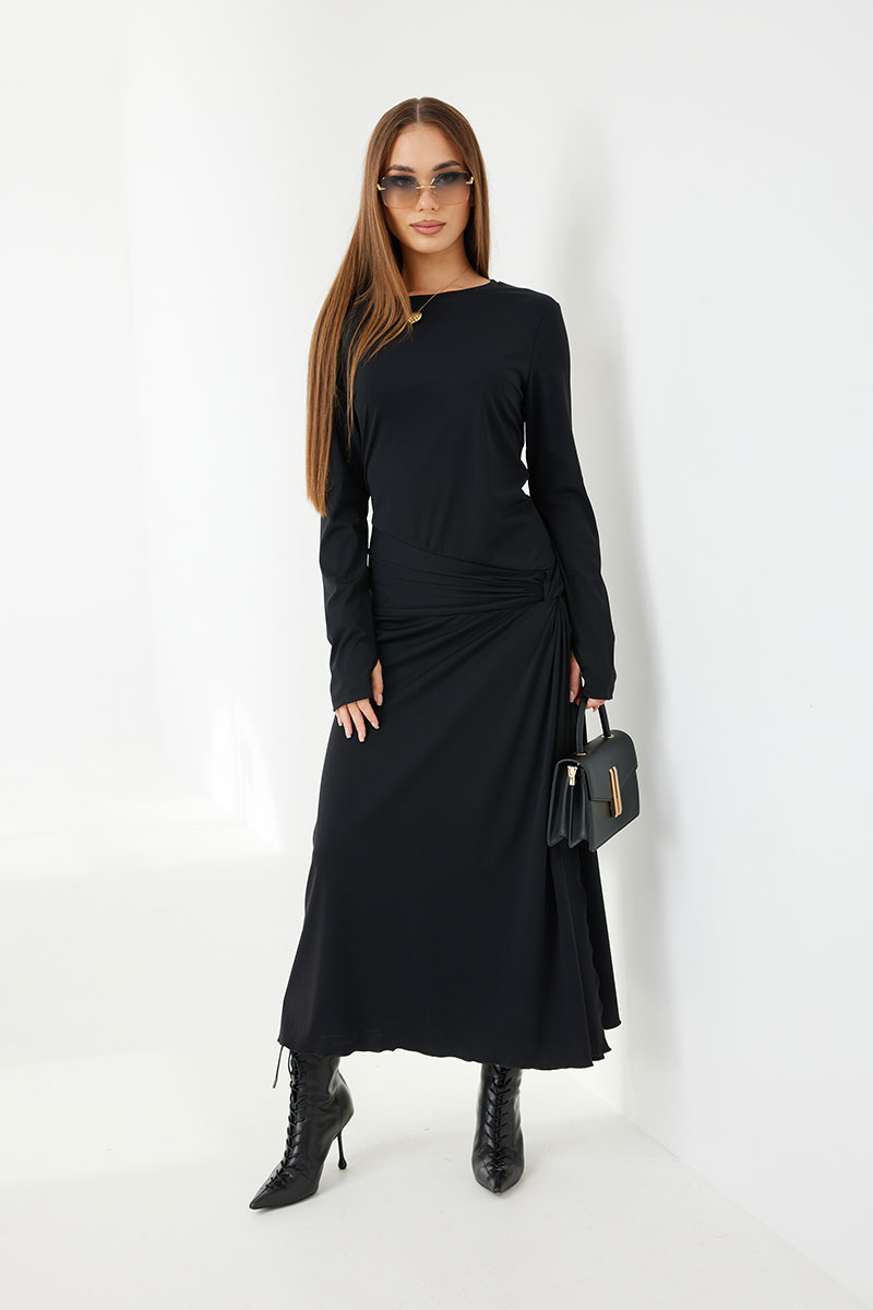 Платье женское прилегающего силуэта, длиной миди, с подрезом и интересной драпировкой в области чуть ниже талии по переду, юбка, расширенная книзу. Горловина обработана бейкой. Рукав втачной, узкий.