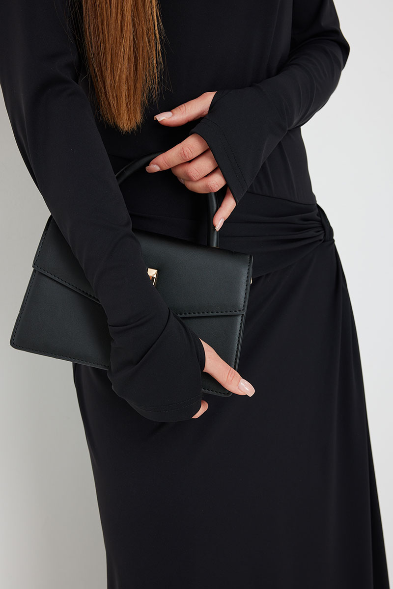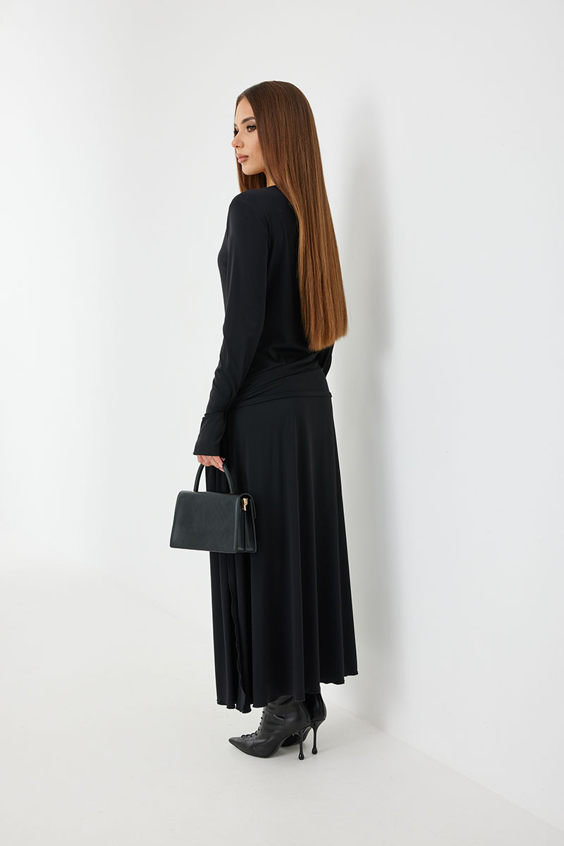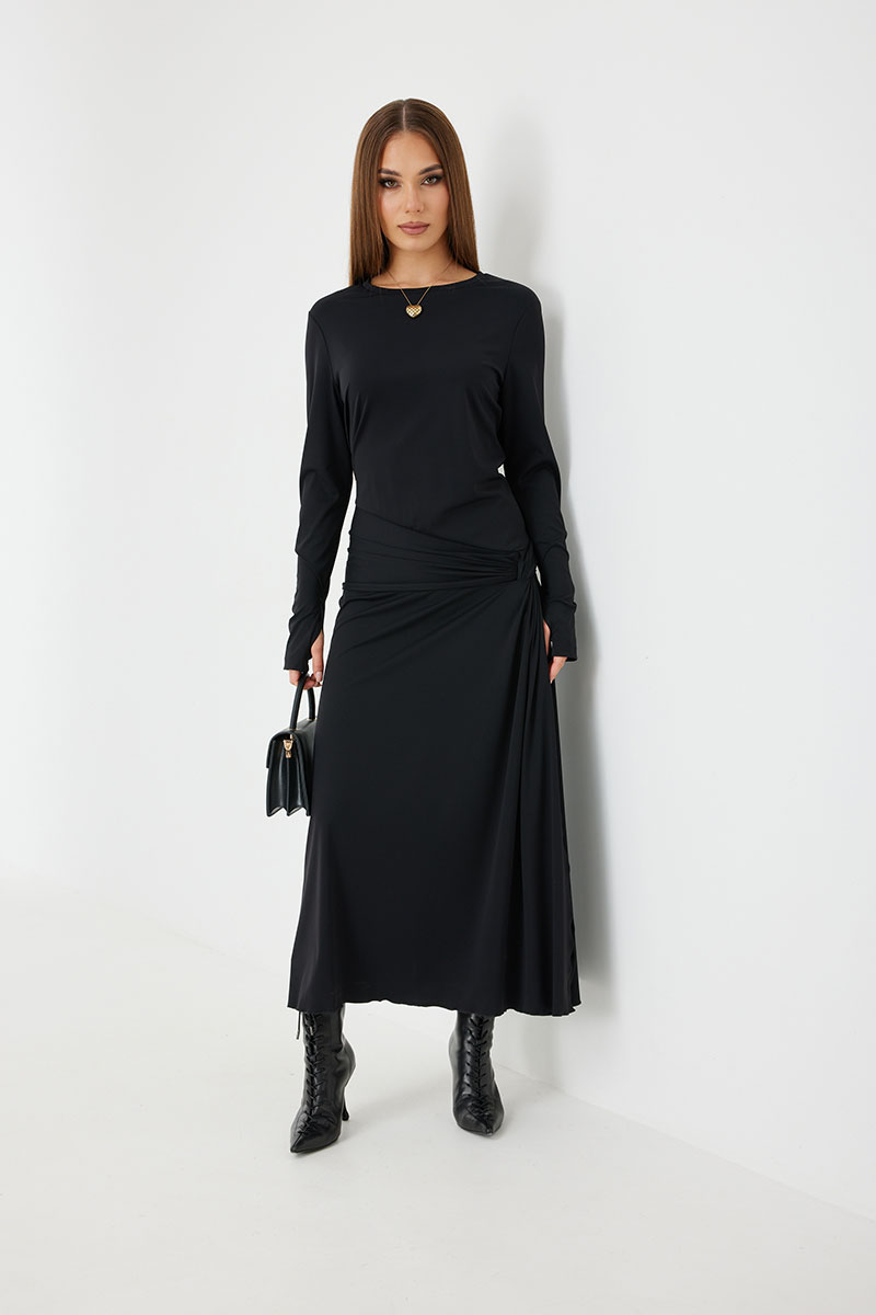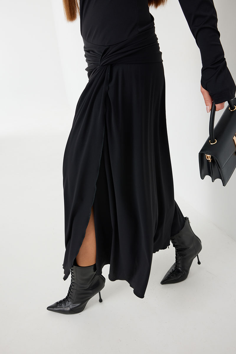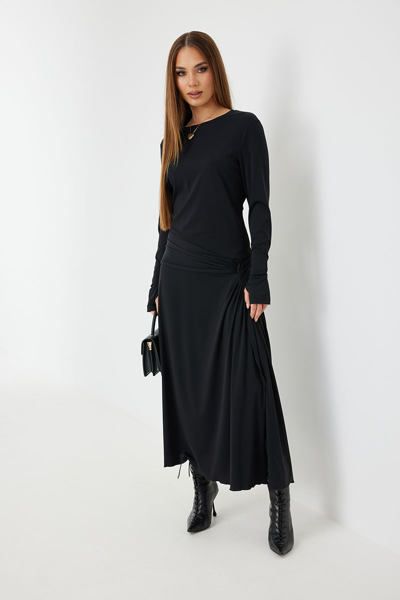 Платье женское прилегающего силуэта, длиной миди, с подрезом и интересной драпировкой в области чуть ниже талии по переду, юбка, расширенная книзу. Горловина обработана бейкой. Рукав втачной, узкий.