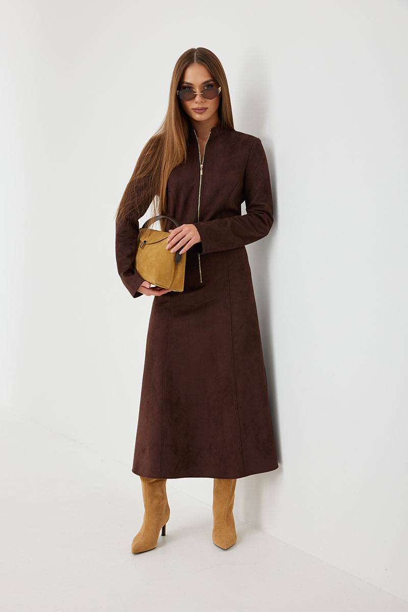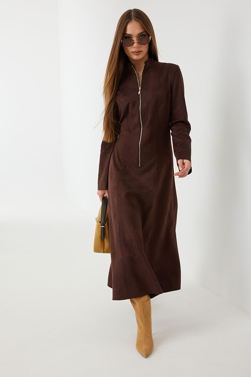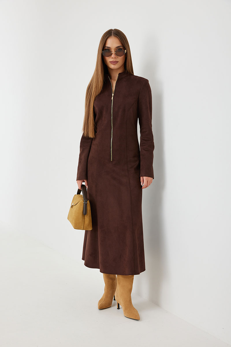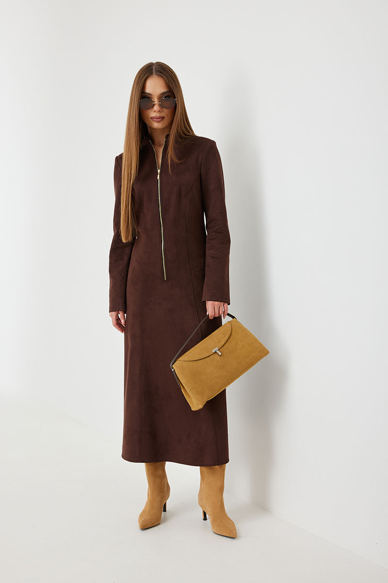 Платье женское полуприлегающего силуэта, из ткани под замшу, длиной миди, с высокими разрезами