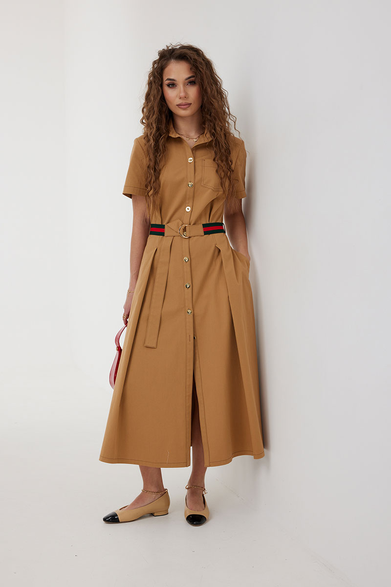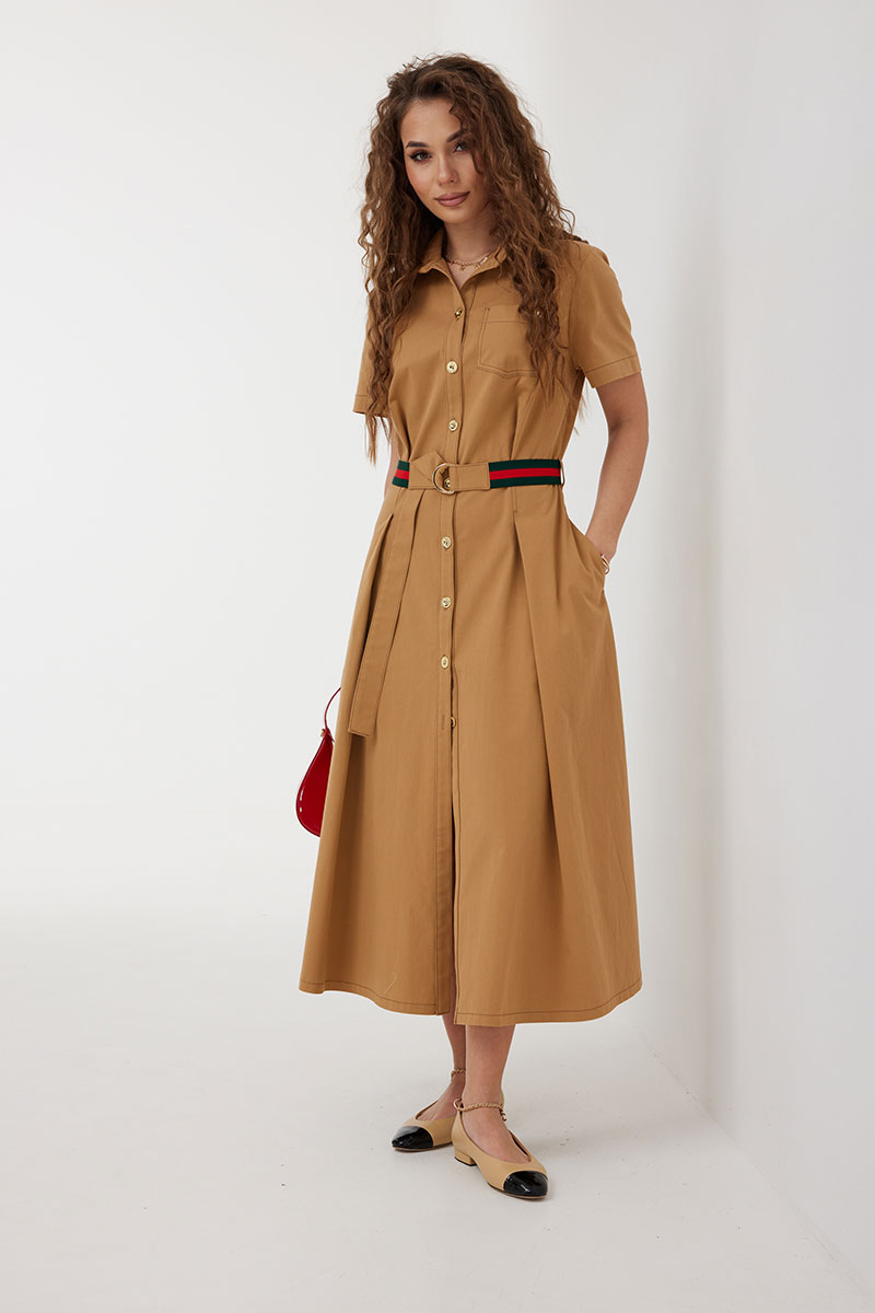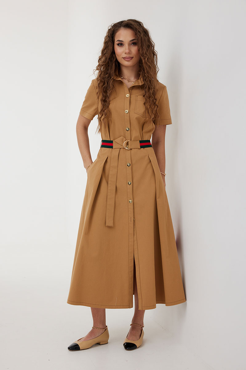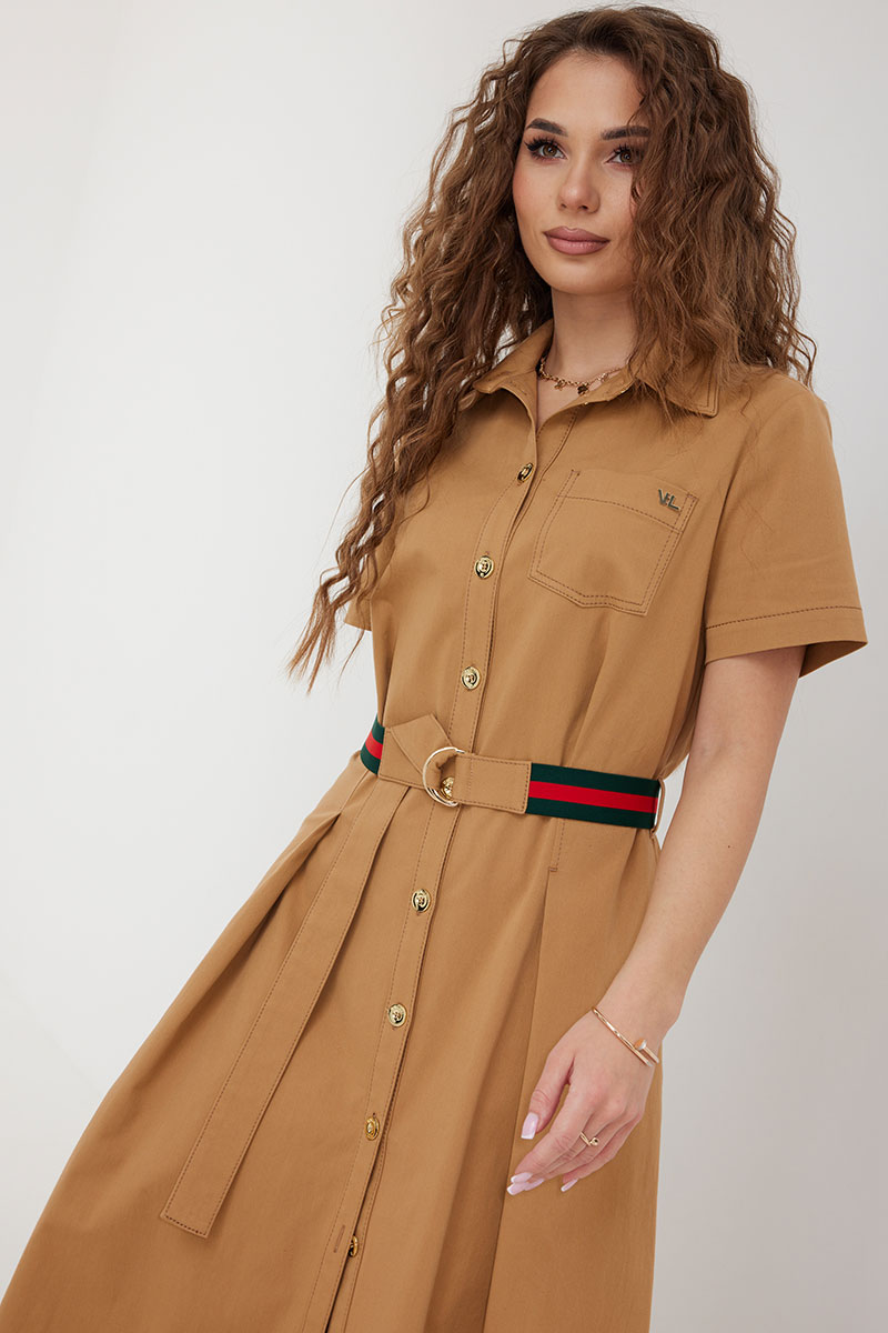 Платье из тонкой джинсовой ткани полуприлегающего силуэта длины «миди», расширенное к низу. По талии подрез, нижняя часть платья с карманами в боковых швах и встречными складками по талии. По переду планка с застежкой на петли и пуговицы, воротник на стойке. На левой стороне переда накладной карман с эмблемой. Рукав втачной короткий. Пояс съемный с полукольцами и декоративной резинкой.