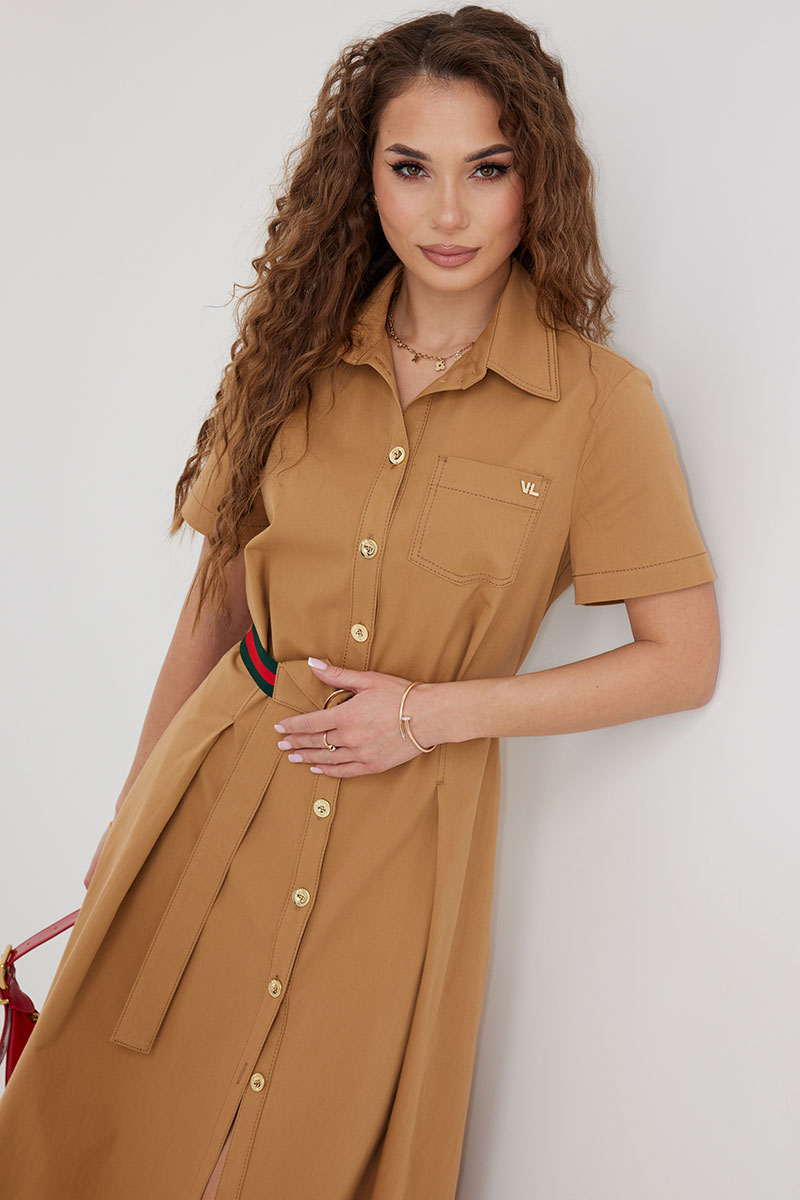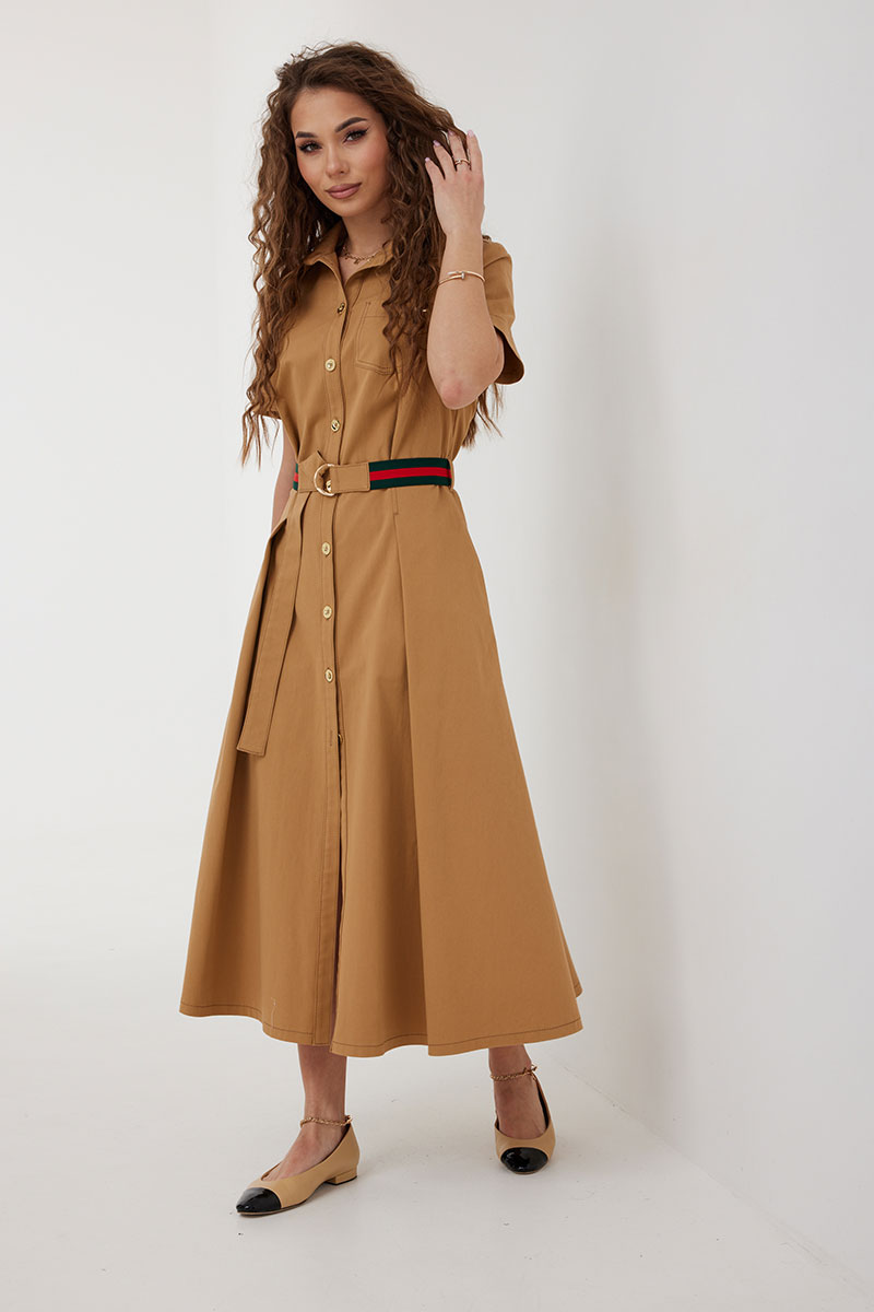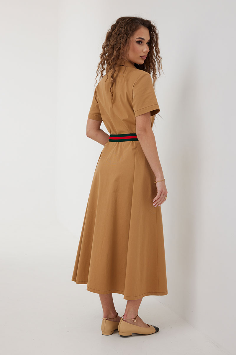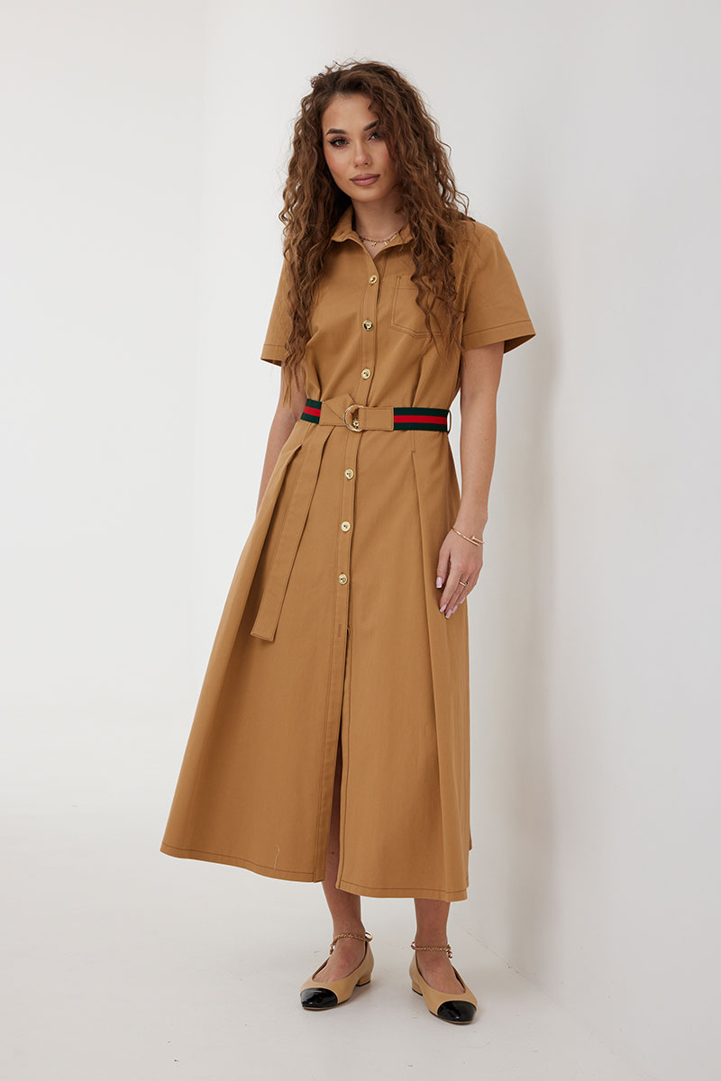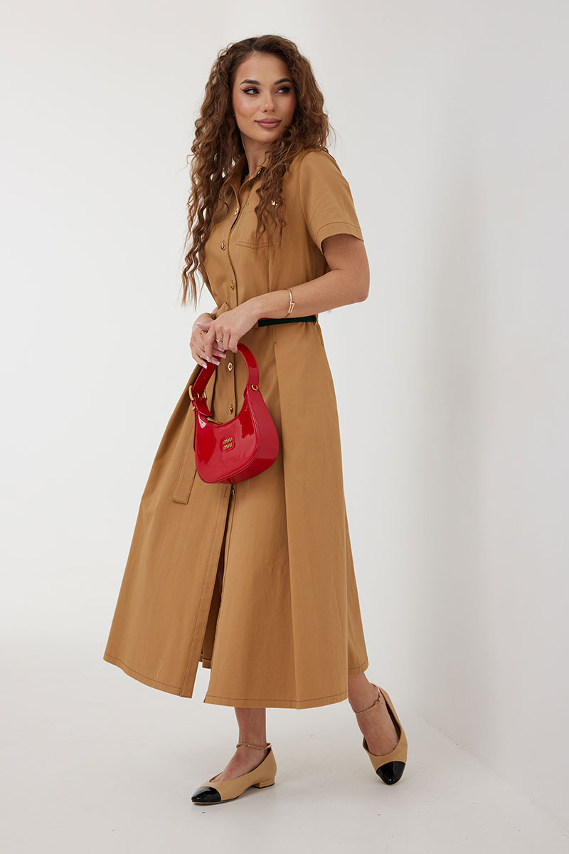 Платье из тонкой джинсовой ткани полуприлегающего силуэта длины «миди», расширенное к низу. По талии подрез, нижняя часть платья с карманами в боковых швах и встречными складками по талии. По переду планка с застежкой на петли и пуговицы, воротник на стойке. На левой стороне переда накладной карман с эмблемой. Рукав втачной короткий. Пояс съемный с полукольцами и декоративной резинкой.