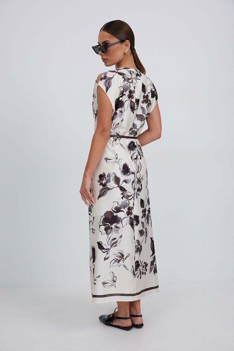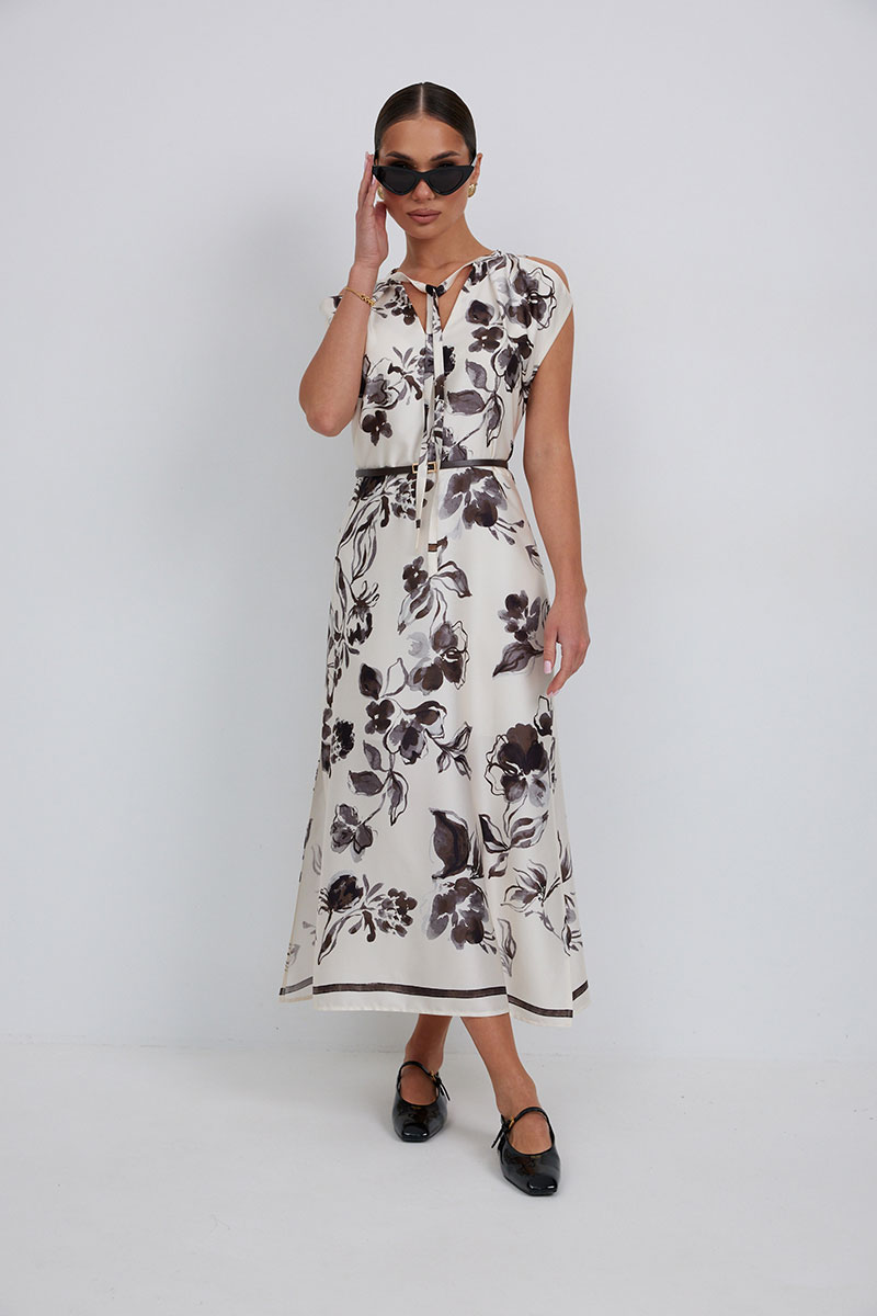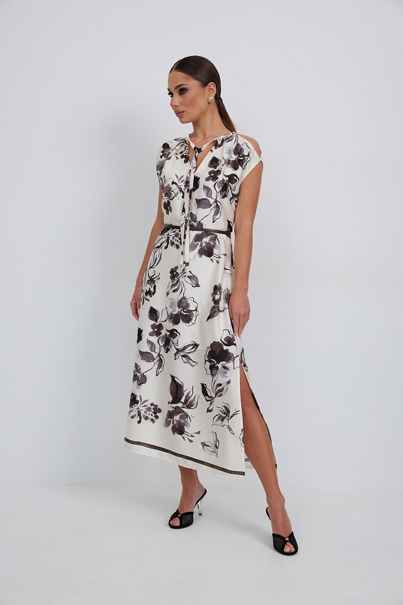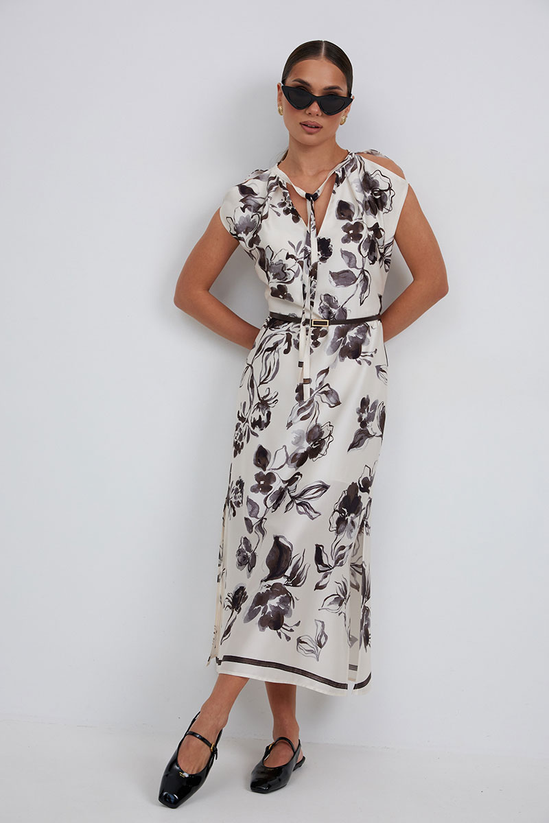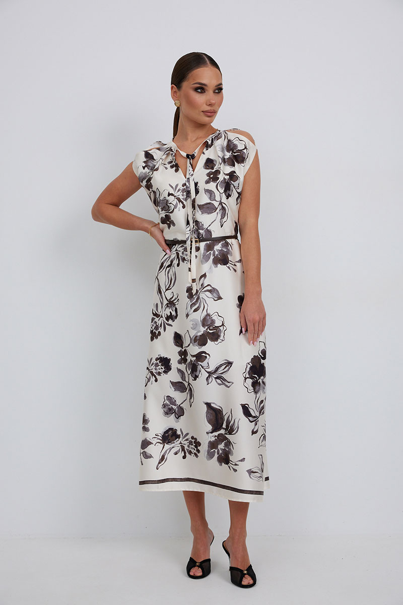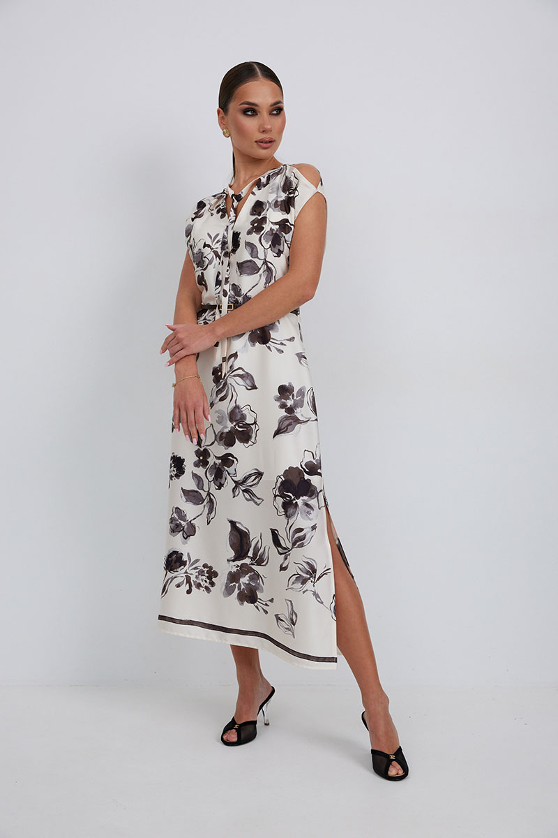 Платье полуприлегающего силуэта чуть расширенное к низу из плательно-блузочной ткани. По линии плеча выполнены разрезы. Горловина со стойкой, переходящей в завязки. По низу боковых швов разрезы. Застежка-молния в среднем шве спинки. Платье на подкладке.