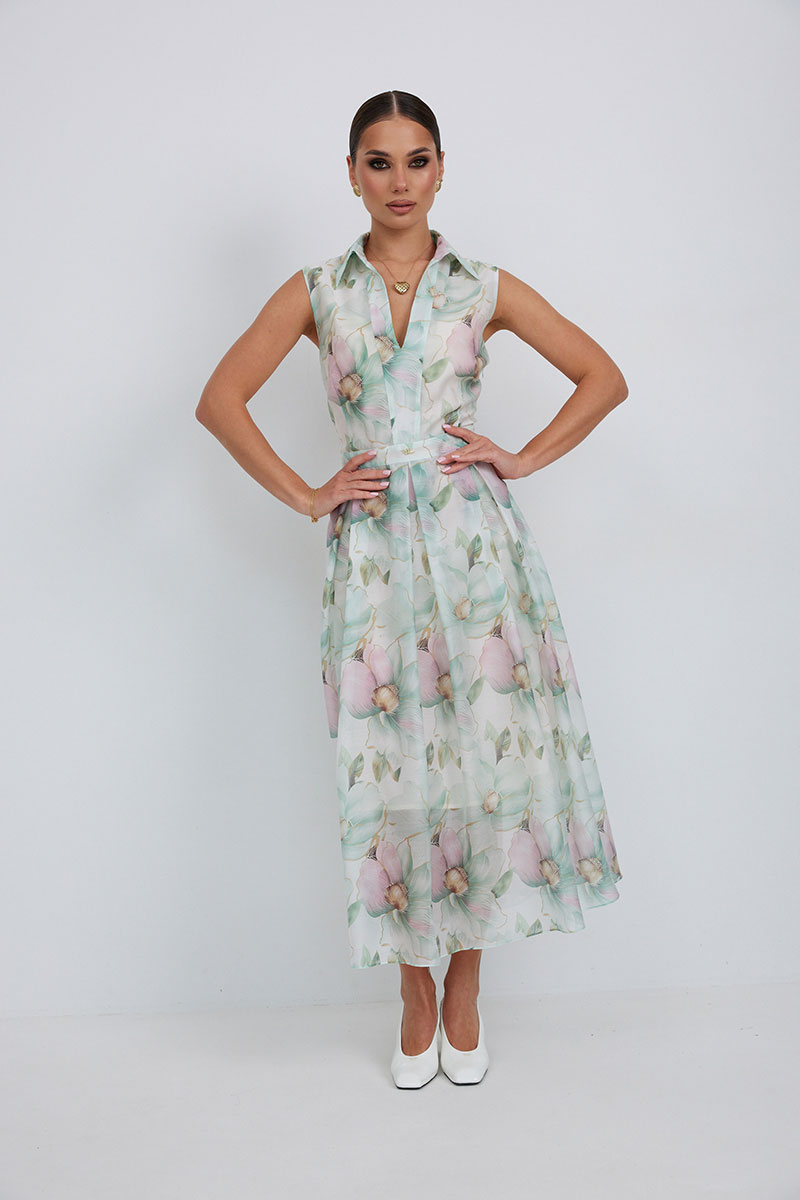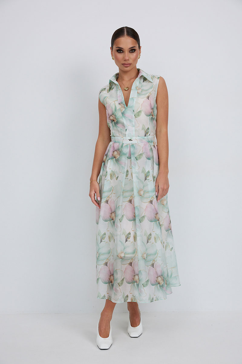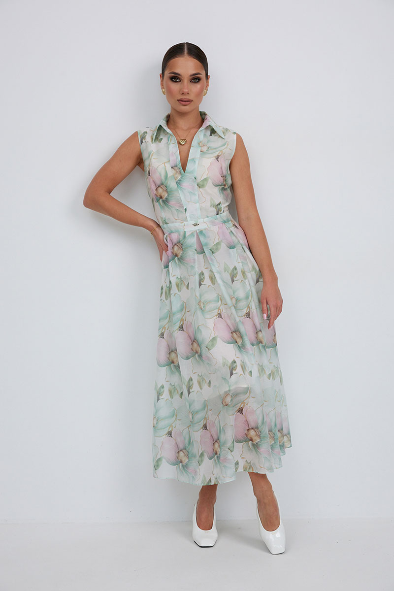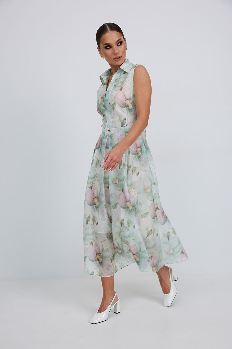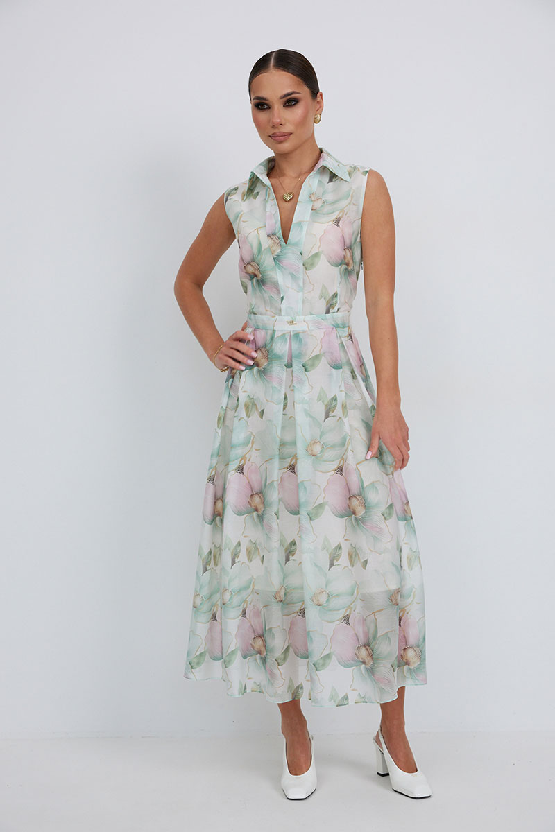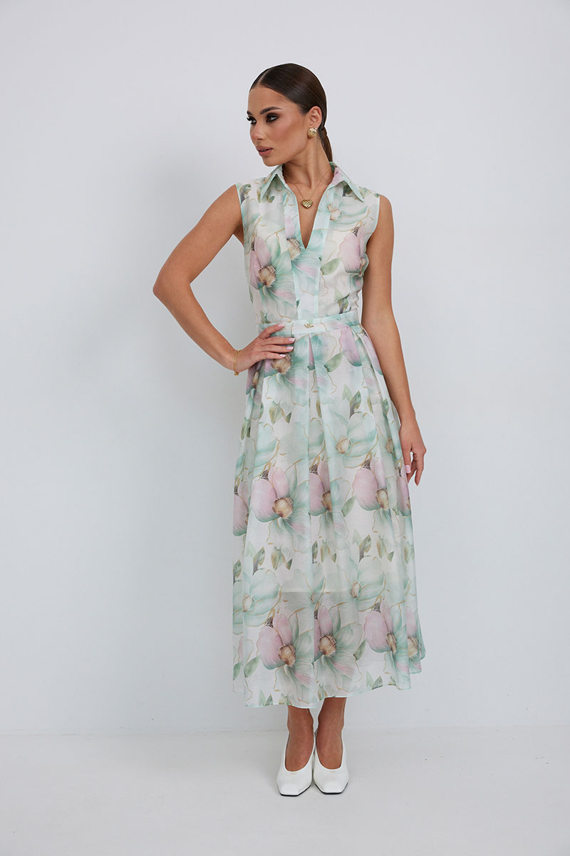 Платье из полупрозрачной ткани с принтом полуприлегающего силуэта длины «миди» расширенное к низу. По талии вставлен пояс, нижняя часть платья со встречными складками. Застежка-молния в боковом шве. По переду планка с вырезом. Воротник на стойке. Платье на подкладке.