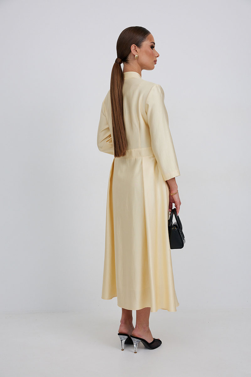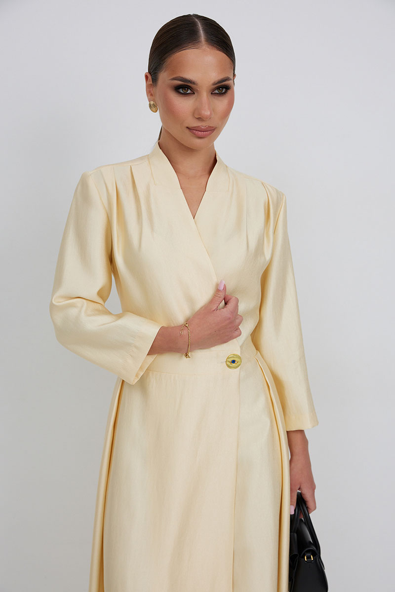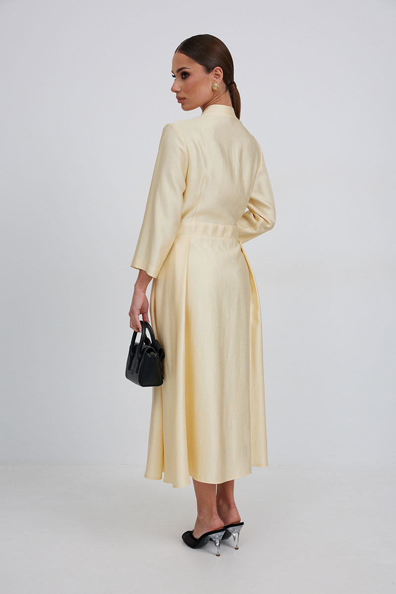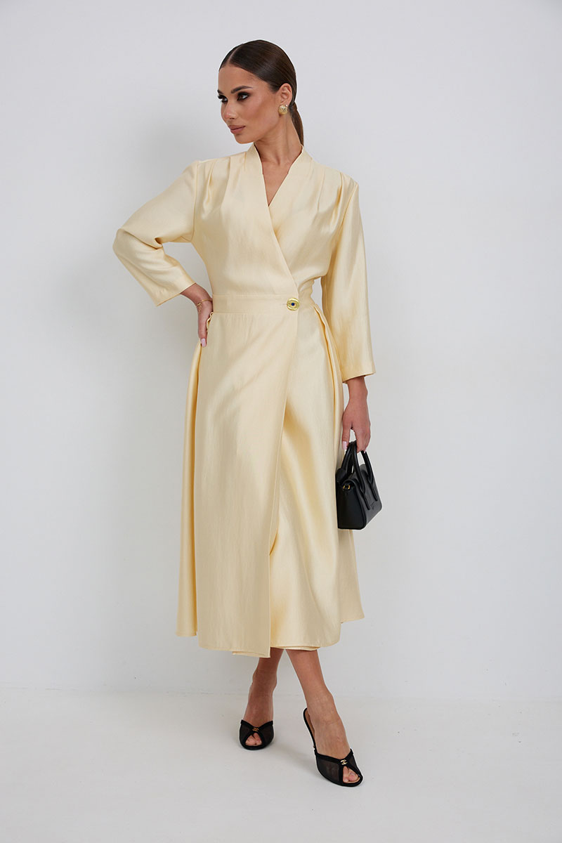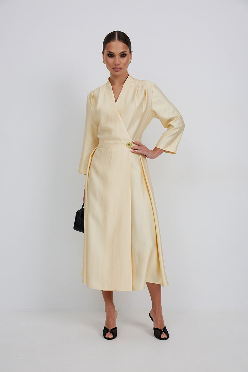 Платье на запах с отрезной линией талии. Длина миди. Вырез горловины V-образной формы. Застежка по талии на петлю и пуговицу. По переду складки от линии плеча. Юбка со складками. Рукав прямой, длина ¾.