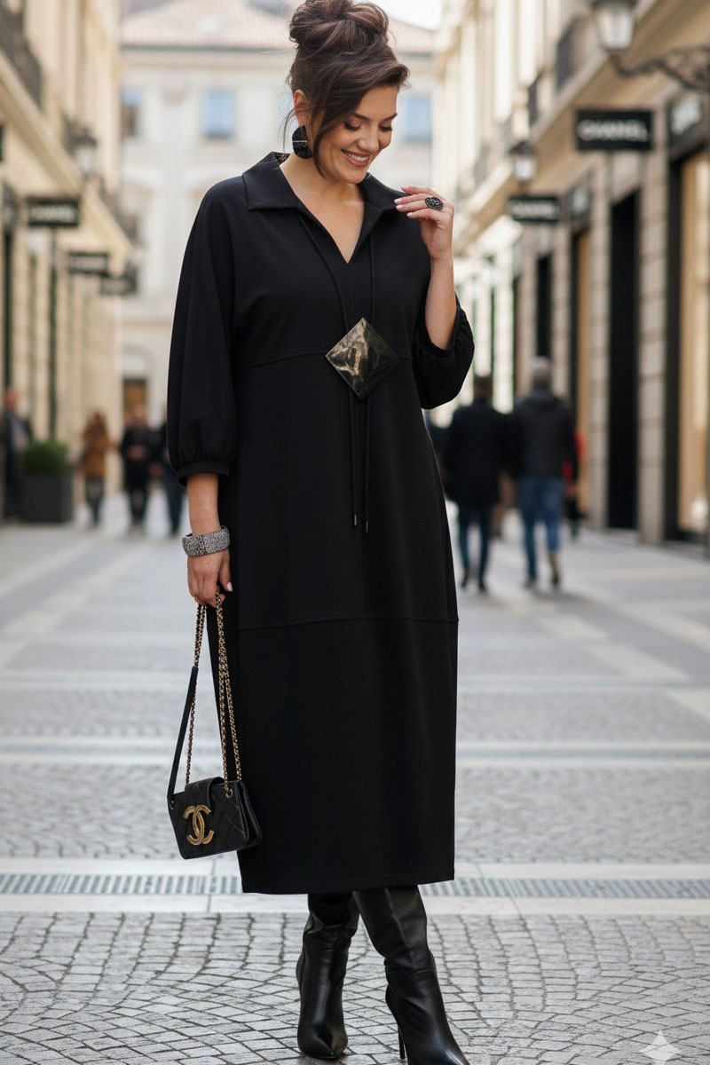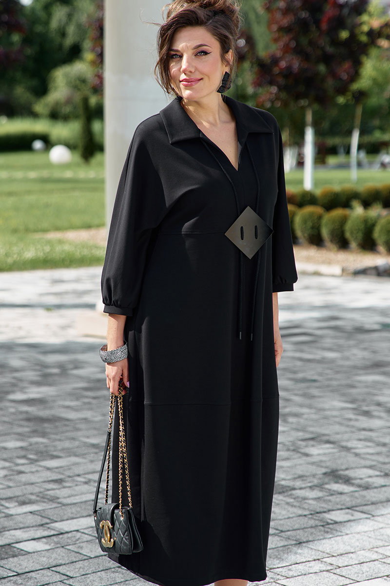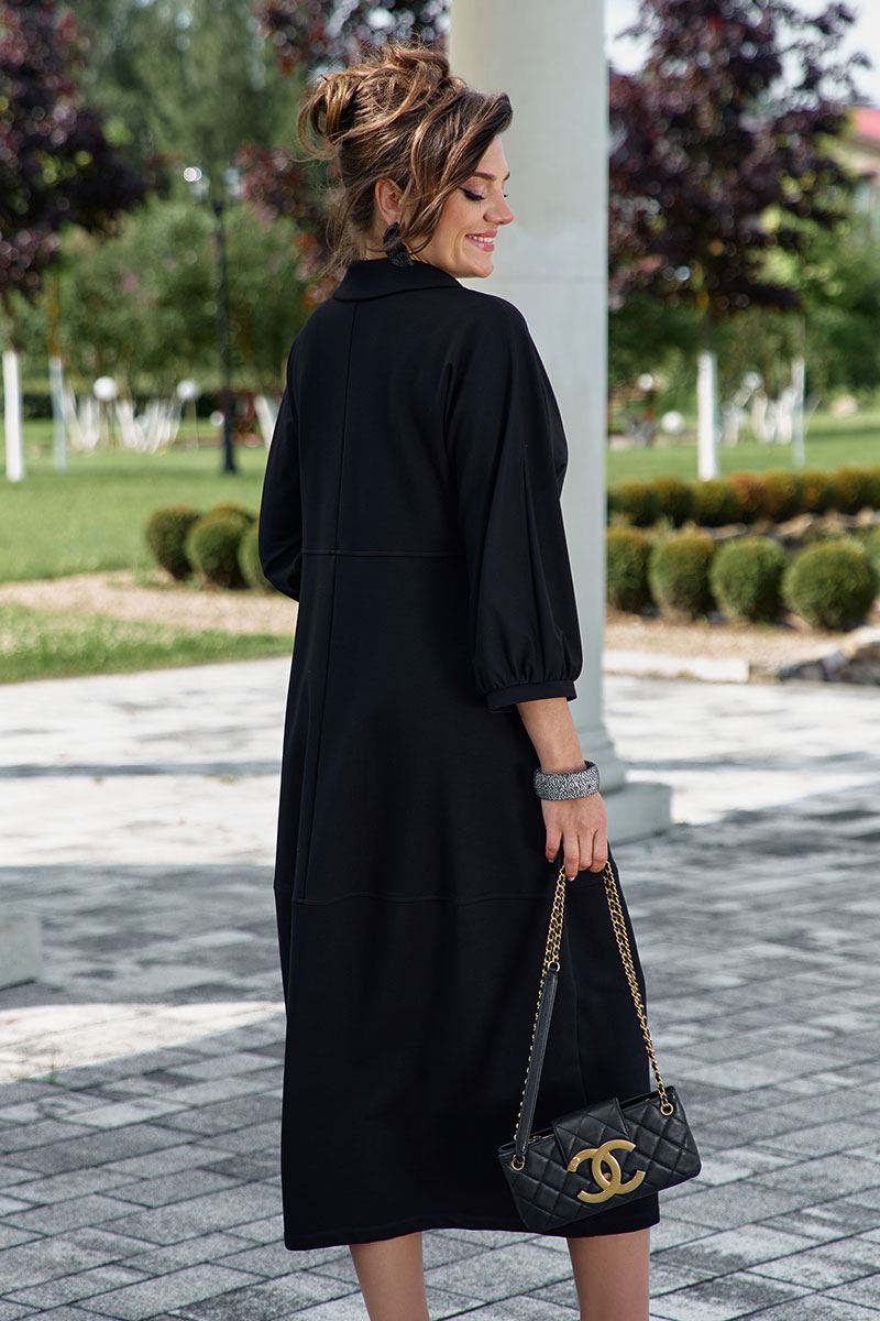 Представляем вашему вниманию элегантное платье миди в насыщенном чёрном оттенке, который актуален в любом сезоне. Выполненное из мягкой, струящейся ткани, оно обеспечивает приятные ощущения при носке и безупречную посадку. Свободный крой платья напоминающий собой форму «купола» слегка заужается к низу придает силуэту изящество и позволяет ему деликатно ниспадать по фигуре. V-образный вырез горловины, дополненный отложным воротником, придает платью классический и в то же время современный вид. Линия талии завышенная, лиф платья двойной, со средним швом. Рукав в платье цельнокроеный со сборкой на манжету, добавляют образу непринужденности и объема. Горизонтальный шов, расположенный примерно на уровне бедер, создает интересный структурный акцент. В боковых швах карманы. В качестве дополнительного декоративного элемента в комплекте с платьем идёт украшение ручной работы.