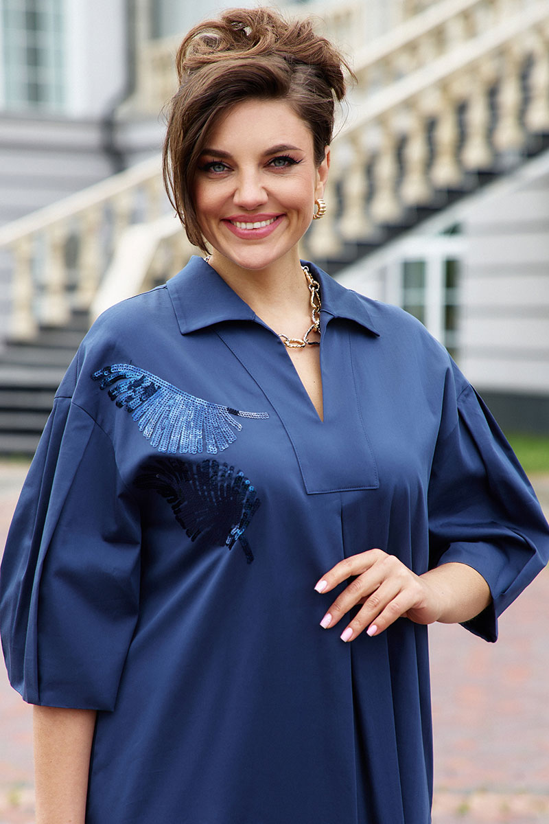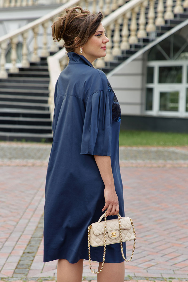 Однотонное платье имеет лёгкий блеск, переливается на свету. Левую часть плеча и груди украшает изысканная вышивка в тон. Длина миди делает его универсальным для различных мероприятий, а отсутствие четко выраженной талии позволяет платью мягко облегать фигуру. Платье А-силуэта, расширяется к низу, линия плеча спущенная. По переду платья вставка с плавным V- образным вырезом и широким отложным воротником. По переду платья застрачивается складка. По спинке платья притачная кокетка с застроченной складкой от подреза. Рукав втачной, в сгиб, с заложенными декоративными складками по окату и к низу. В боковых швах платья карманы. По низу платья широкая подгибка.