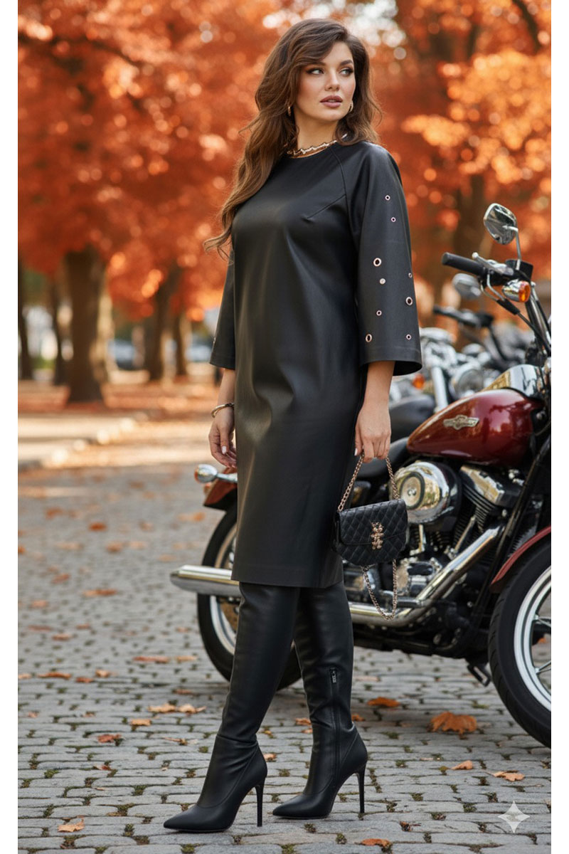 Платье полуприлегающего силуэта с округлой формой горловины. По переду платья нагрудные вытачки. По спинке застёжка на декоративную тесьму молнию в среднем шве платья и разрезом от низа. Рукава становятся главным акцентом: ряд люверсов и кнопок, выстроенных словно доспехи, придают образу дерзкий, почти урбанистический шик. Рукав в платье реглан, расширяется к низу, длиной 7/8. В боковых швах платье карманы.