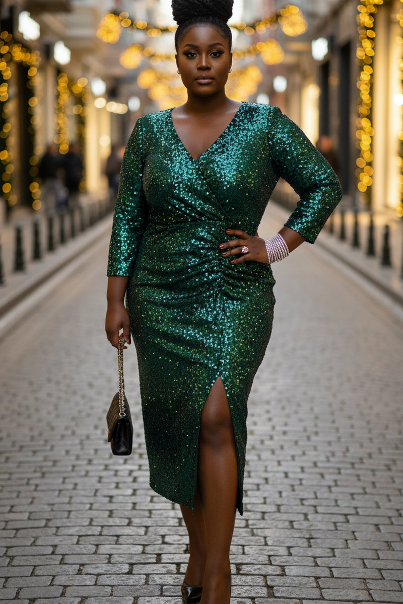 Это вечернее платье изумрудно-зеленого цвета в пайетку, с мерцающим эффектом- завораживают! Пайетки позволяют своей обладательнице выделиться из толпы, привлечь восхищенные взгляды и быть в центре внимания на любом мероприятии. Платье прилегающего силуэта, длины миди. По переду платья фигурный подрез по талии, V-образный вырез по горловине, а также вертикальный рельеф со сборкой переходящий в разрез от низа, который добавляет образу динамики. Рукав в платье втачной, длиной 7/8. По спинке платья талиевые вытачки. На талии по переду платья ткань слегка присобрана, что подчеркивает фигуру. Это платье - отличный выбор для праздничных мероприятий или вечеринок. Платье на подкладке.