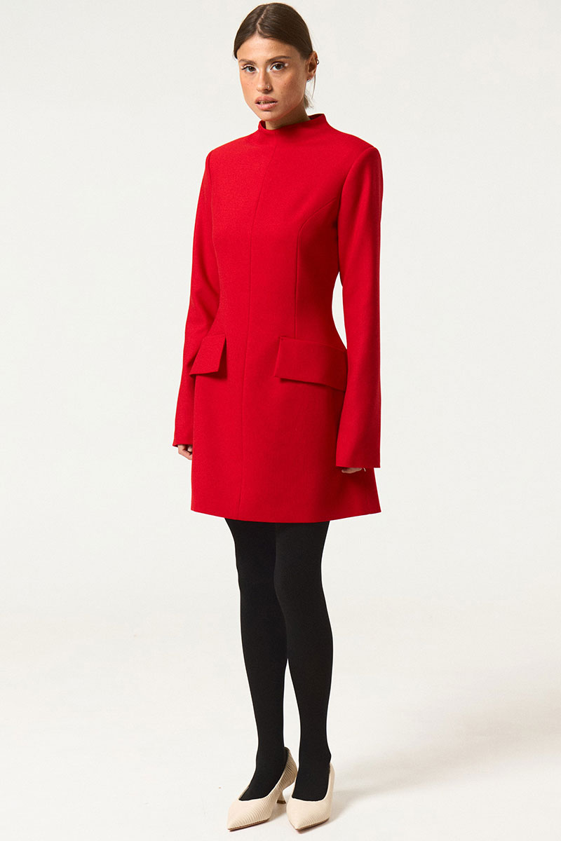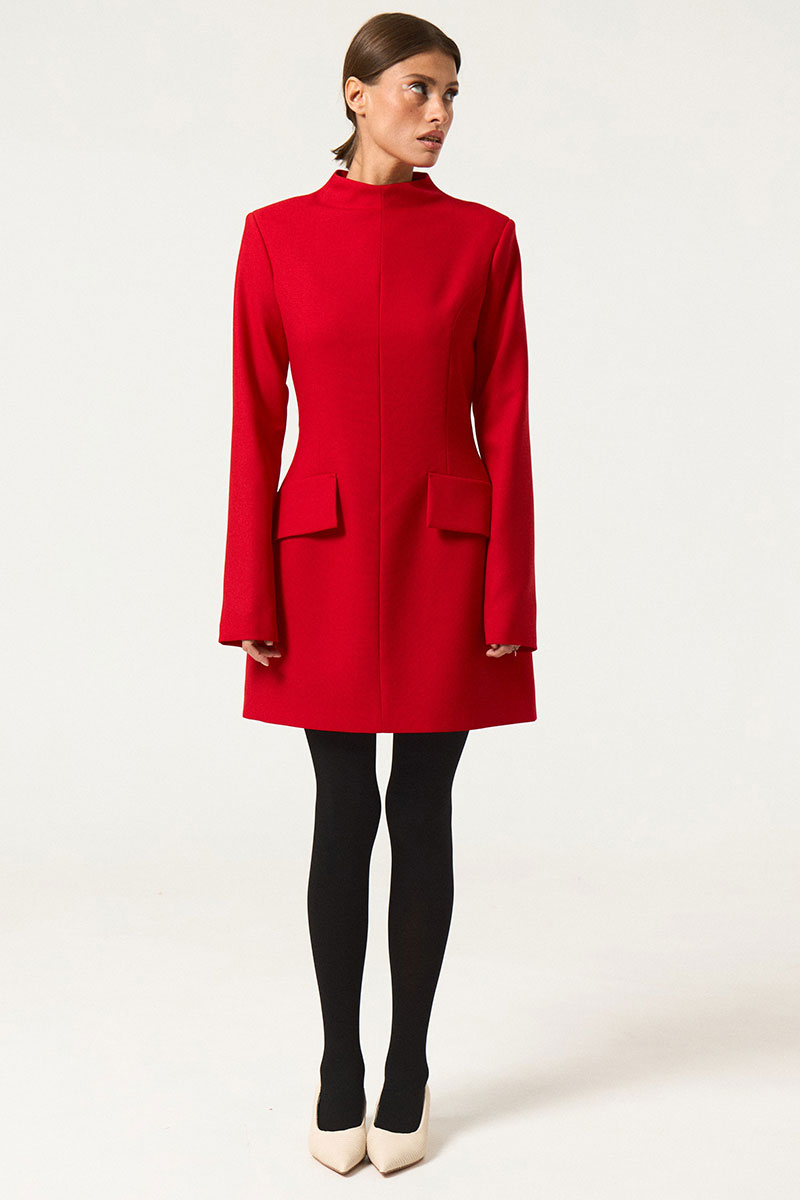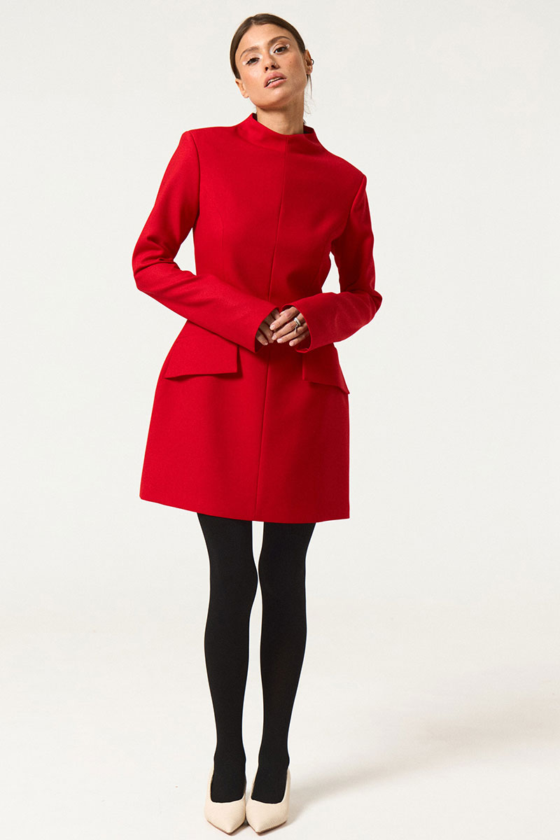 Платье приталенного силуэта с объемной юбкой и удлиненными рукавами. Рукав втачной, с расклешением к низу. Воротник – стойка. Платье без подкладки. В заднем среднем шве потайная молния.