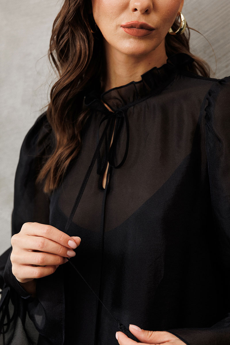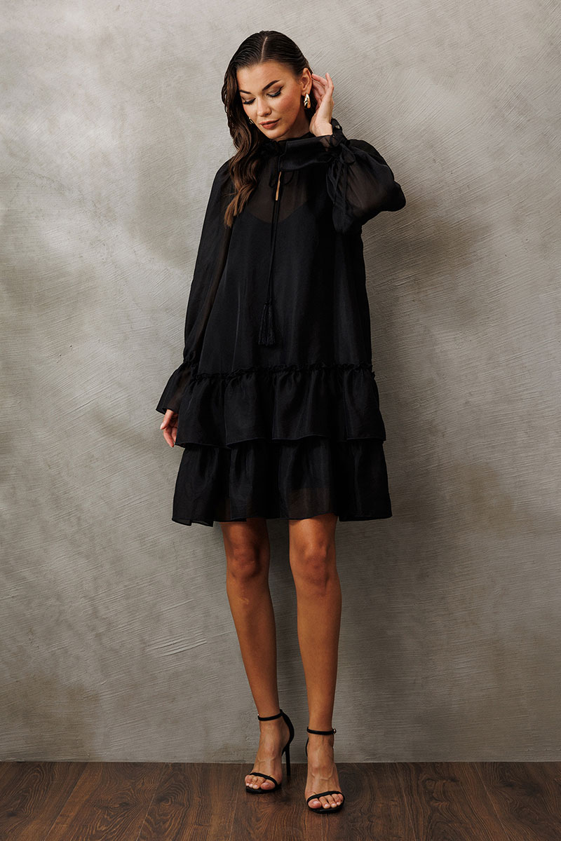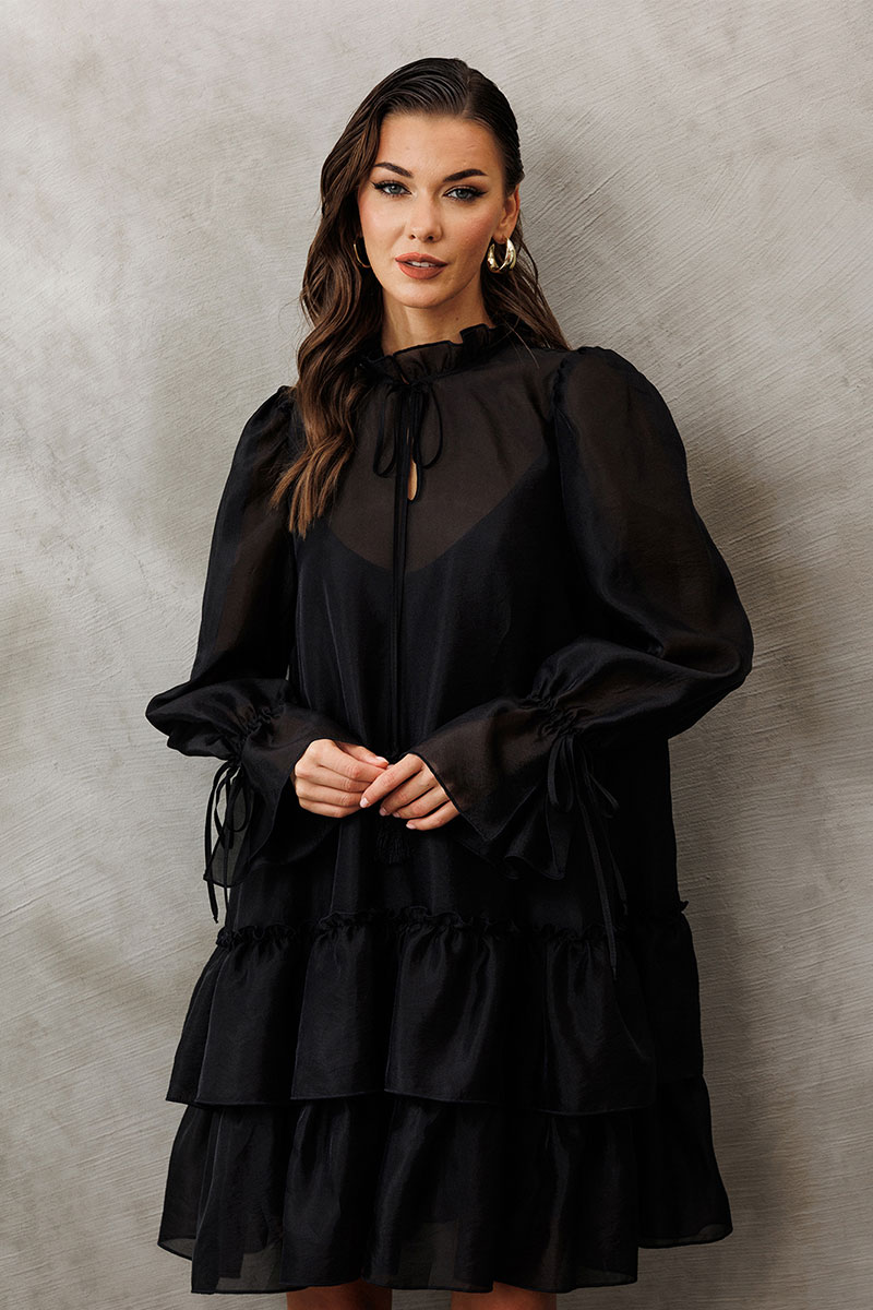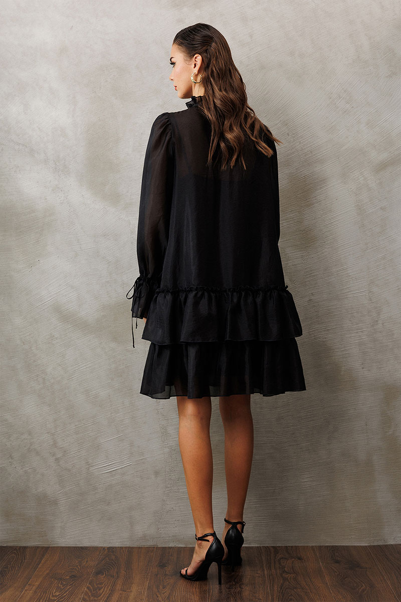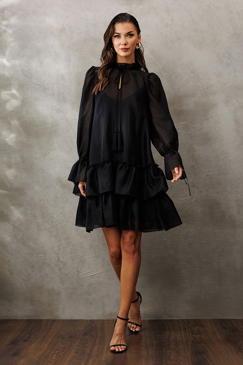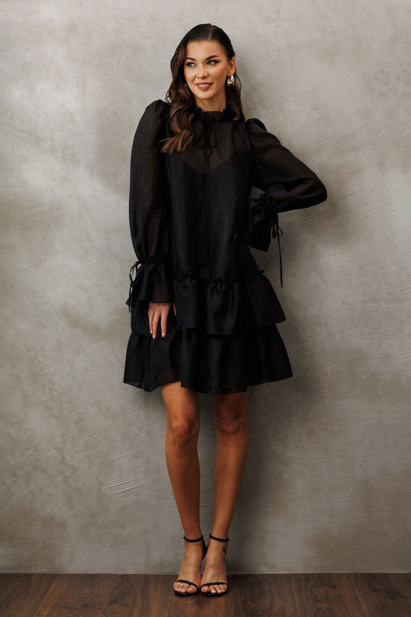 Платье из креп-шифона с напылением А-силуэта, состоящее из 2 слоев. Верхний слой: Втачной длинный рукав со сборкой по окату и внизу на завязке, полочка и спинка с притачными слегка присборенным воланом с рюшей,в оротник стойка-рюша и вырезом каплей по переду на завязке. Нижний слой: платье на бретелях.