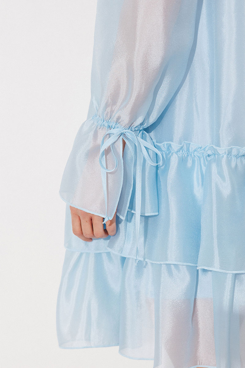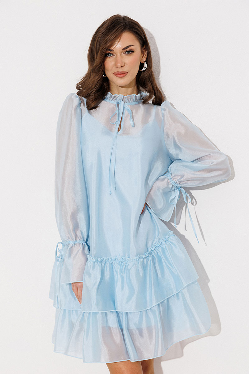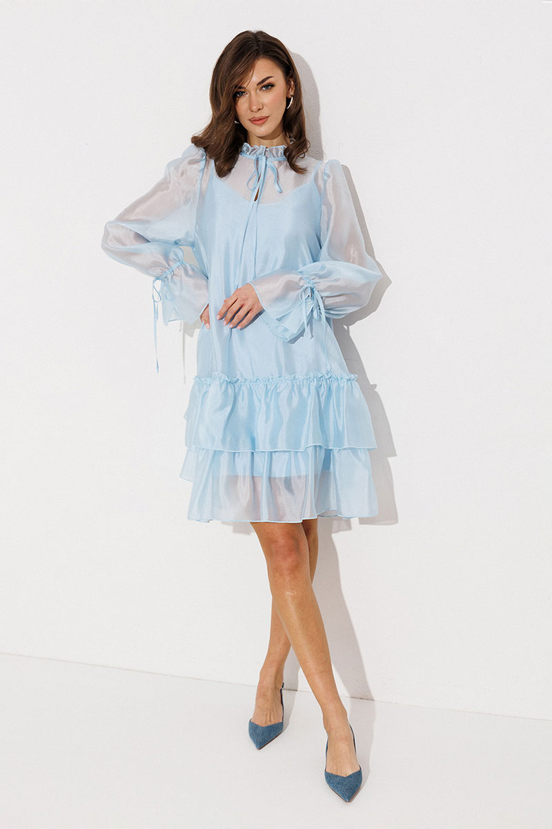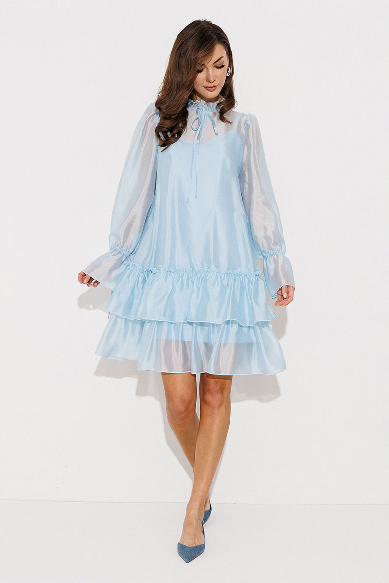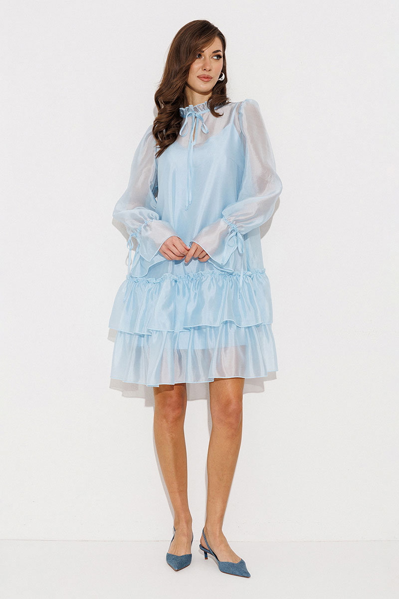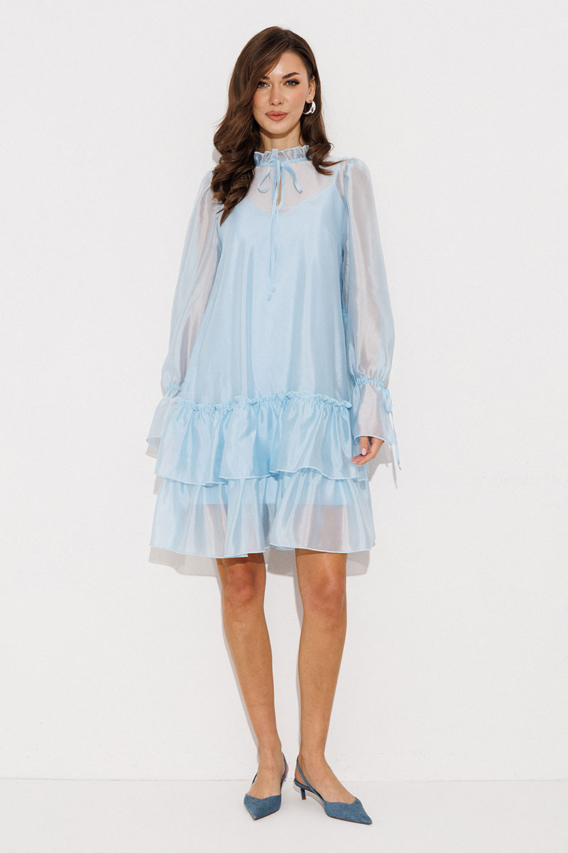 Платье А-силуэта, состоящее из 2 слоев. Верхний слой: втачной длинный рукав со сборкой по окату и внизу на завязке, полочка и спинка с притачными слегка присборенным воланом с рюшей, воротник стойка-рюша и вырезом каплей по переду на завязке. Нижний слой: платье на бретелях с вытачками по переду на груди.