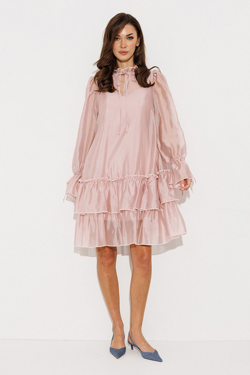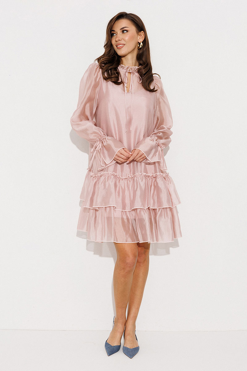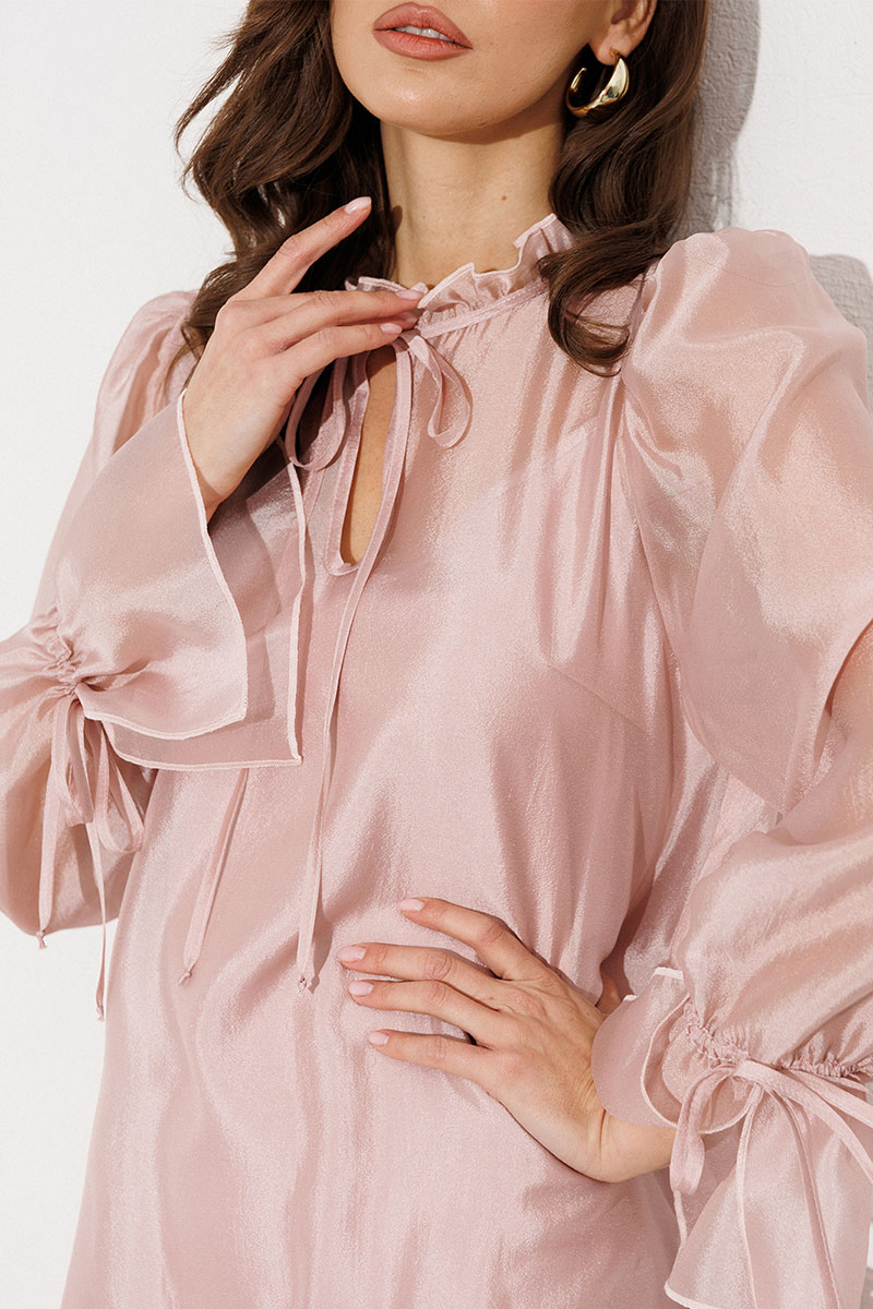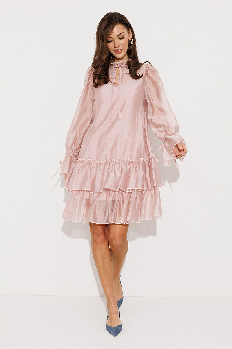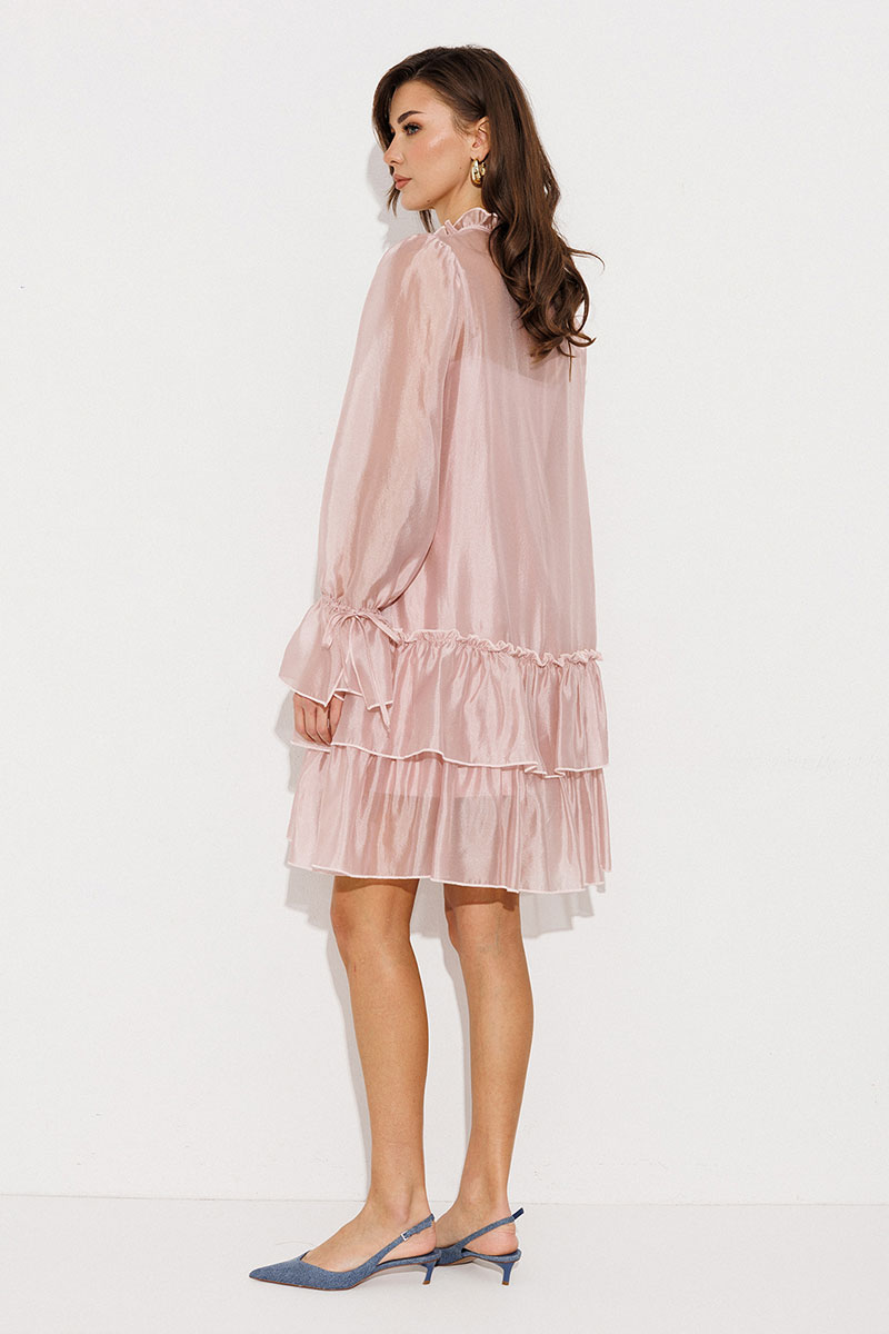 Платье А-силуэта, состоящее из 2 слоев. Верхний слой: втачной длинный рукав со сборкой по окату и внизу на завязке, полочка и спинка с притачными слегка присборенным воланом с рюшей, воротник стойка-рюша и вырезом каплей по переду на завязке. Нижний слой: платье на бретелях с вытачками по переду на груди.