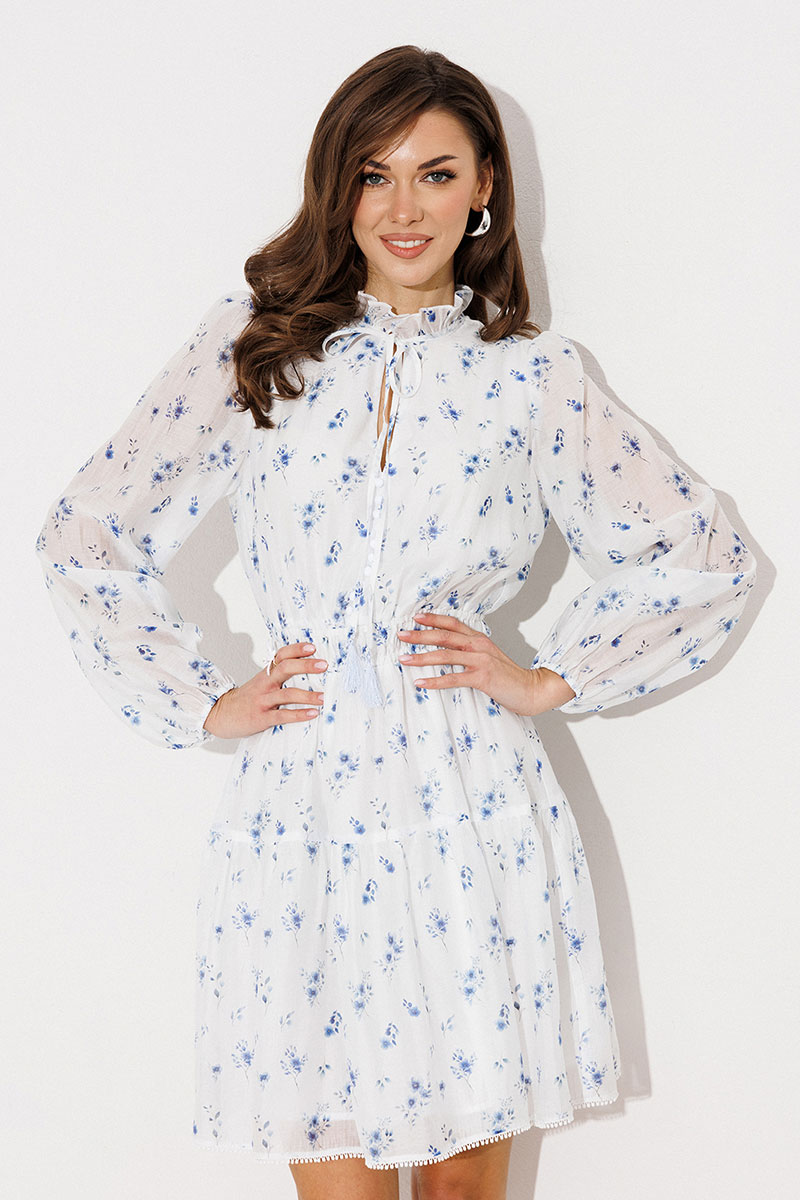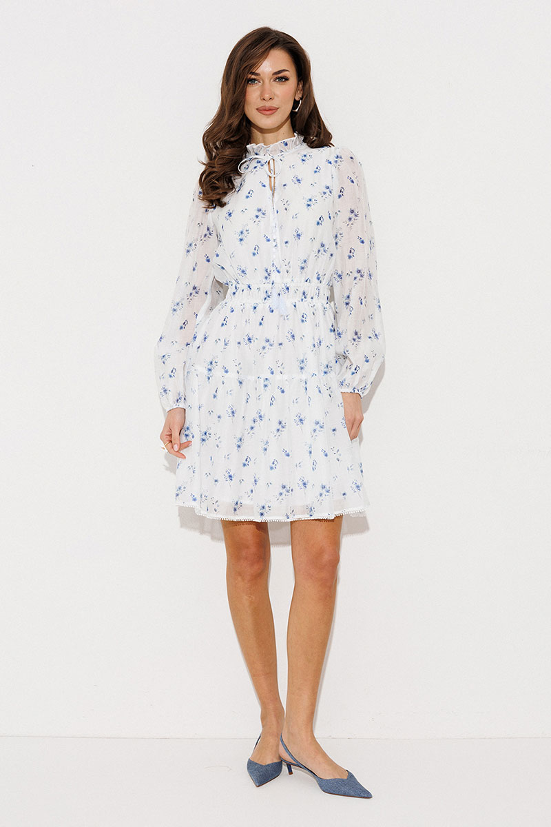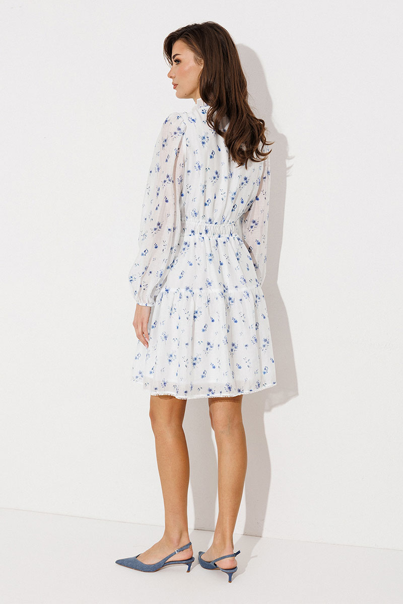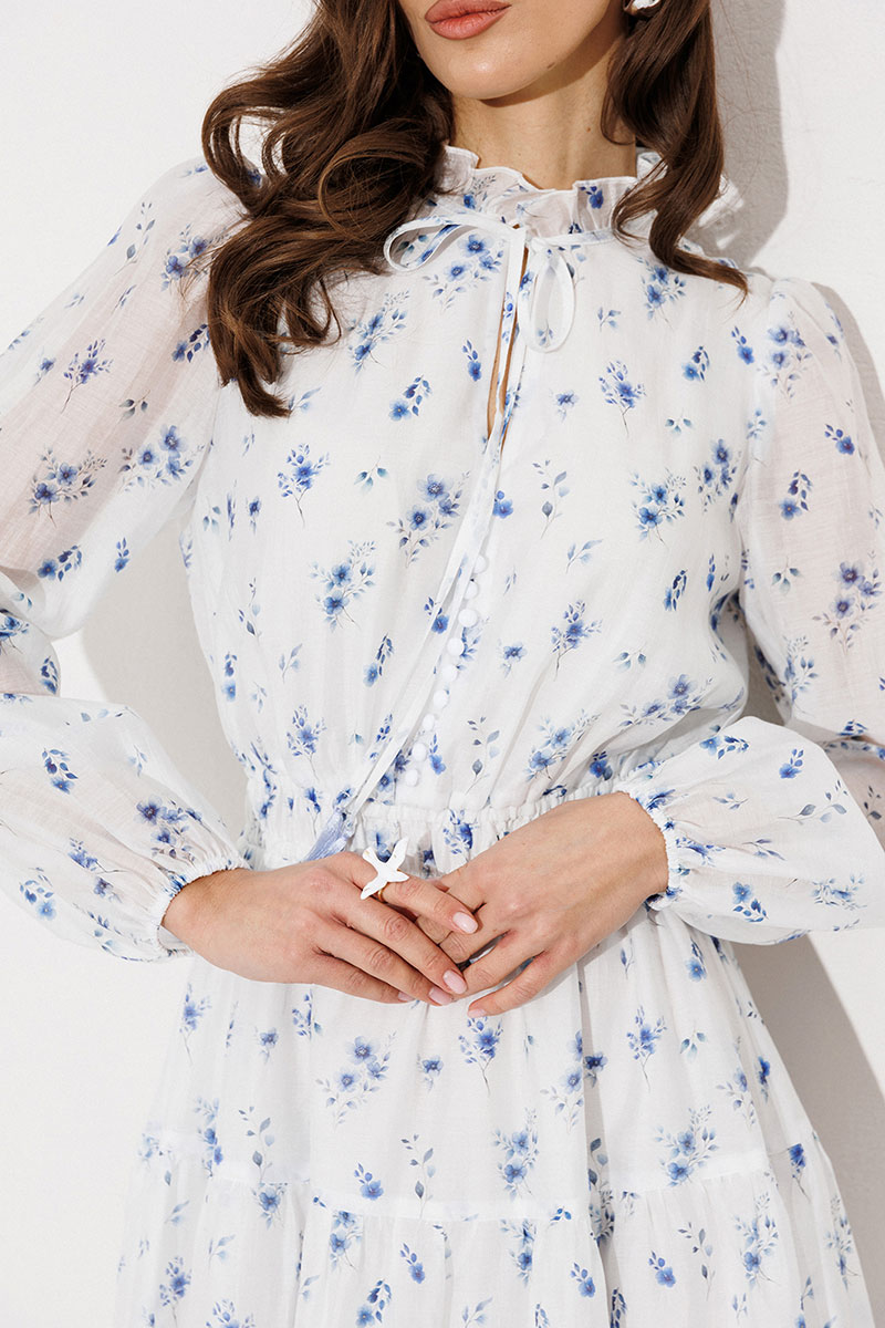 Платье полуприлегающего силуэта отрезное по линии талии, нижняя часть расширена, с воланом по низу. Платье с втачным рукавом со сборкой по окату и внизу на резинке. Лиф с V-образным вырезом и имитацией центральной застежкой на пуговицы. По спинке и переду вставка на талии с резинками. По горловине стойка с рюшей, которая завязывается по переду. Платье на подкладке.