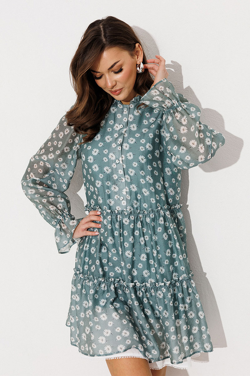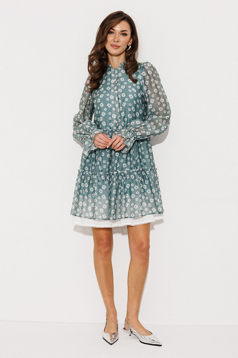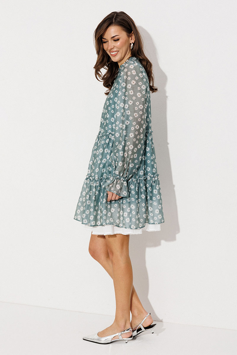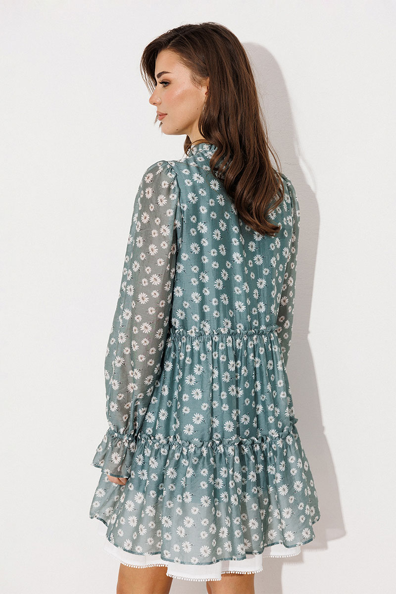 Платье шифоновое А-силуэта, отрезное по линии талии с рюшей. Втачной длинный рукав со сборкой по окату и внизу на резинке. По переду лиф с центральной застежкой на петли-пуговицы. Полочка и спинка с притачными слегка присборенным воланом с рюшей из основной ткани и воланом из отделочной ткани с пришитым к нему кружевом по низу платья. Воротник стойка с рюшей. Платье на подкладке.