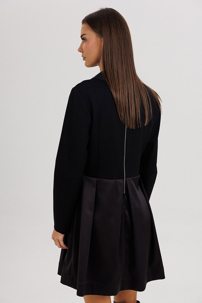 Лиф платья выполнен с талиевыми и нагрудной вытачкой, обеспечивая идеальную посадку, а юбка из гладкого атласа с мягкими складками создаёт лёгкий объём и женственный силуэт. На спинке — застёжка на отделочную молнию, добавляющая современный штрих.