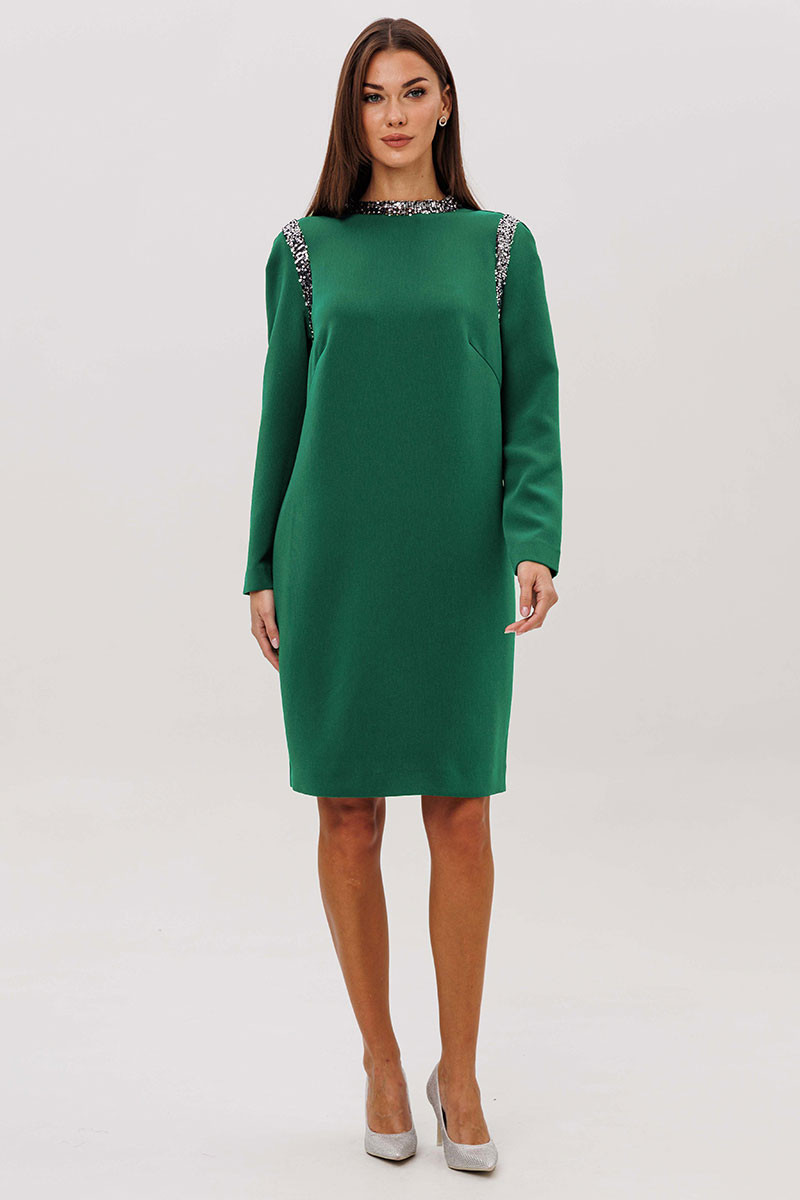 Свободный упрямленный силуэт, покрой-полуреглан, воротник-стойка, застежка по центру спинки на потайную молнию. По линиям пройм на полочке и спинке, стойка из отделочного полотна в пайетку. Полочка с нагрудной вытачкой.