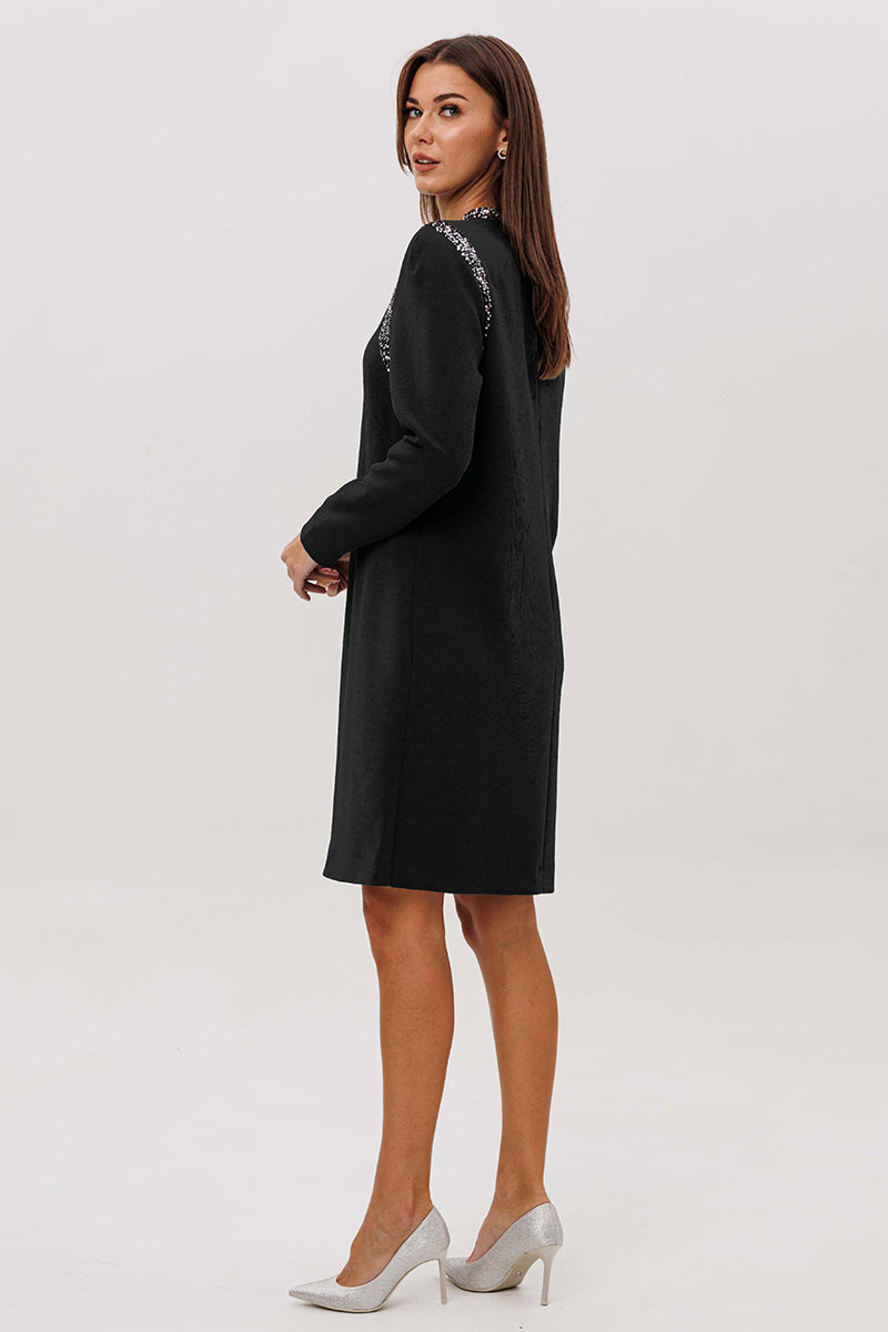 Свободный упрямленный силуэт, покрой-полуреглан, воротник-стойка, застежка по центру спинки на потайную молнию. По линиям пройм на полочке и спинке, стойка из отделочного полотна в пайетку. Полочка с нагрудной вытачкой.