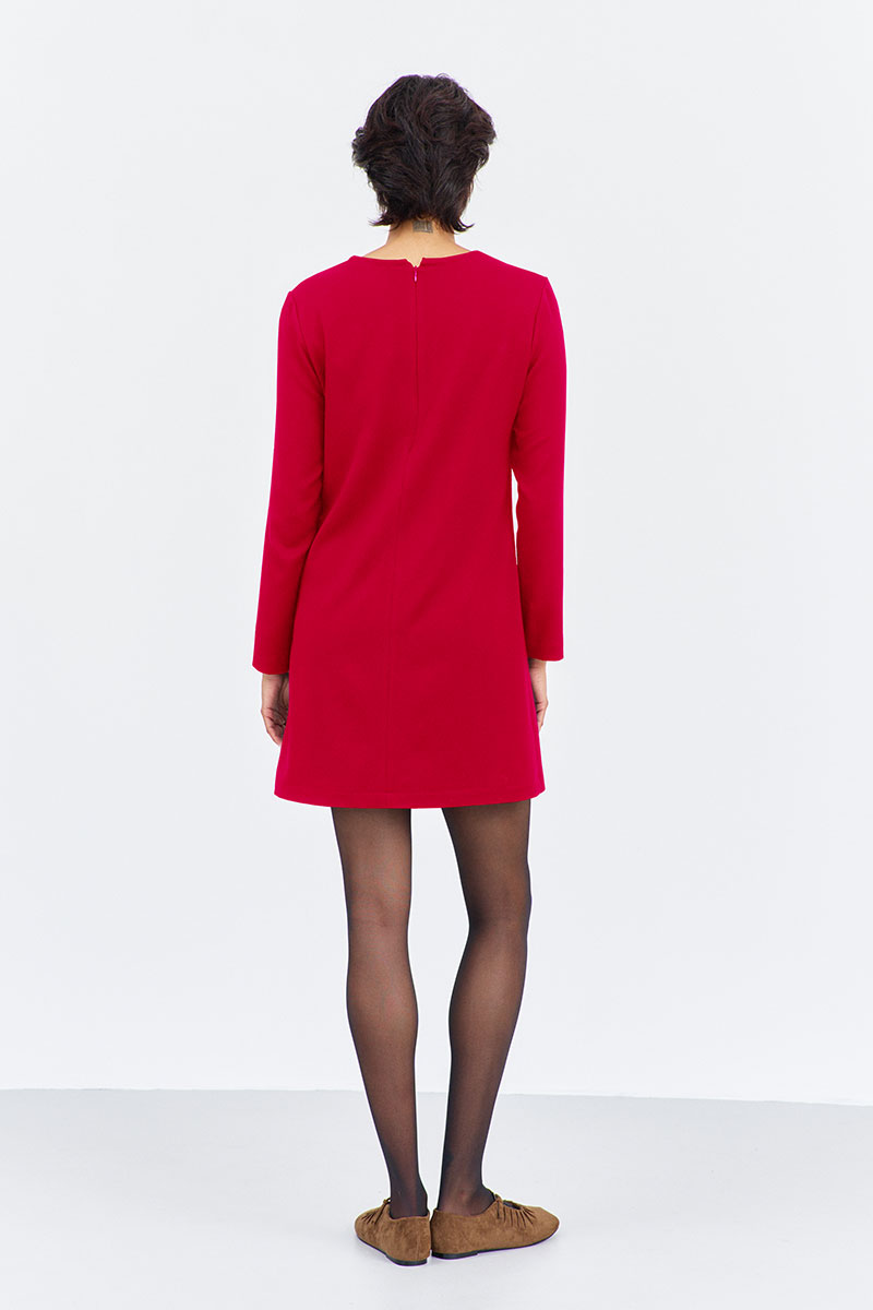 Платье прямого силуэта. Характеристики: выполнено из плательной ткани в красном цвете, по горловине переда и спинки декоративный элемент с цепочкой и подвеской, спинка разрезная на потайную застежку-молнию.