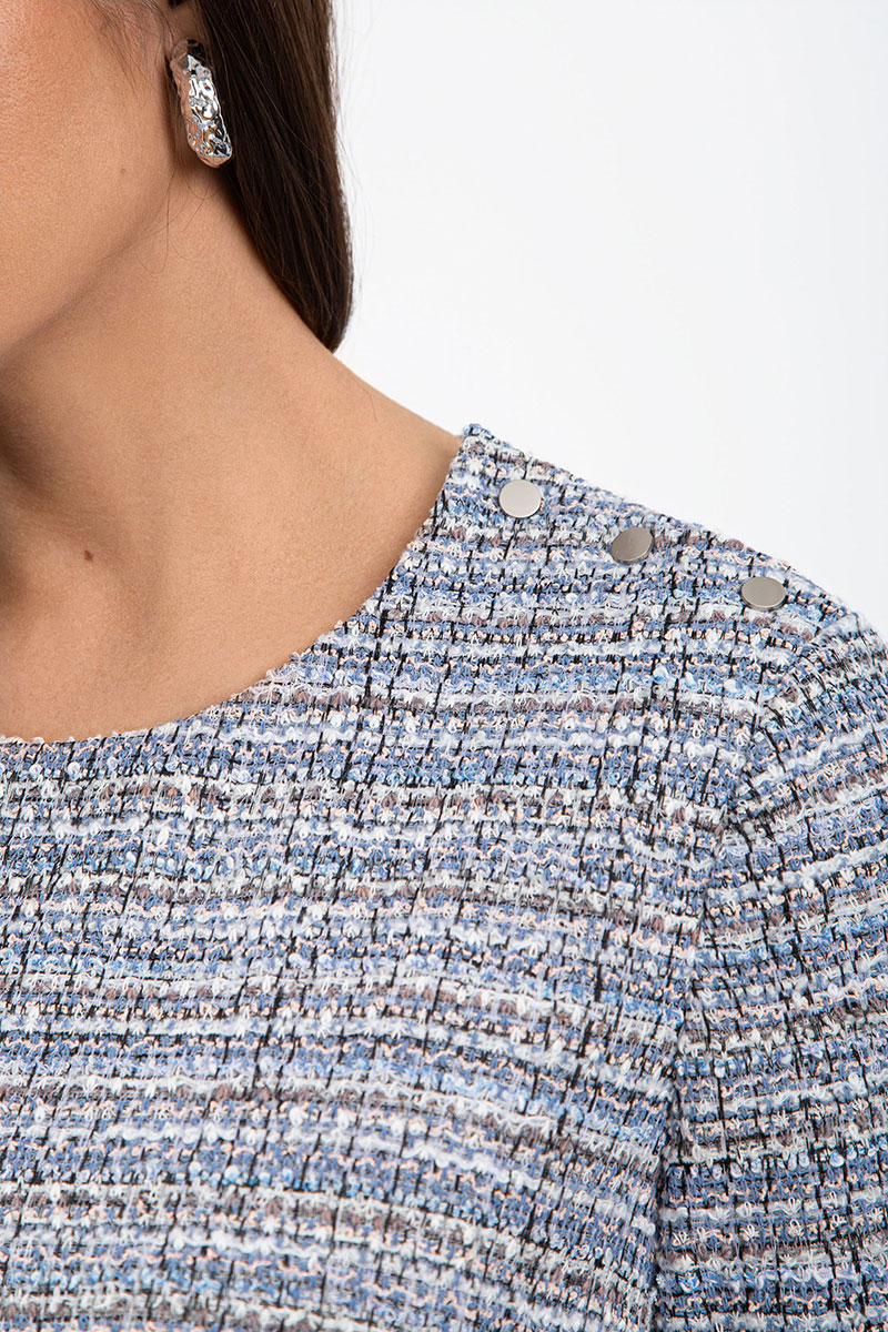 Платье с застежкой на потайную молнию в среднем шве спинки, без воротника, с круглым вырезом горловины, и доплнительной застежкой на петли и пуговицы по левому плечевому шву. По переду с нагрудными вытачками. На уровне линии бедер расположены отделочные клапаны, зафиксированные к платью петлей и пуговицей. Спинка со средним швом, талиевыми вытачками. Рукав втачной, 3/4.