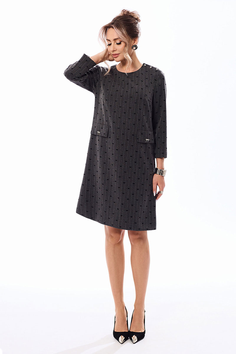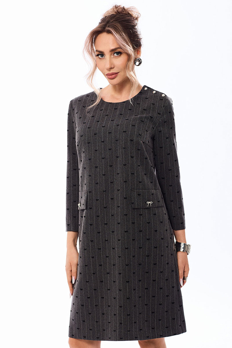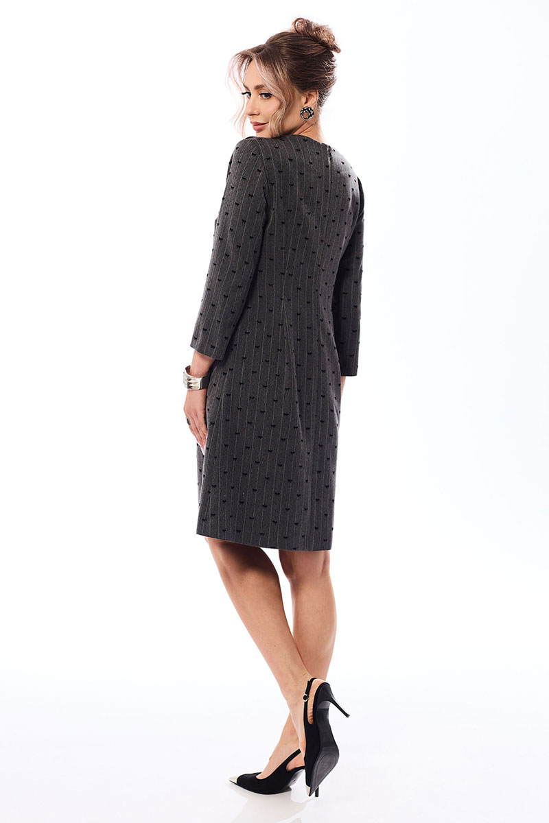 Платье с застежкой на потайную молнию в среднем шве спинки, без воротника, с круглым вырезом горловины, и дополнительной застежкой на петли и пуговицы по левому плечевому шву. По переду с нагрудными вытачками. На уровне линии бедер расположены отделочные клапаны, зафиксированные к платью петлей и пуговицей. Спинка со средним швом, талиевыми вытачками. Рукав втачной, 3/4.