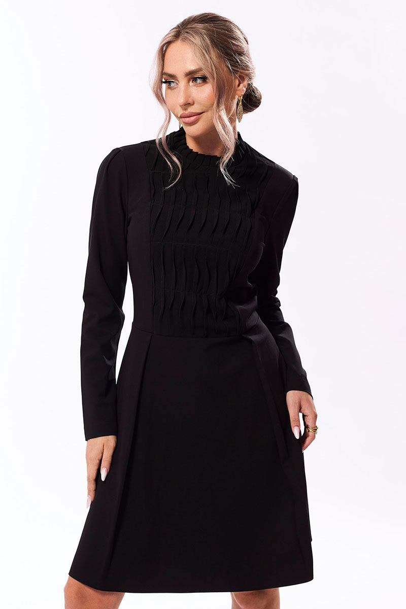 Платье полуприлегающего силуэта, с застежкой на потайную молнию в среднем шве спинки, с отрезным воротником- стойкой, заложенным в односторонние складки. Платье отрезное по линии талии. Верхняя часть переда с рельефами, выходящими из плеча. Центральная часть переда с декоративными защипами .Спинка со средним швом, рельефами, выходящими из плеча. Рукав втачной, длинный. Нижняя часть платья расширенная к низу
