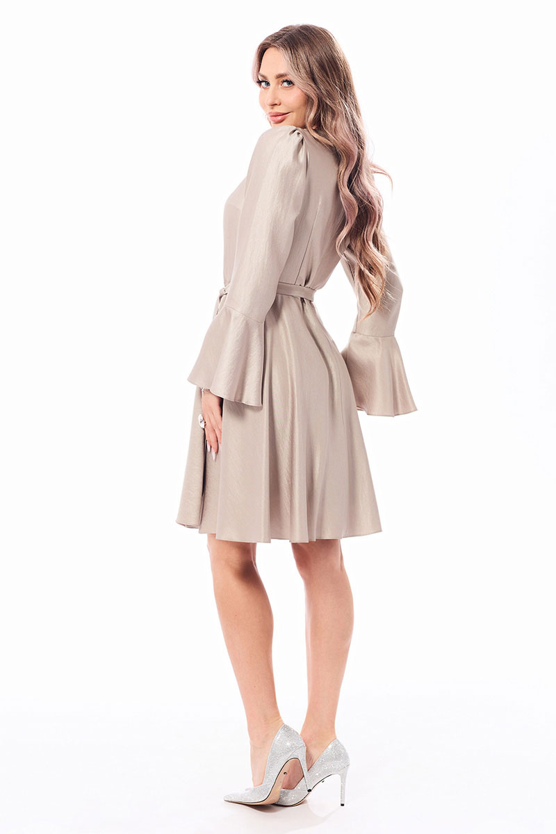 Платье без воротника, с круглым вырезом горловины, застежкой на потайную молнию в среднем шве спинки. Платье отрезное по линии талии. Лиф переда с талиевыми и нагрудными вытачками. Нижняя часть платья расклешенная. Спинка со средним швом, талиевыми вытачками. Рукав втачной, длинный, с отрезной манжетой. Окат рукава со сборкой. Манжеты расширенные к низу. Платье со съемным поясом. На талии расположены шлевки для съемного пояса.
