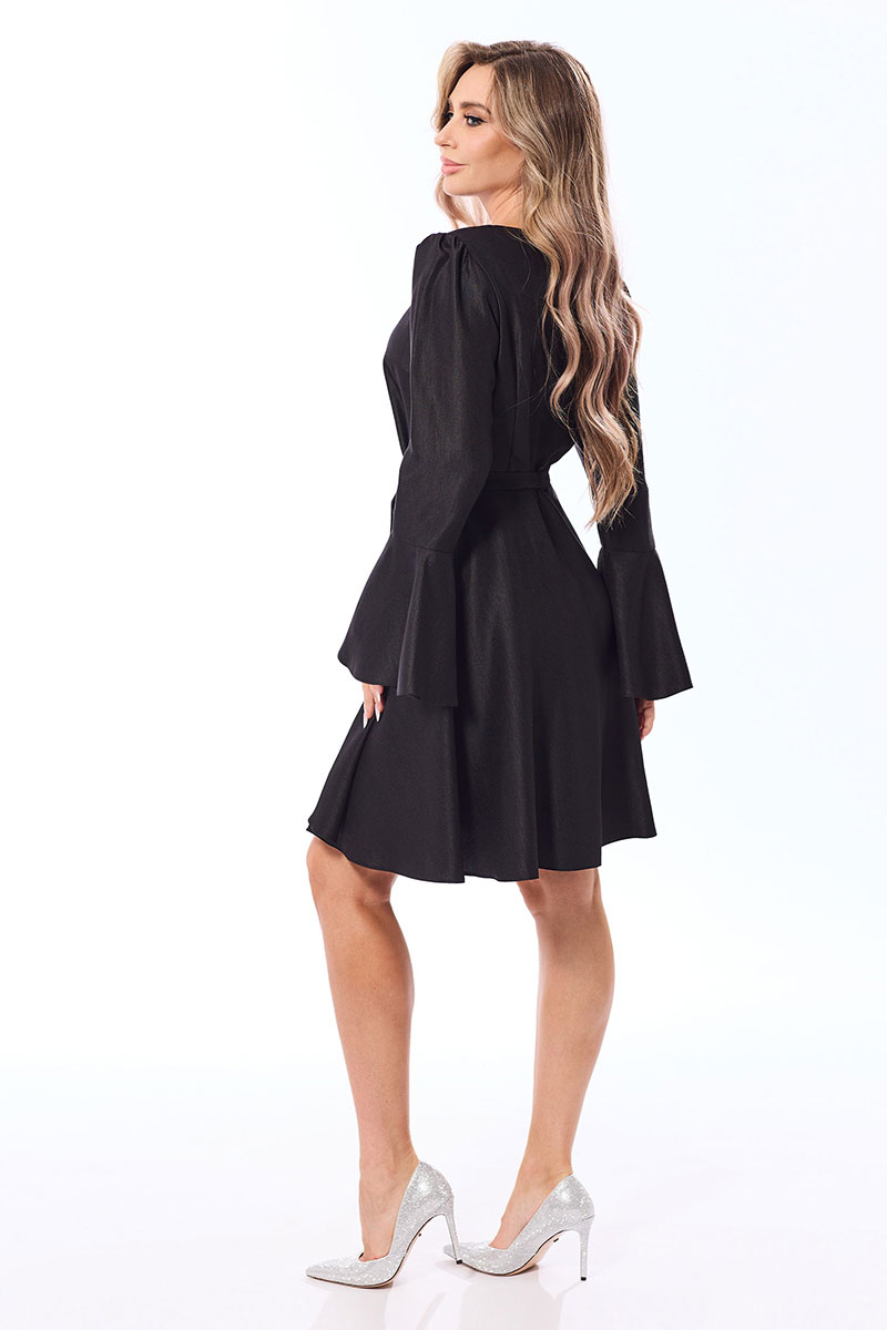 Платье без воротника, с круглым вырезом горловины, застежкой на потайную молнию в среднем шве спинки. Платье отрезное по линии талии. Лиф переда с талиевыми и нагрудными вытачками. Нижняя часть платья расклешенная. Спинка со средним швом, талиевыми вытачками. Рукав втачной, длинный, с отрезной манжетой. Окат рукава со сборкой. Манжеты расширенные к низу. Платье со съемным поясом. На талии расположены шлевки для съемного пояса.