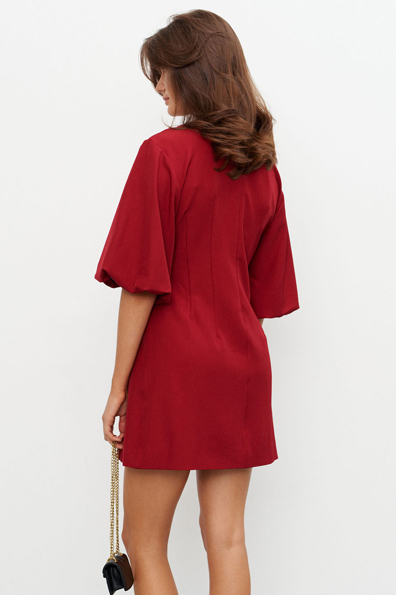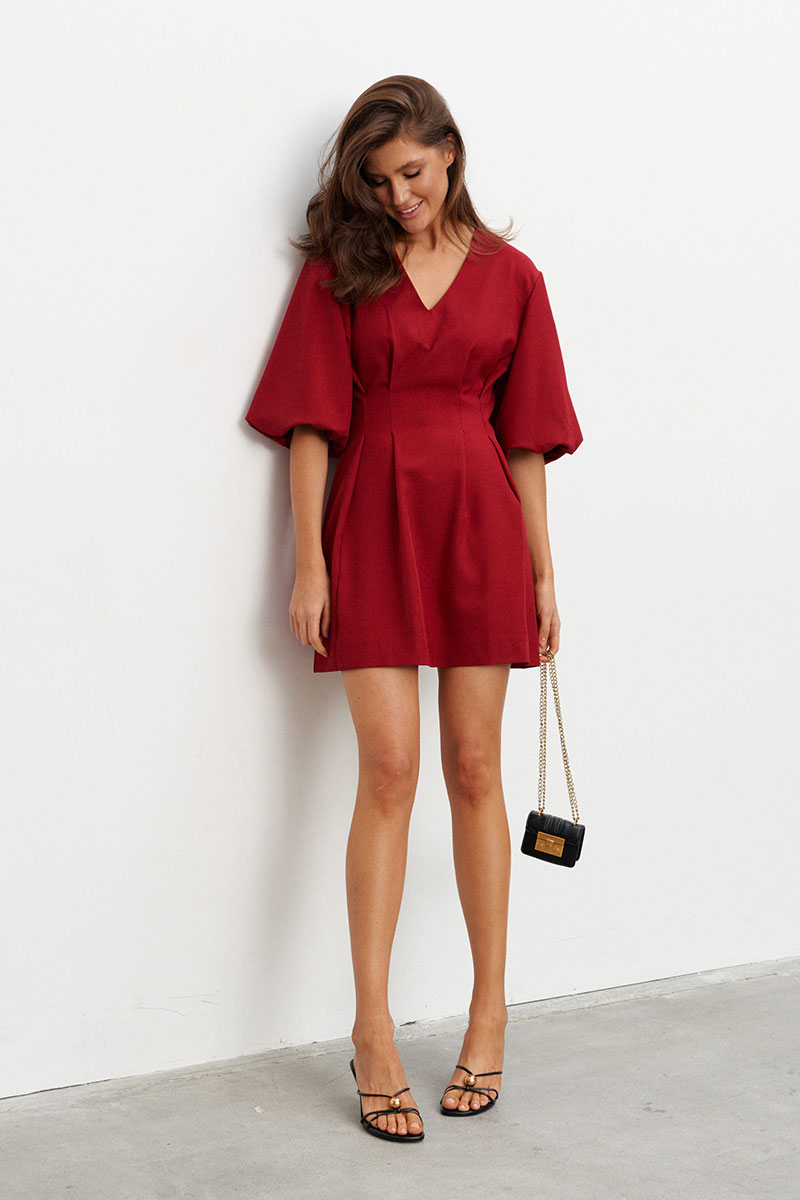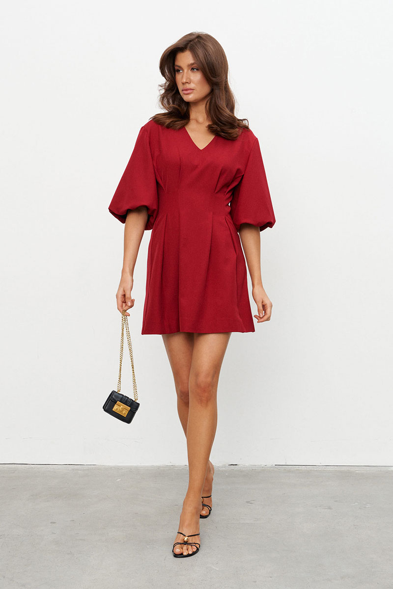 Платье со спущенной линией плеча и пышным рукавом-фонариком, приталенное с застроченными складками в области талиипо переду и с вытачками по спине, юбка расклешенная. Вырез горловины V-образный. Застежка на потайную молнию сзади.