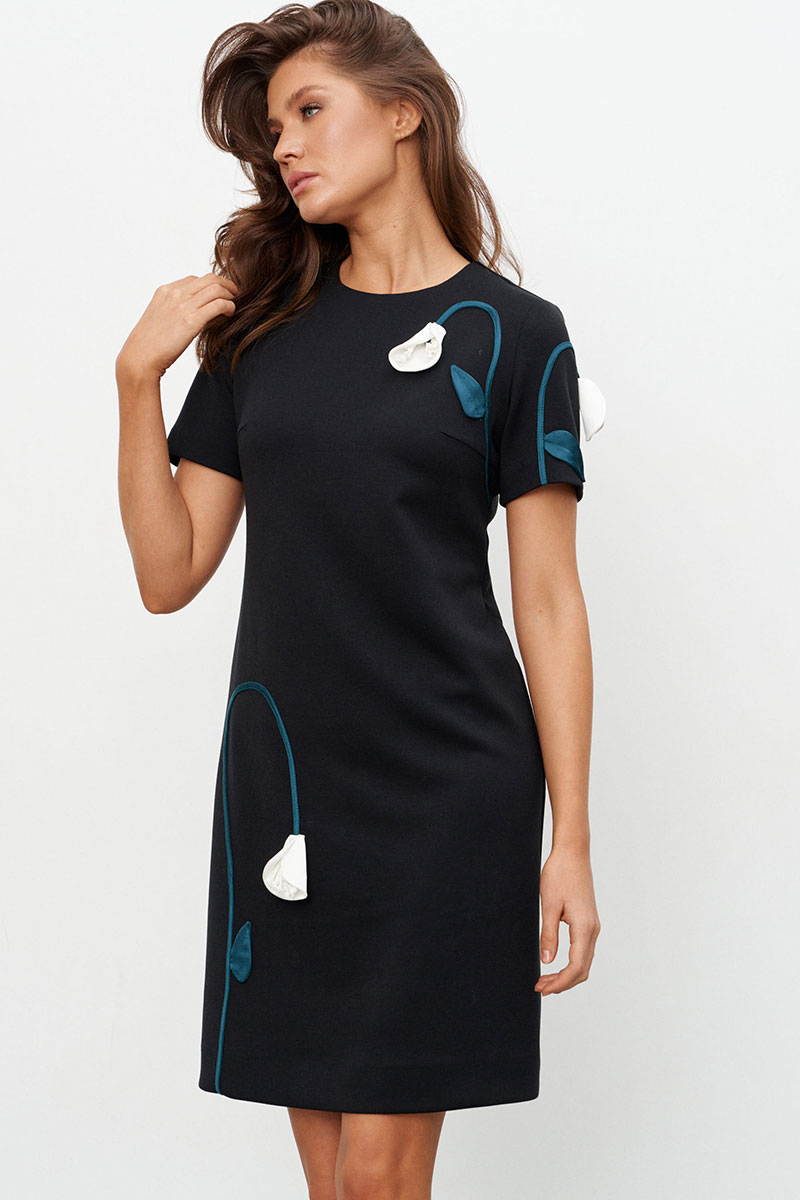 Платье из трикотажного полотна прилегающего силуэта с коротким, втачным рукавом. Длина платья выше колена. Перед изделия задекорирован контрастными, текстильными цветами. Сзади разрез и застёжка на потайную молнию.