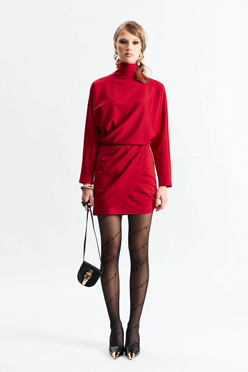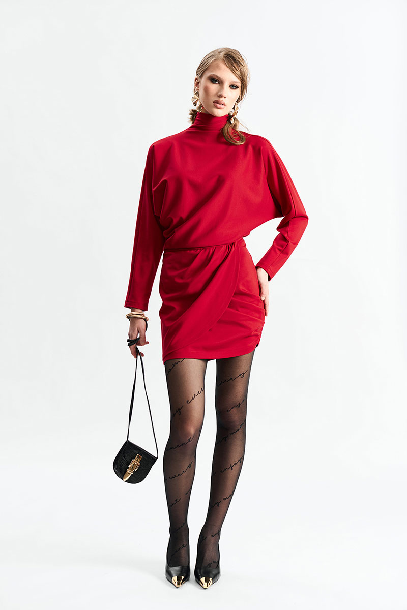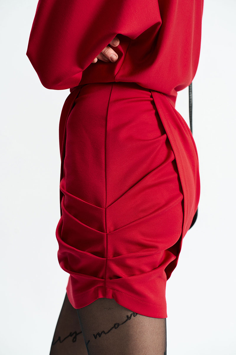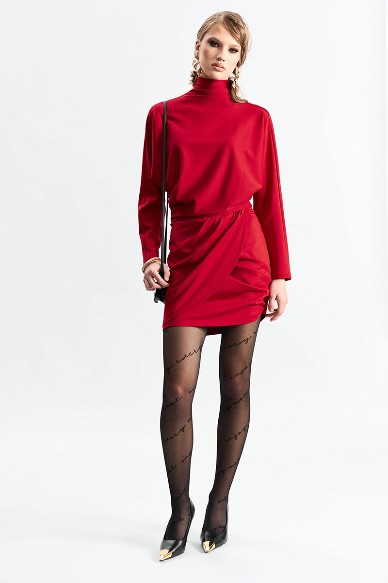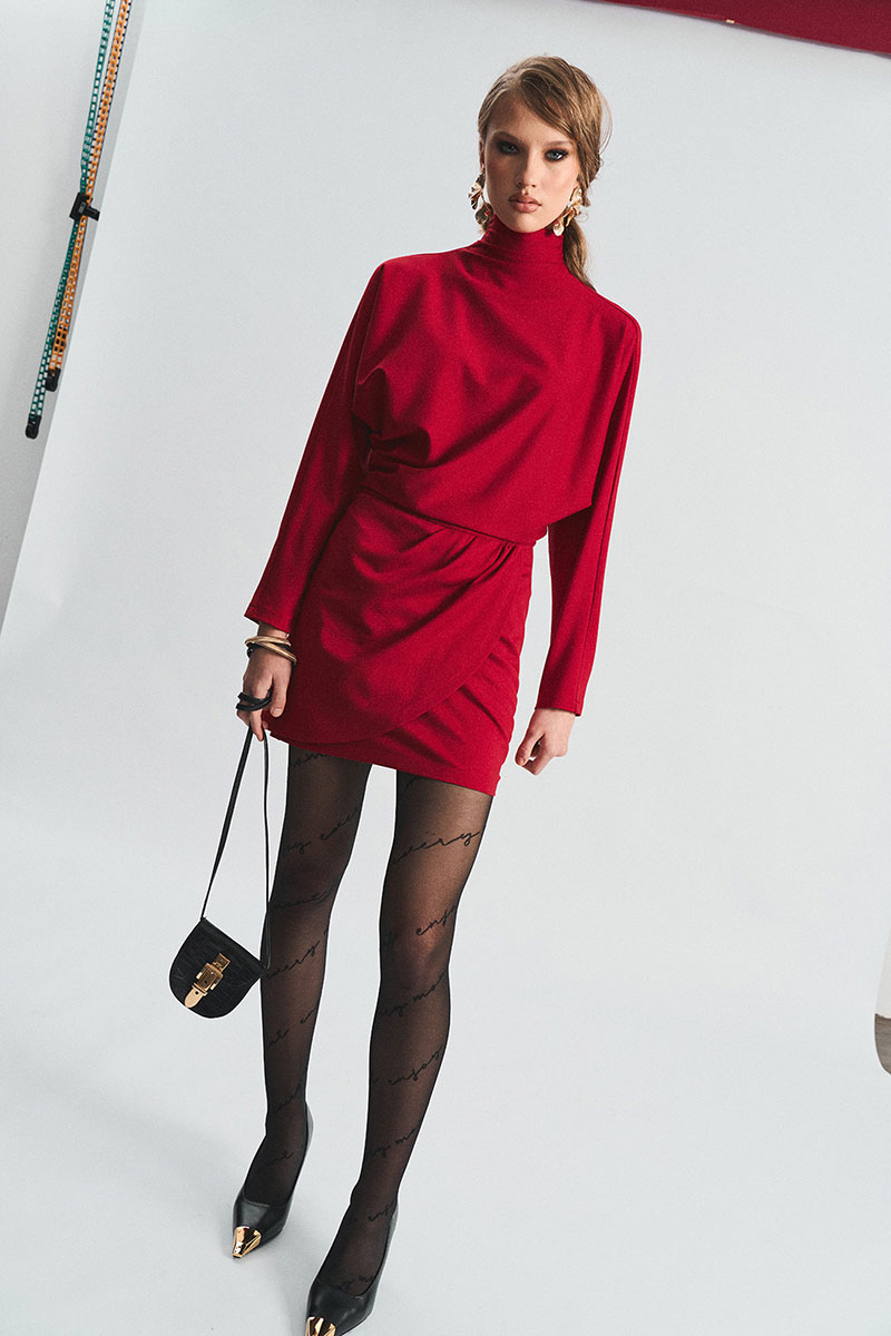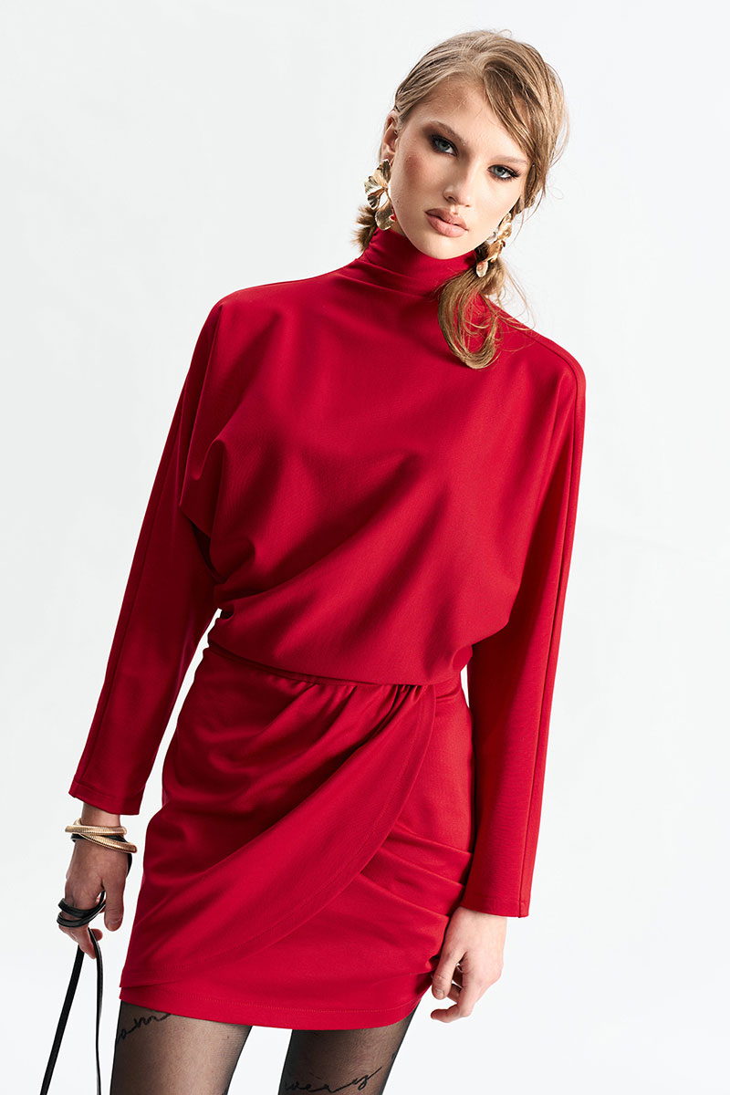 Платье длиной мини, отрезное по линии талии, с цельнокроеным рукавом. Верхняя часть платья объемная, нижняя часть прилегающего силуэта. По линии талии в шов притачивания вставлена эластичная лента. Рукав длинный, зауженный к низу.
