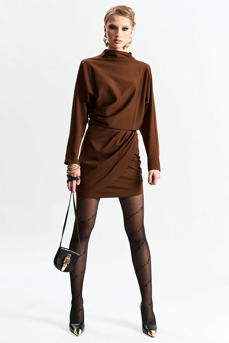 Платье длиной мини, отрезное по линии талии, с цельнокроеным рукавом. Верхняя часть платья объемная, нижняя часть прилегающего силуэта. По линии талии в шов притачивания вставлена эластичная лента. Рукав длинный, зауженный к низу.