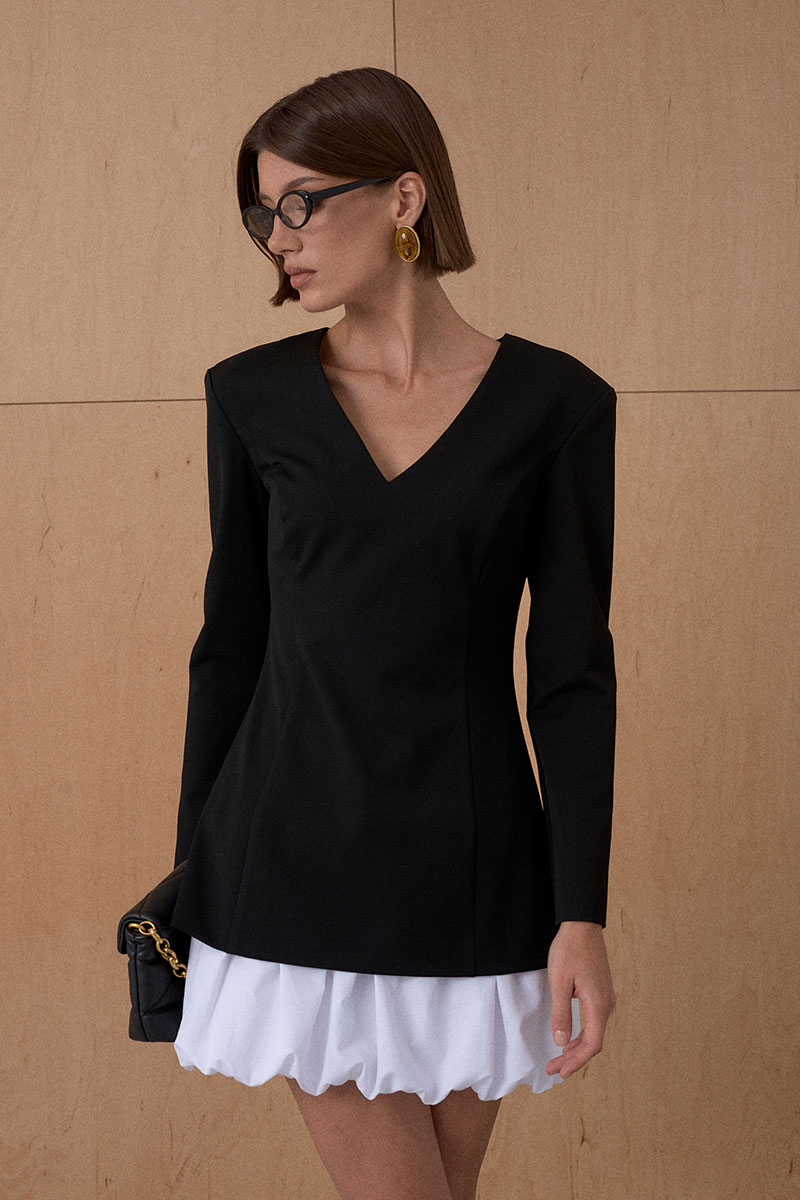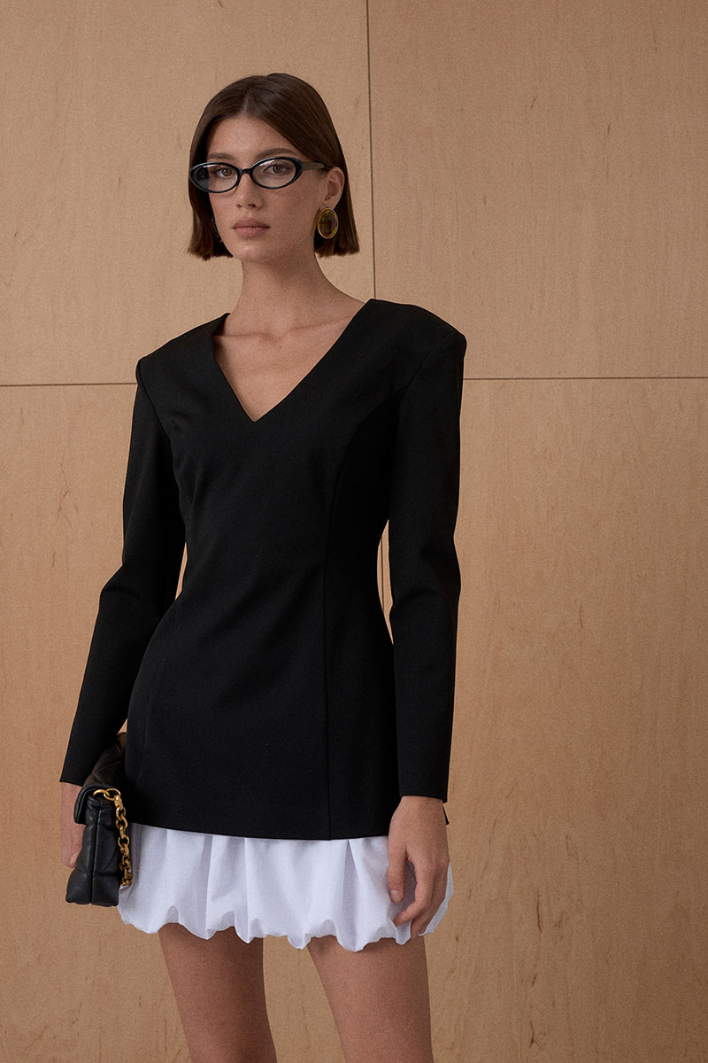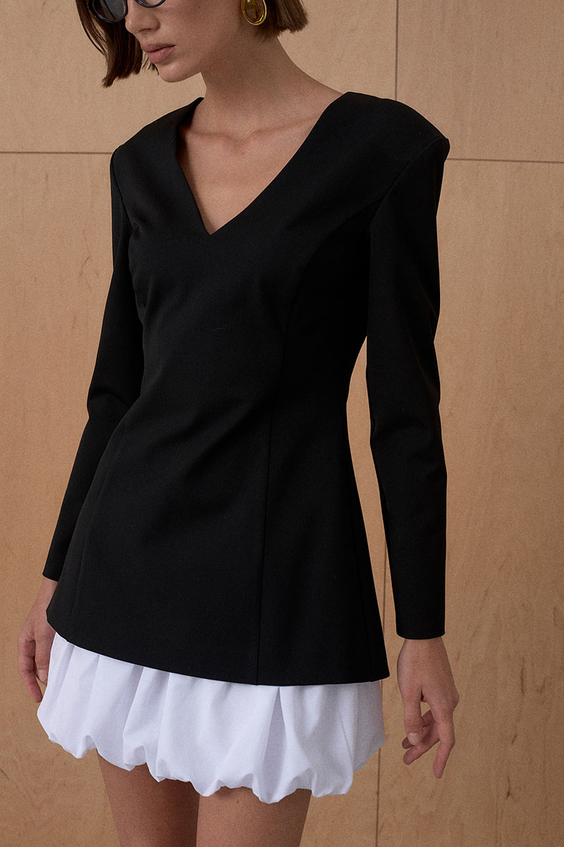 Платье из формообразующей костюмной ткани. Усиленная и расширенная линия плеча. Подъюбник из хлопкового полотна.