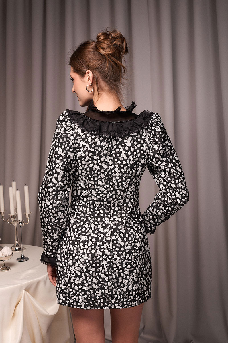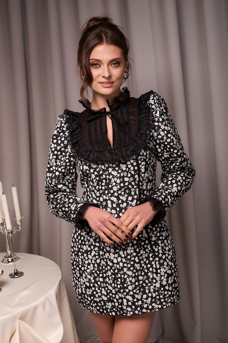 Платье из благородного жаккарда в мелкий стильзованный цветок. Лиф декорирован вискозной тканью, тесьмой и рюшами. Молния в боковом шве.